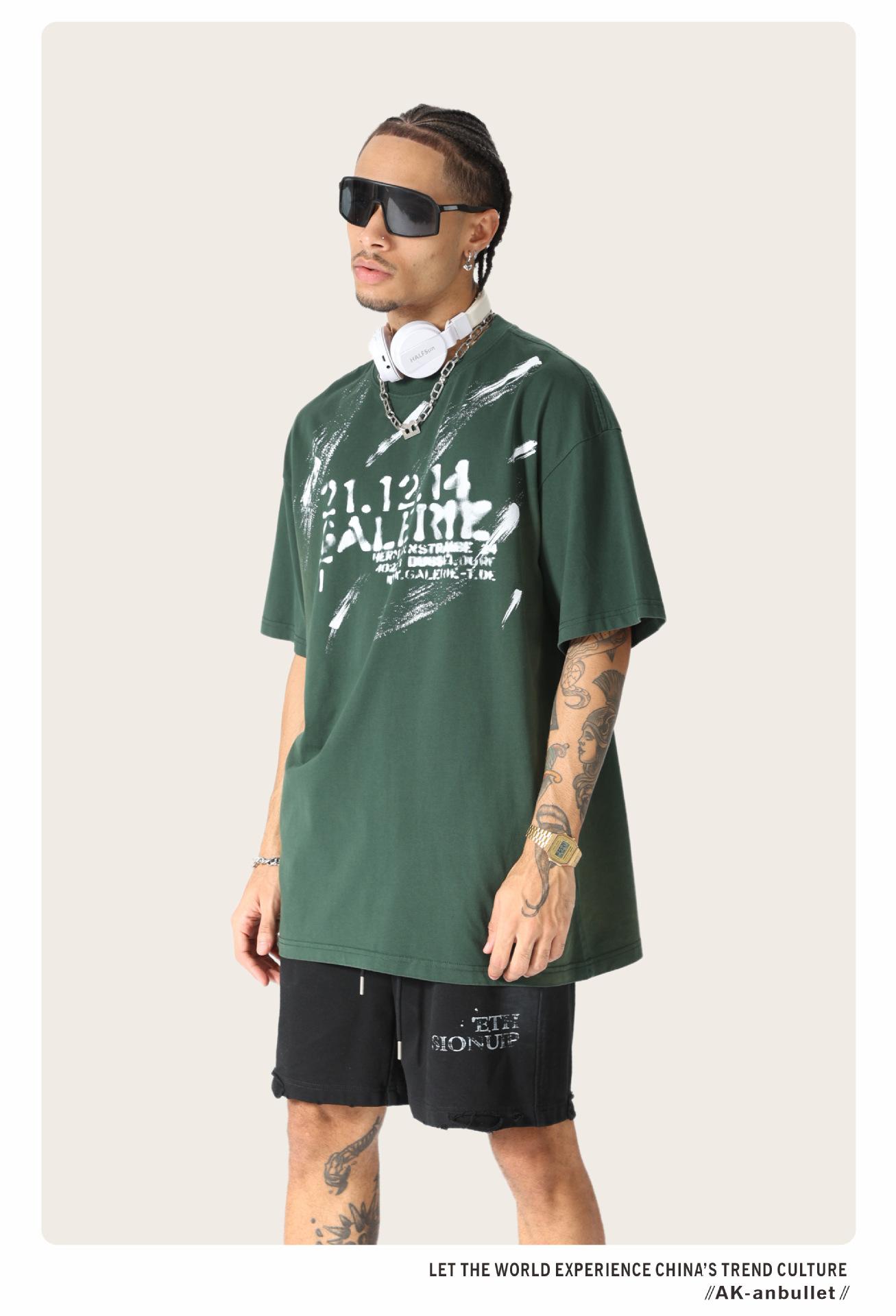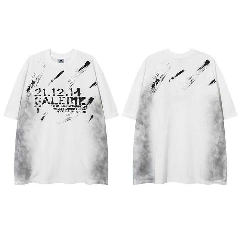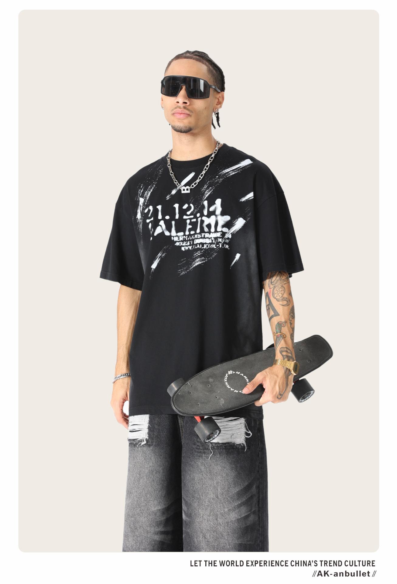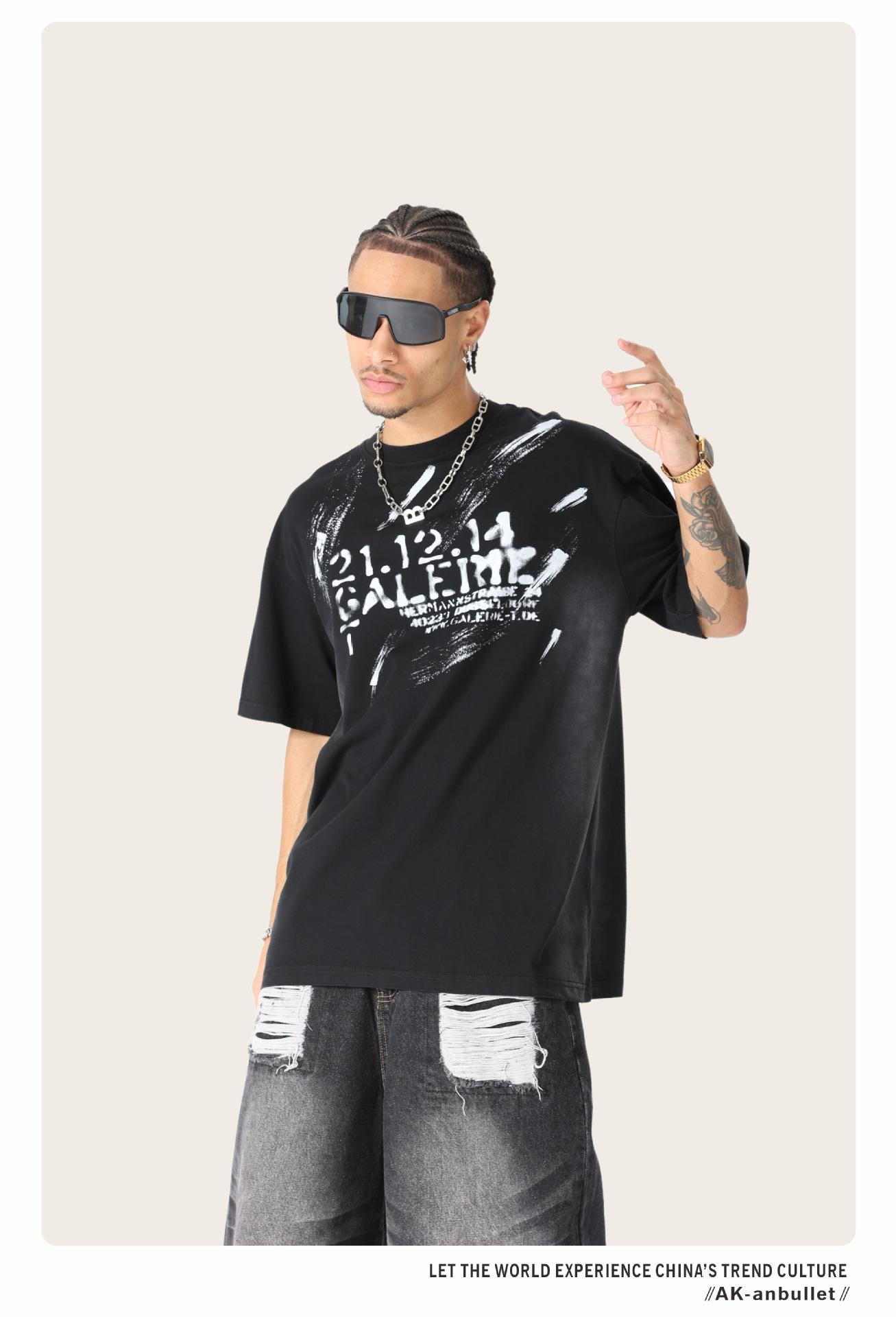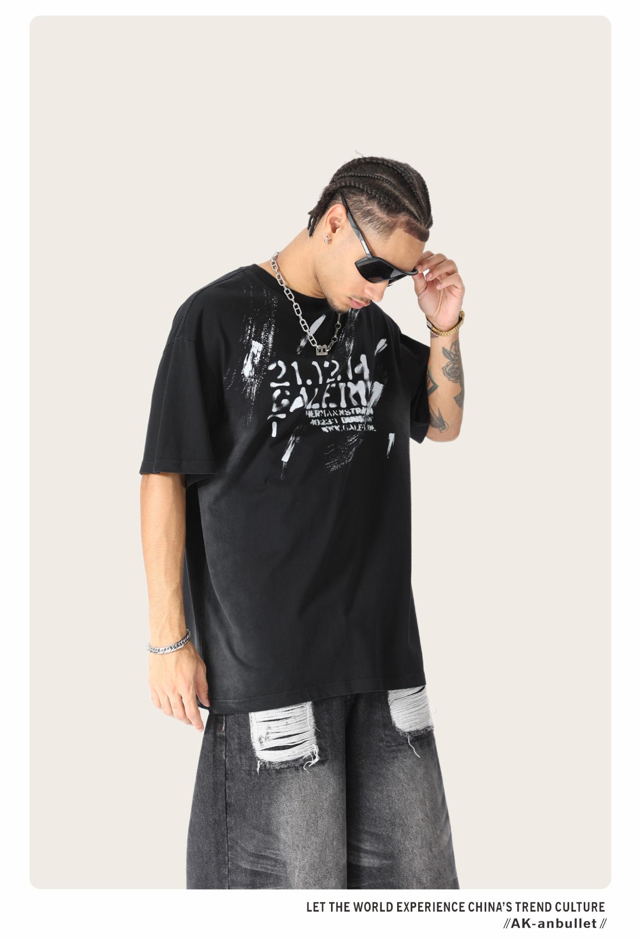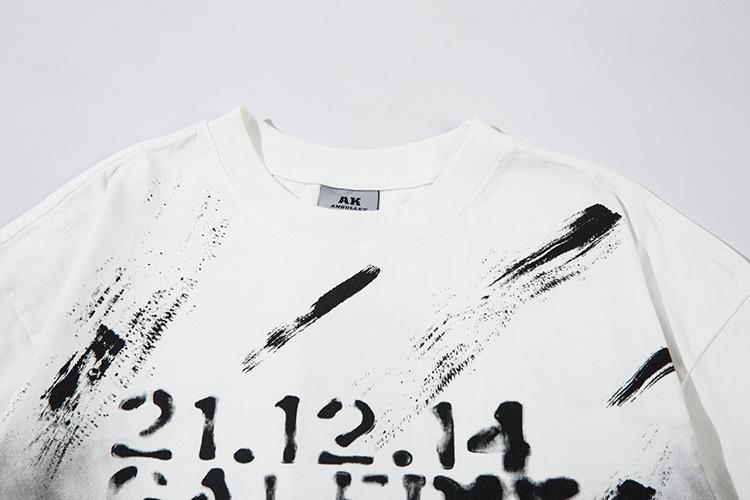 Camiseta lavada de manga corta de algodón puro de verano para hombre de AK, estilo americano, moderna, holgada, de media manga, con estampado de aerosol Maliu