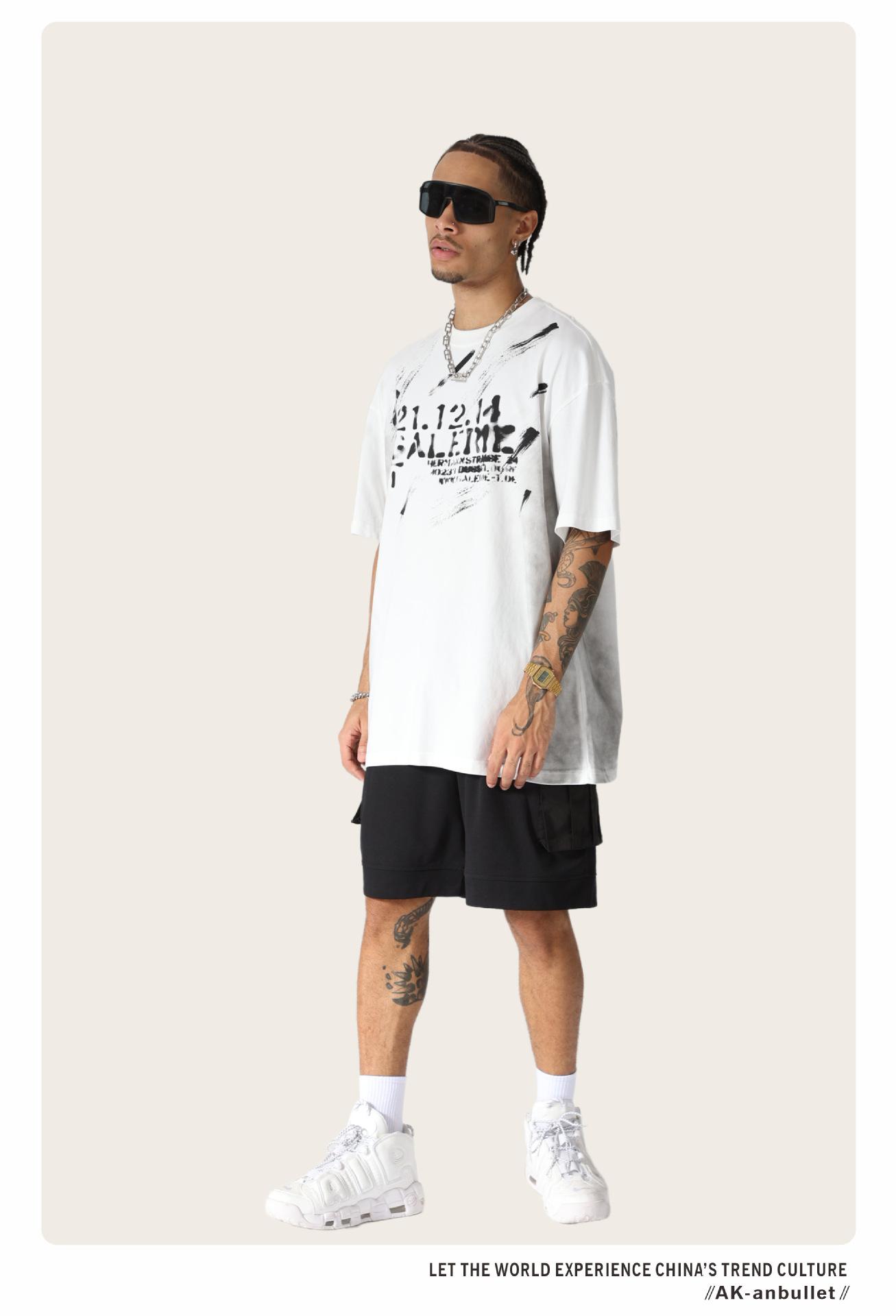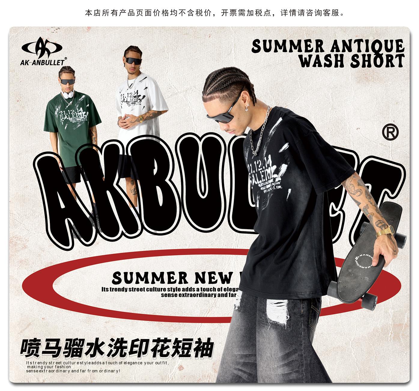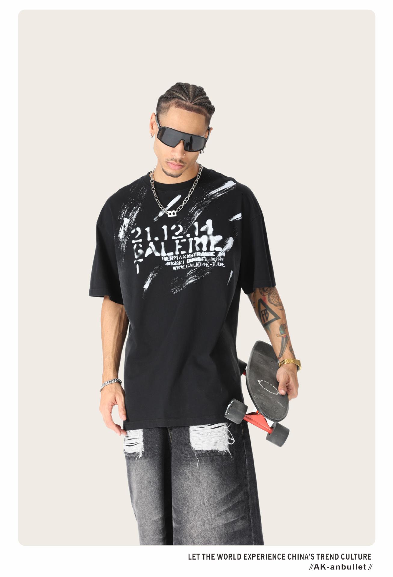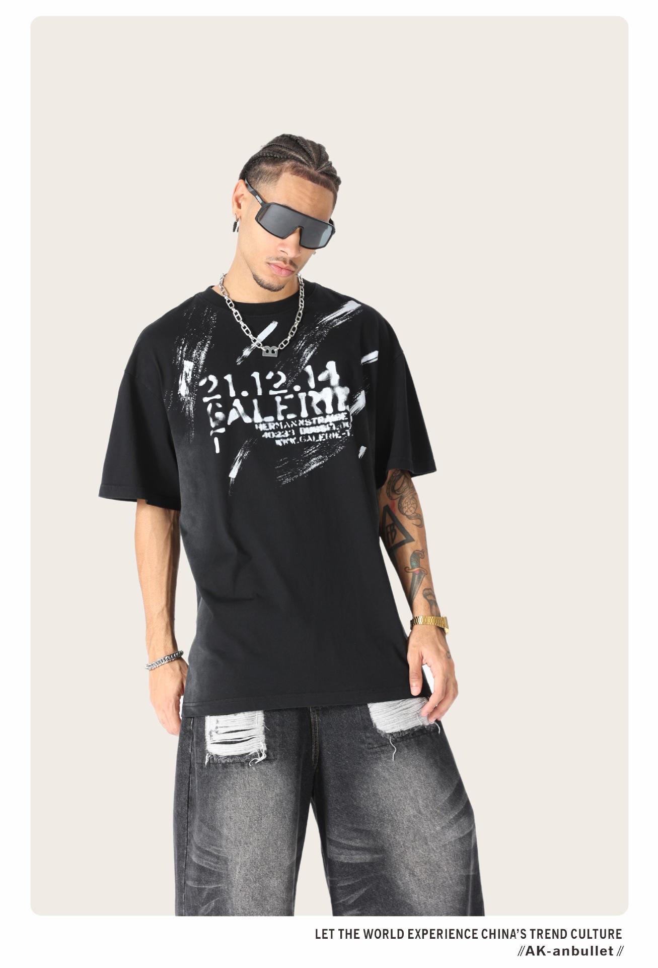 Camiseta lavada de manga corta de algodón puro de verano para hombre de AK, estilo americano, moderna, holgada, de media manga, con estampado de aerosol Maliu