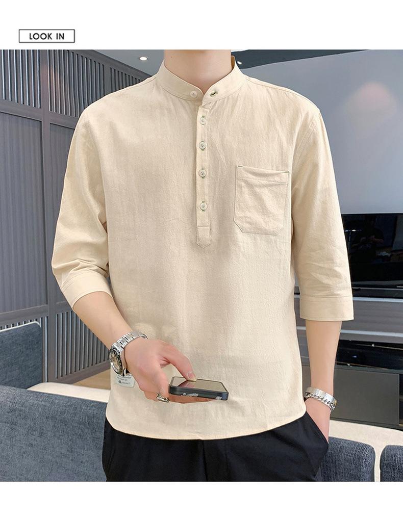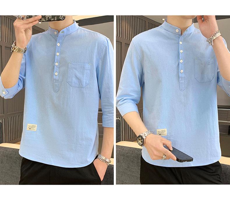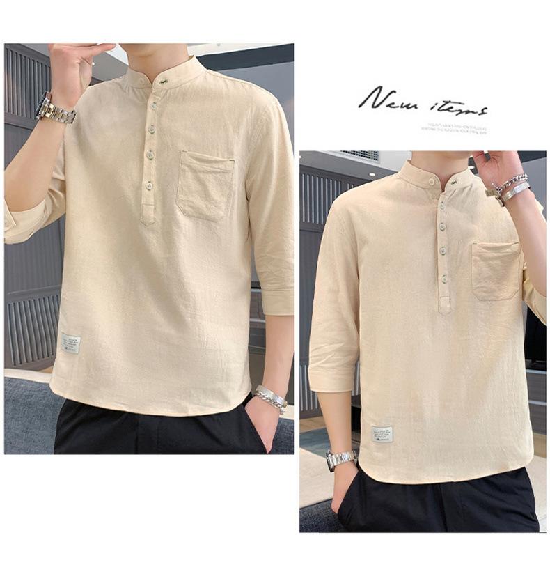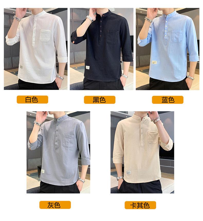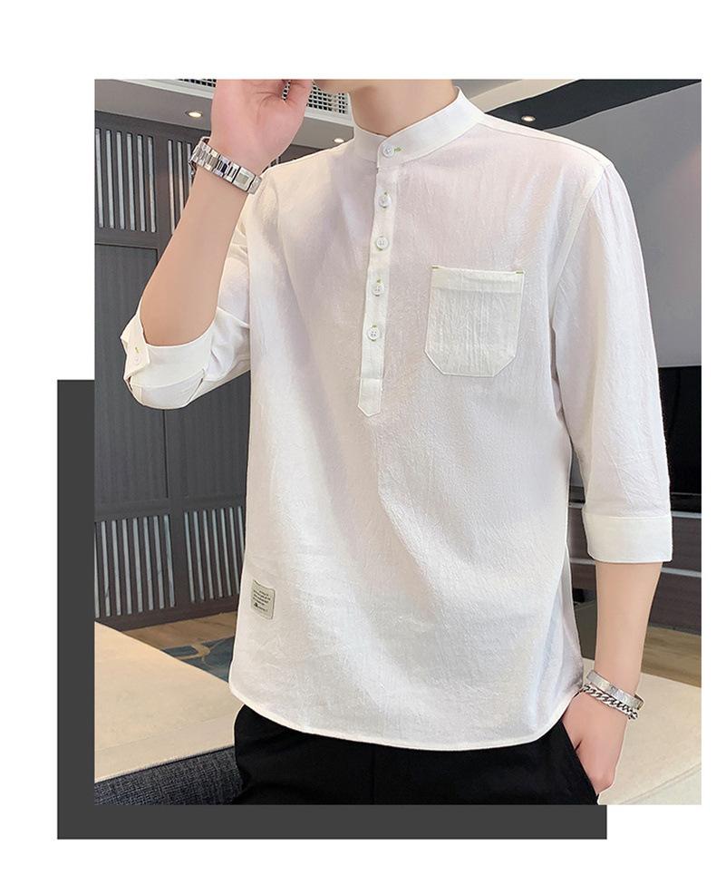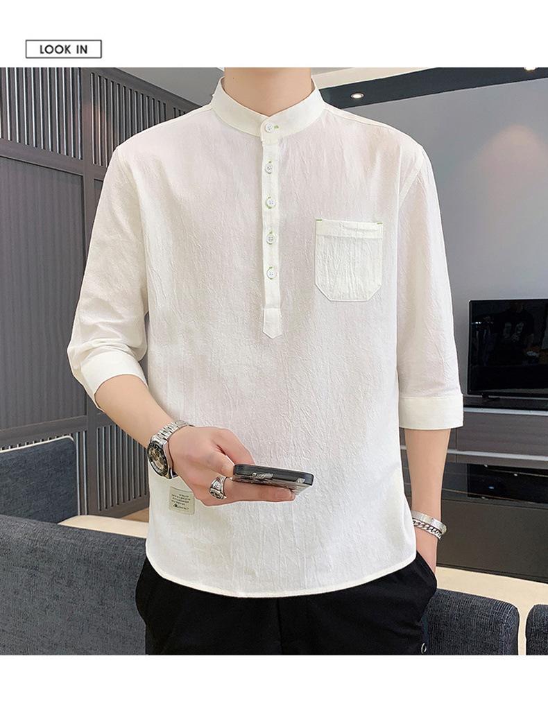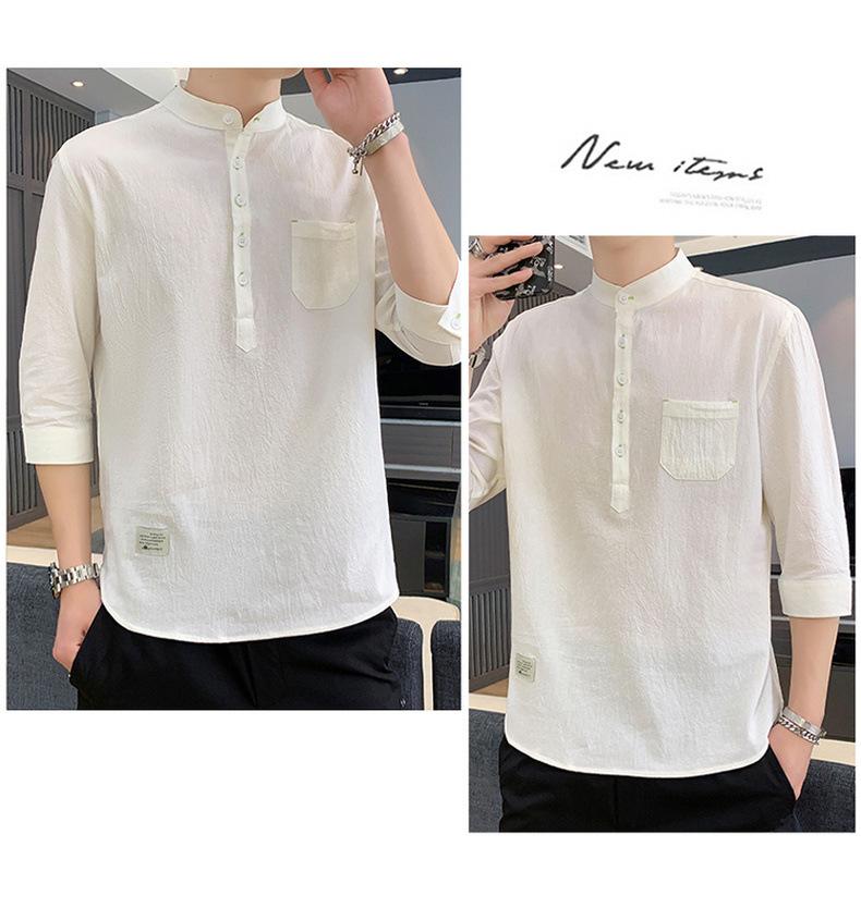 Camisa de cuello alto para hombre, de verano, de manga corta, transpirable, fina, de algodón y lino, de manga tres cuartos, blanca, holgada.