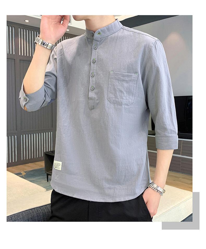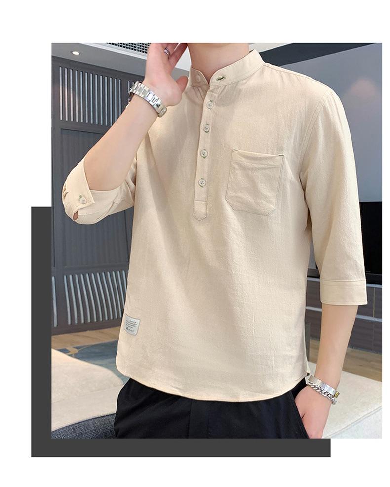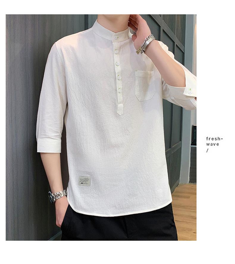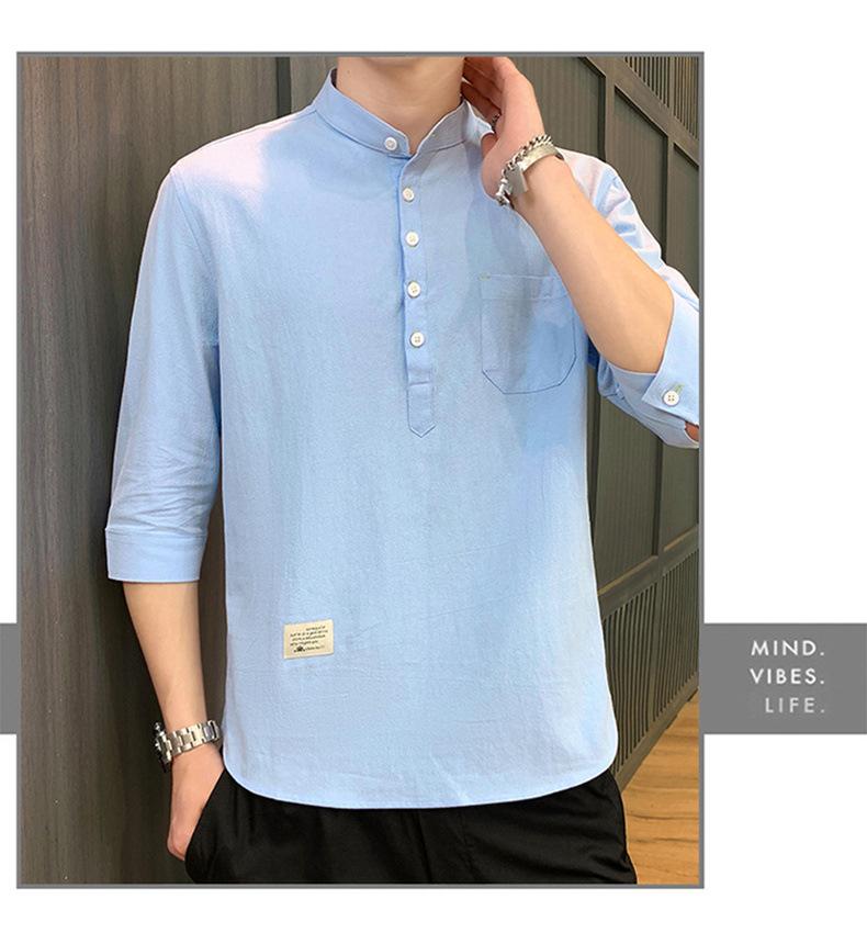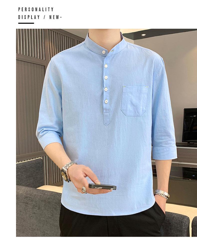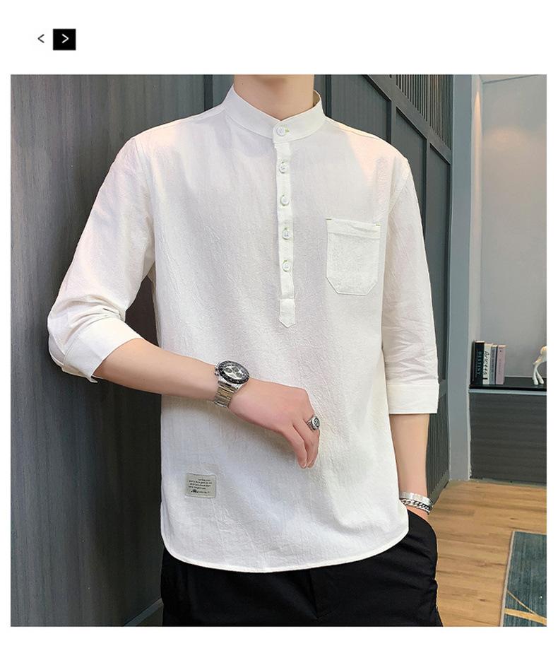 Camisa de cuello alto para hombre, de verano, de manga corta, transpirable, fina, de algodón y lino, de manga tres cuartos, blanca, holgada.