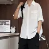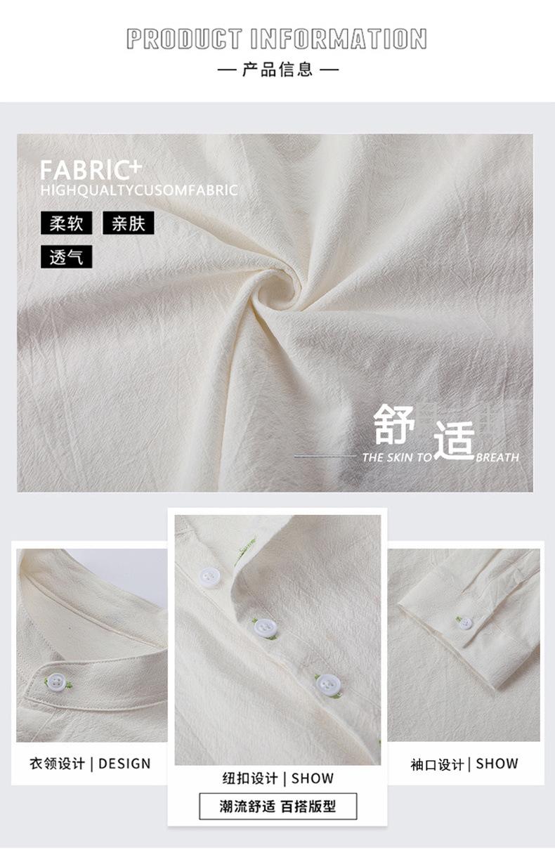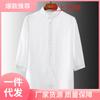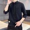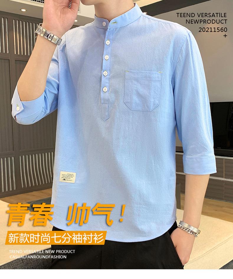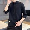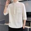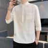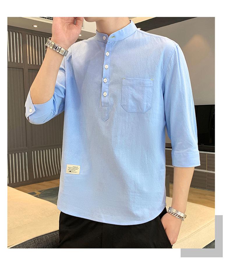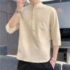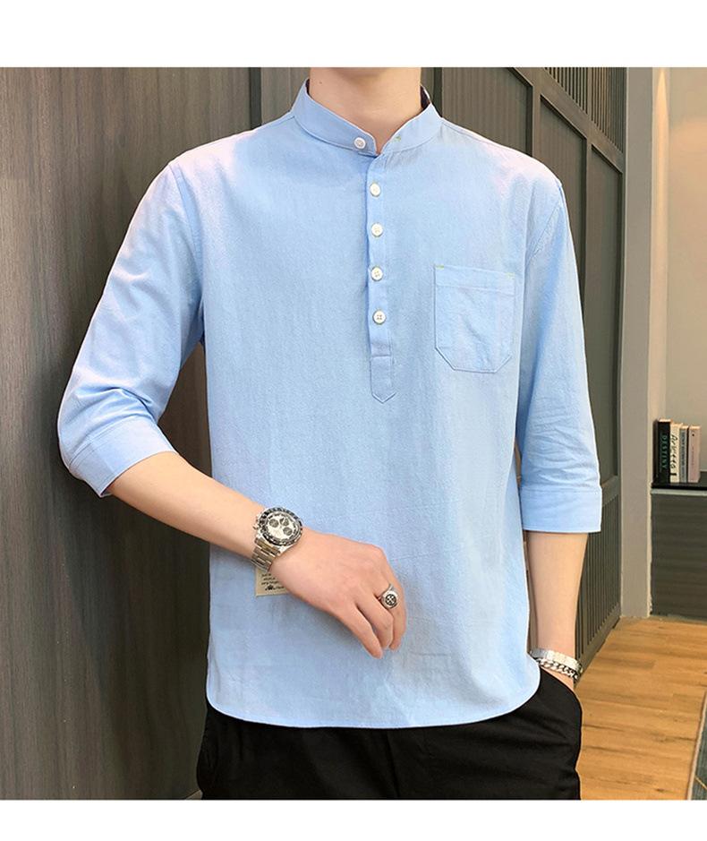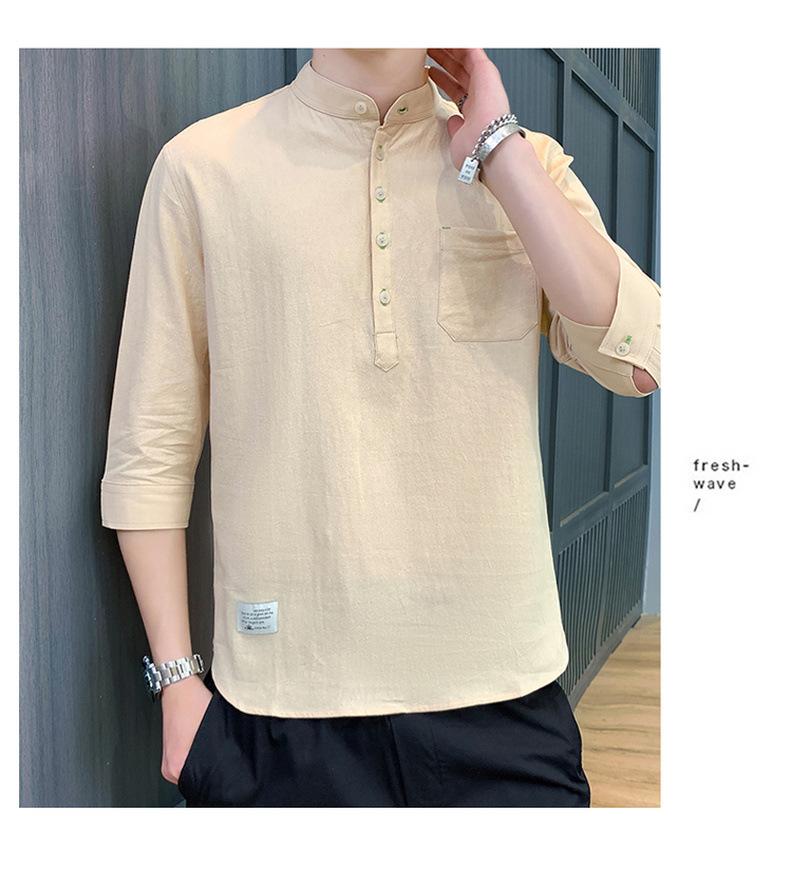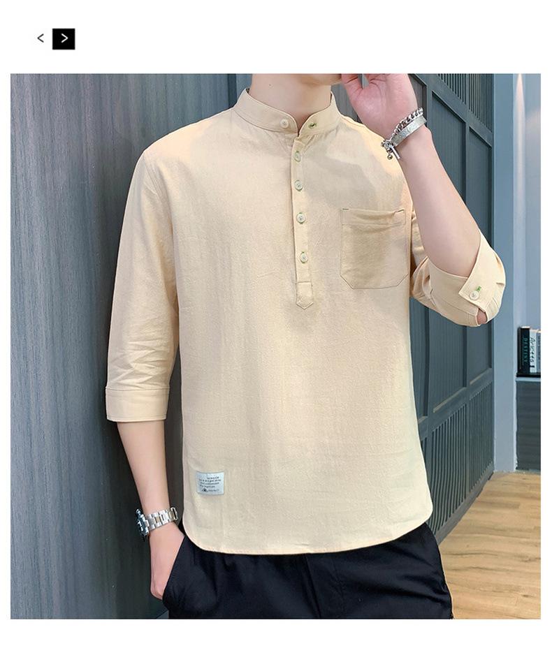 Camisa de cuello alto para hombre, de verano, de manga corta, transpirable, fina, de algodón y lino, de manga tres cuartos, blanca, holgada.