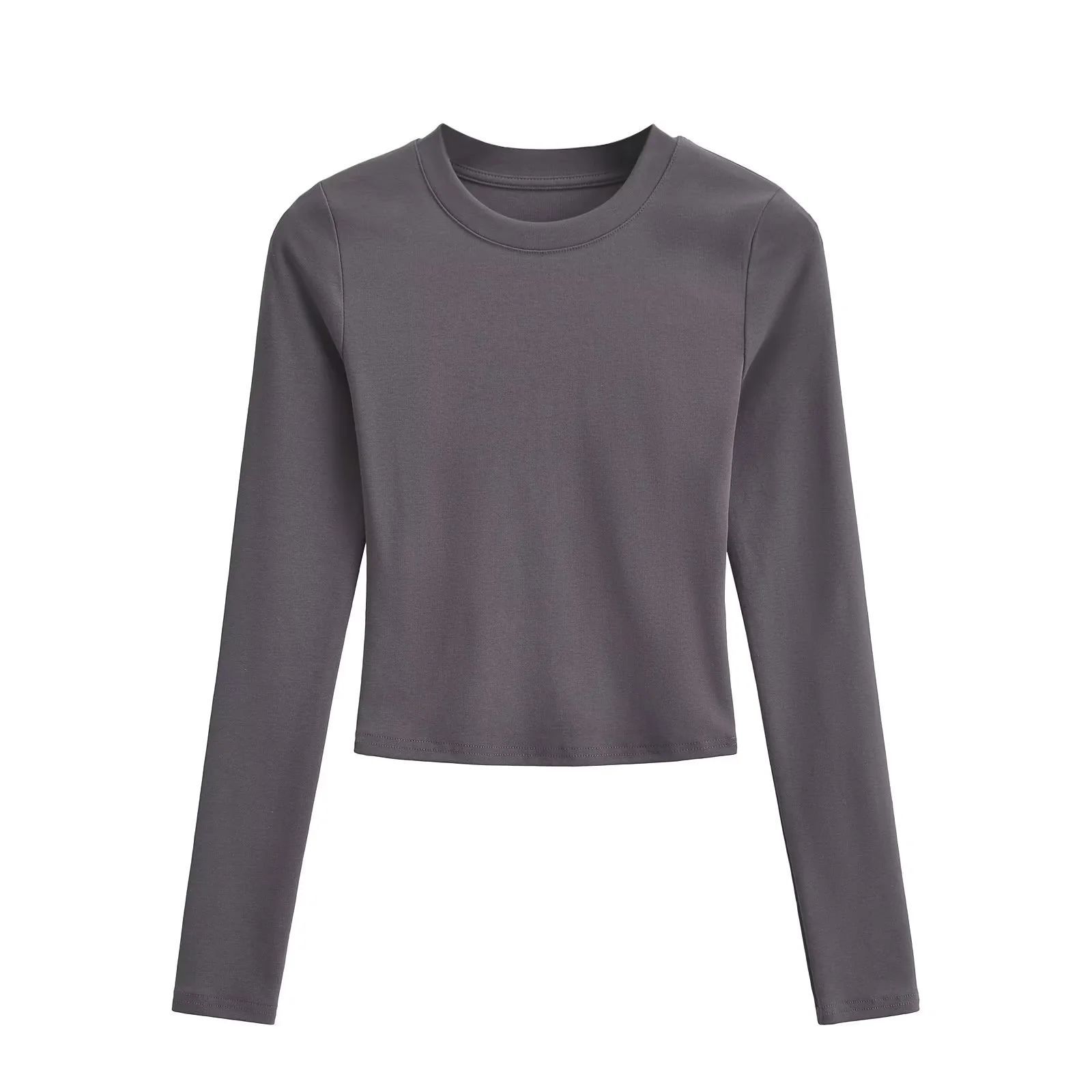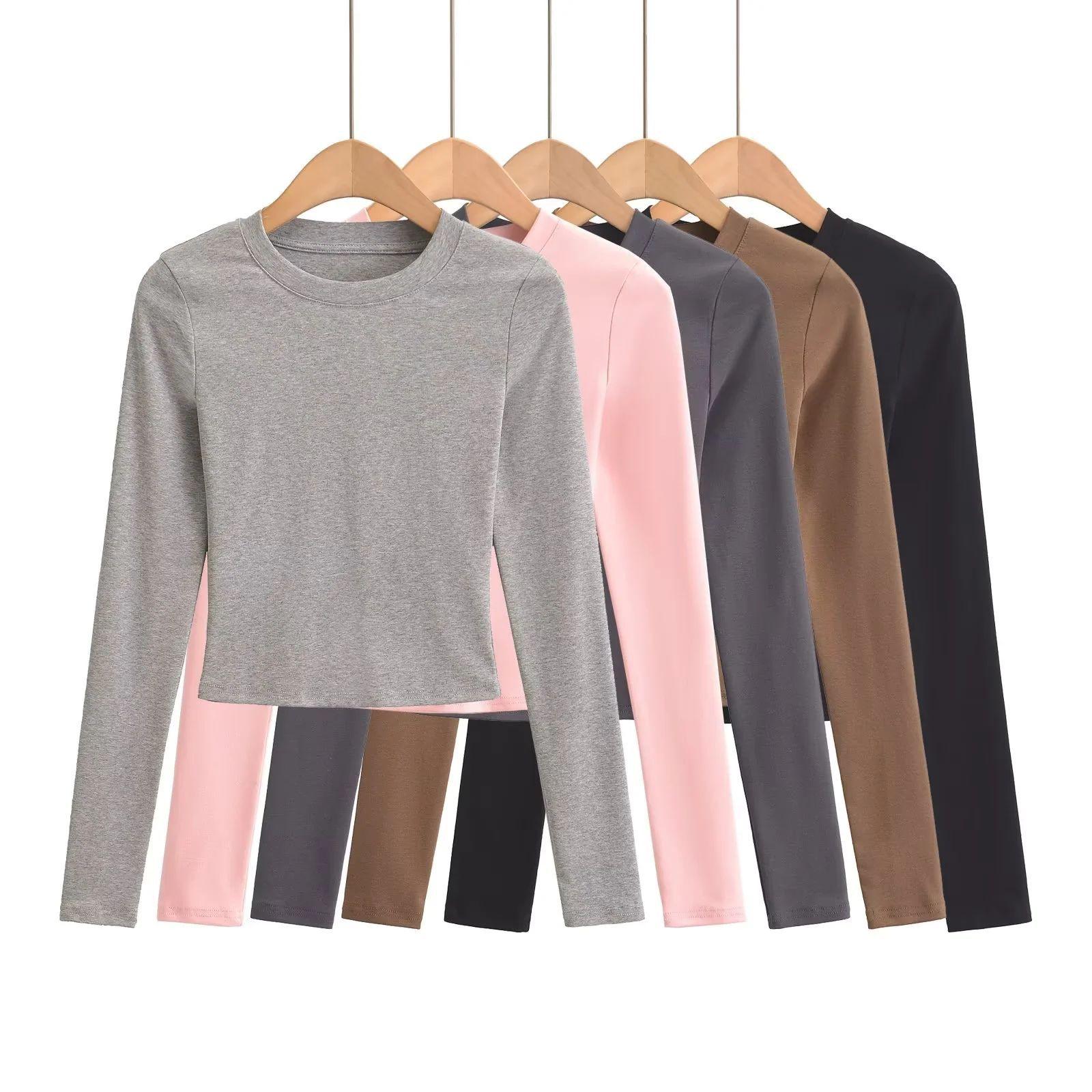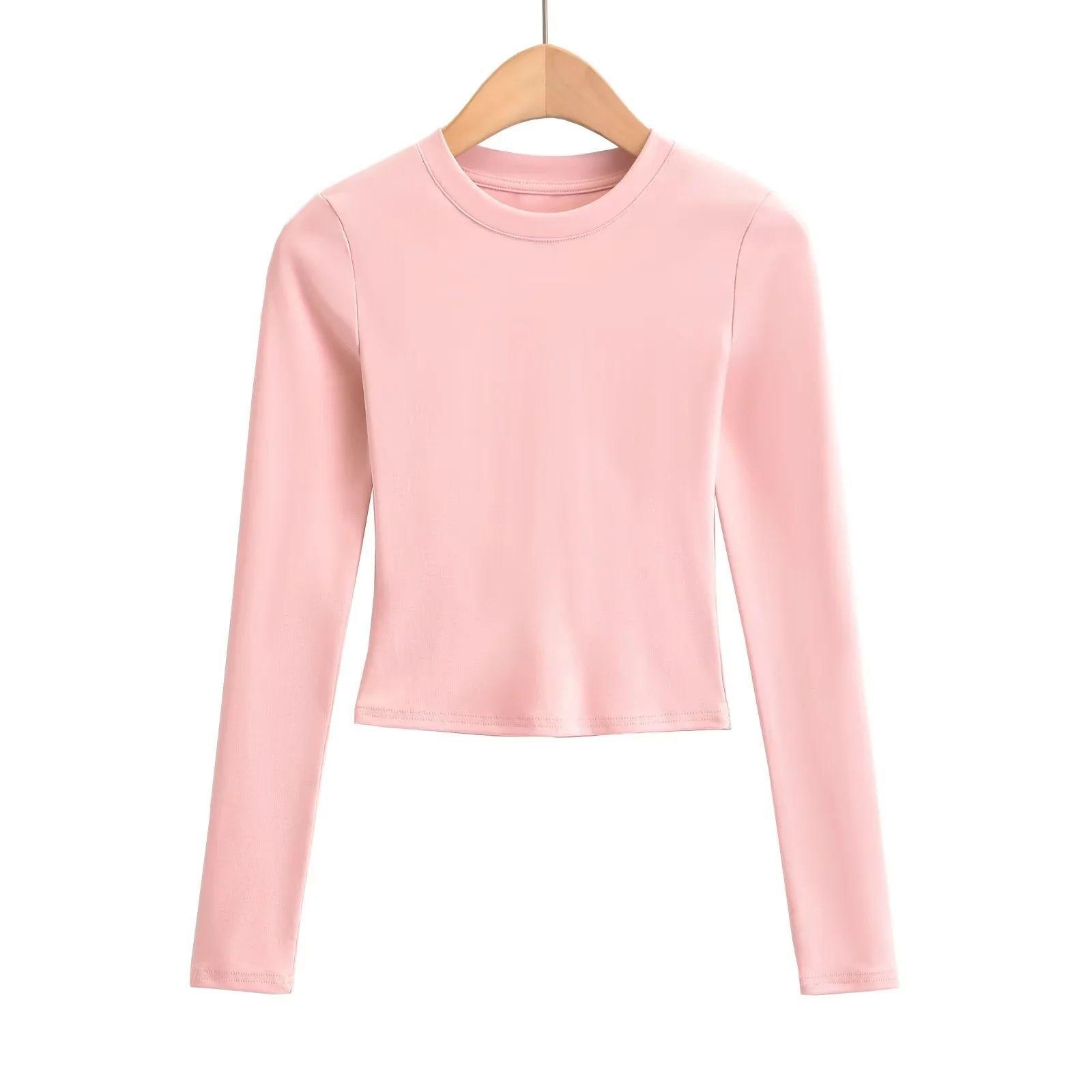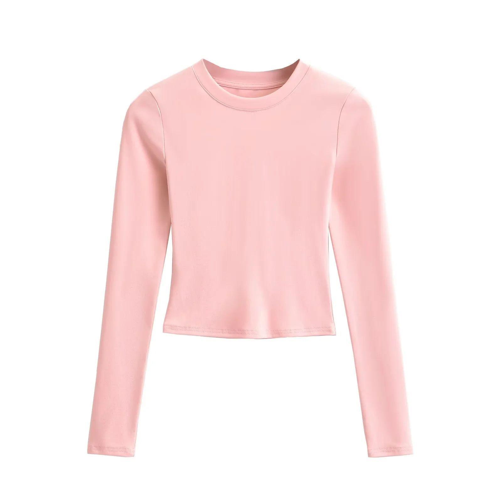 Camiseta básica de color liso con cuello redondo y manga larga para mujer, otoño 2024, estilo americano, estilo Spice Girl, corte entallado interior.