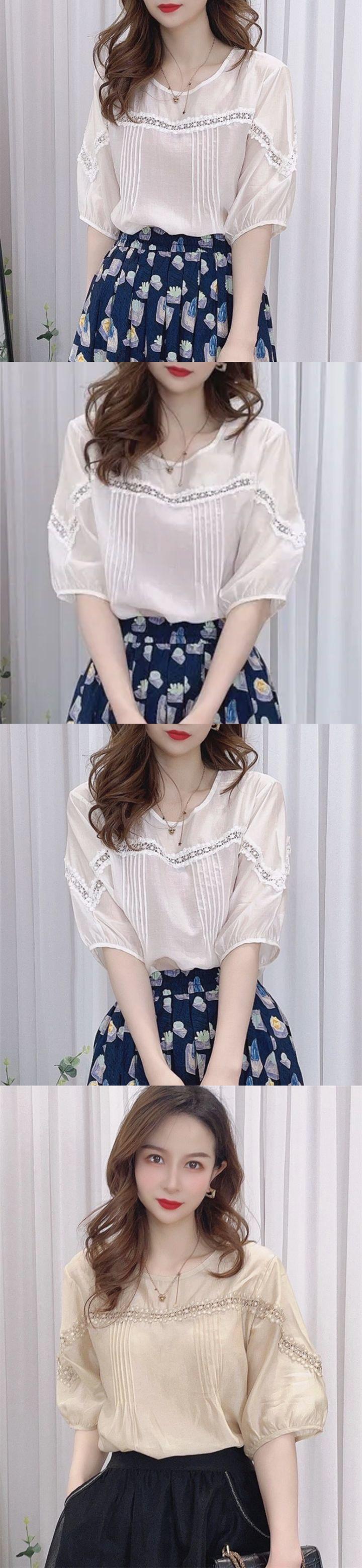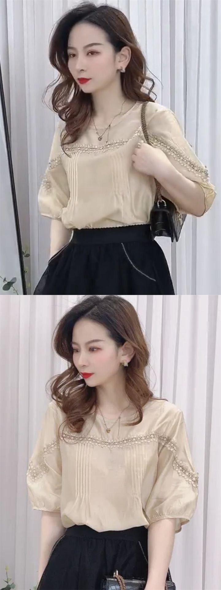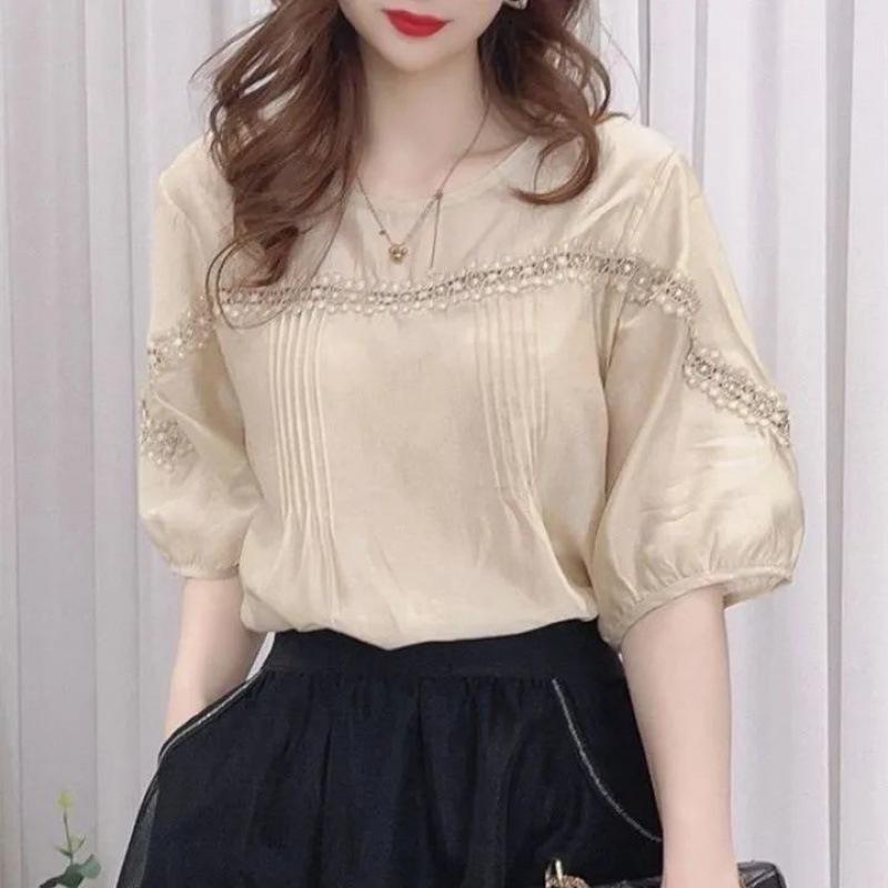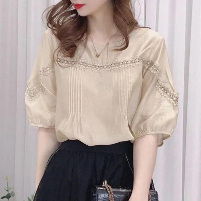 Camisa de gasa de media manga con empalme de encaje retro estilo Hong Kong para mujer, nuevo estilo de verano 2024, aspecto francés holgado y adelgazante, top de alta gama a la moda