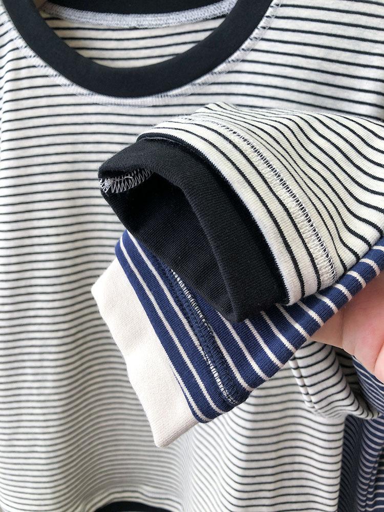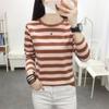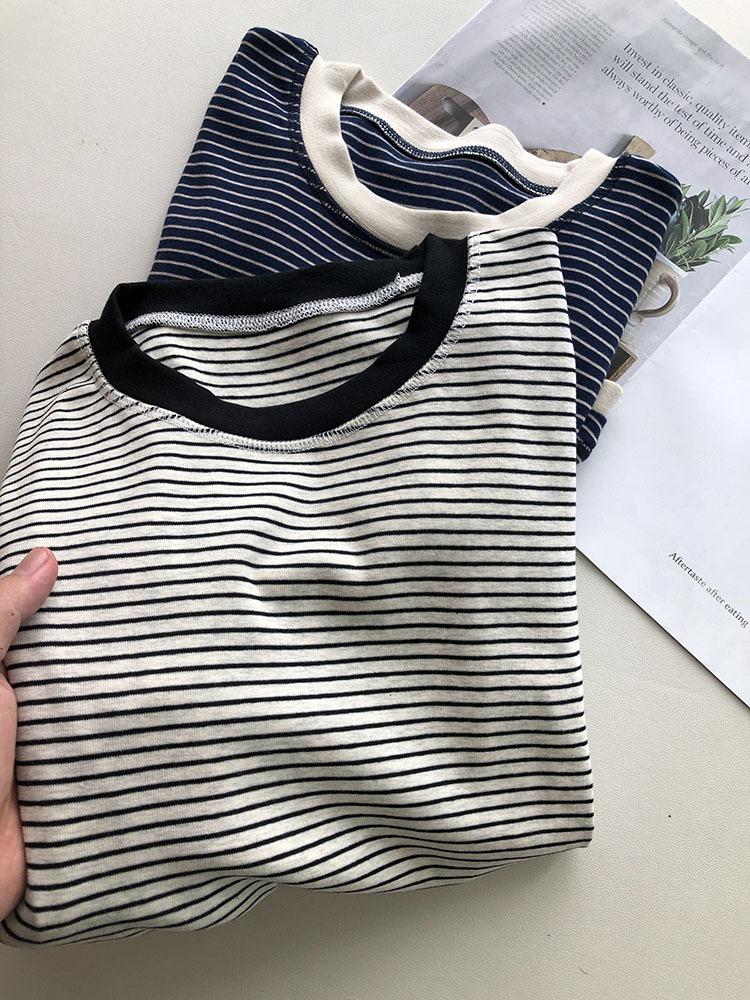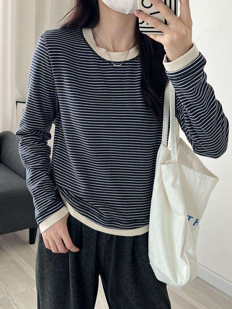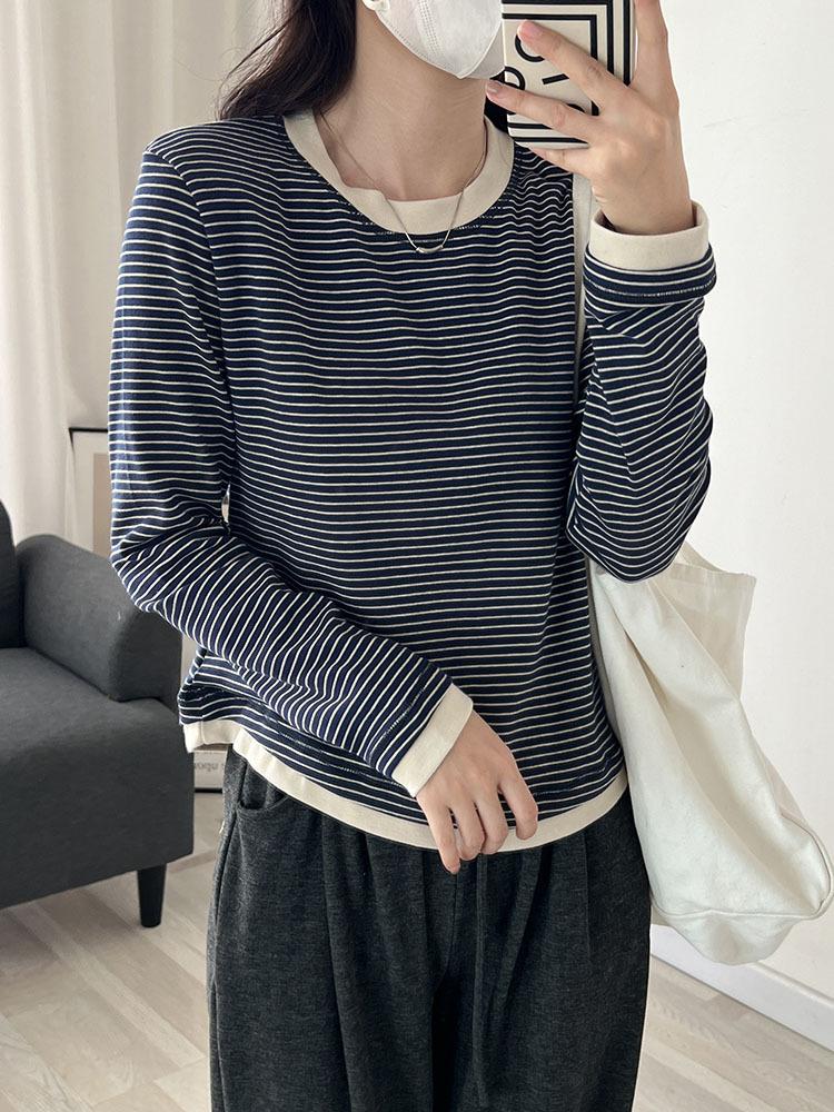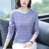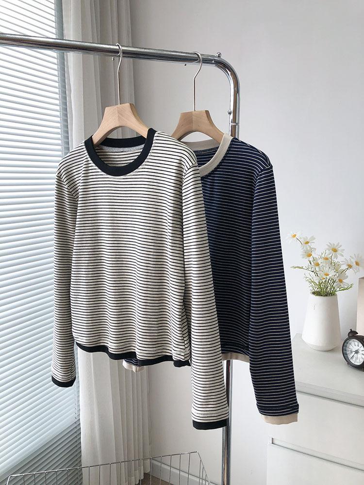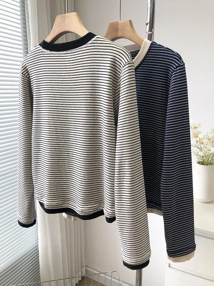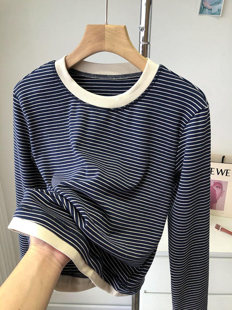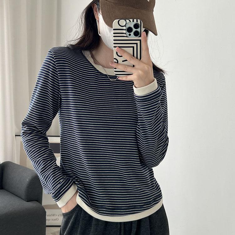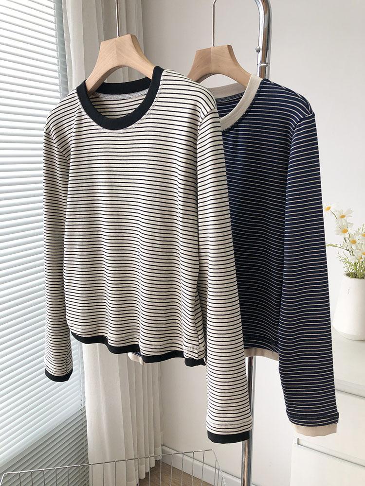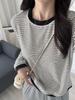 Camiseta de manga larga de algodón con contraste de rayas vintage de talla grande para mujer, otoño e invierno, nueva camisa adelgazante de corte entallado para chica gordita