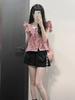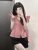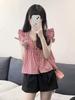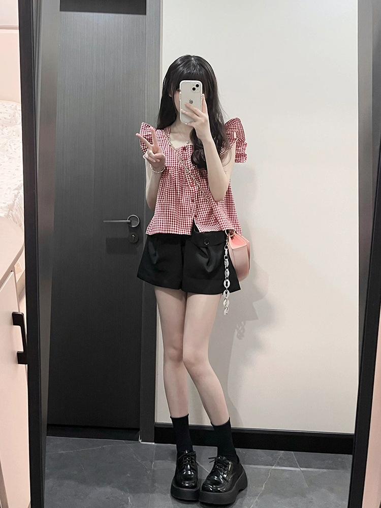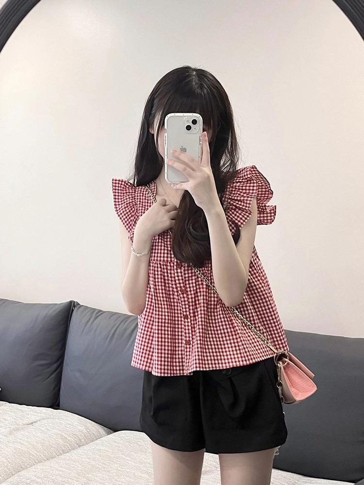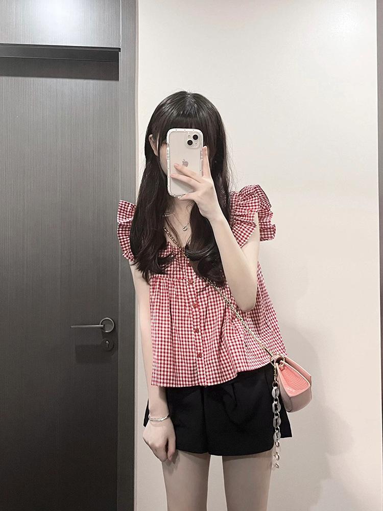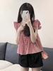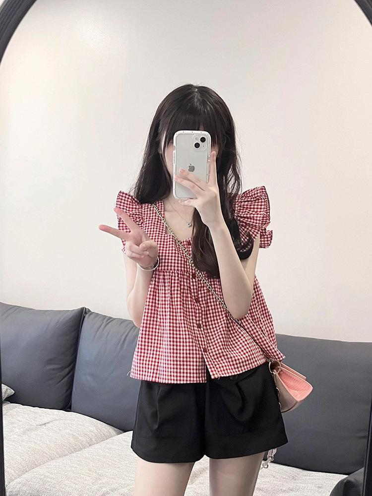 Camisa de cuello cuadrado a cuadros rojos para mujer, diseño de nicho, blusa holgada de manga corta con vuelo, de moda de verano