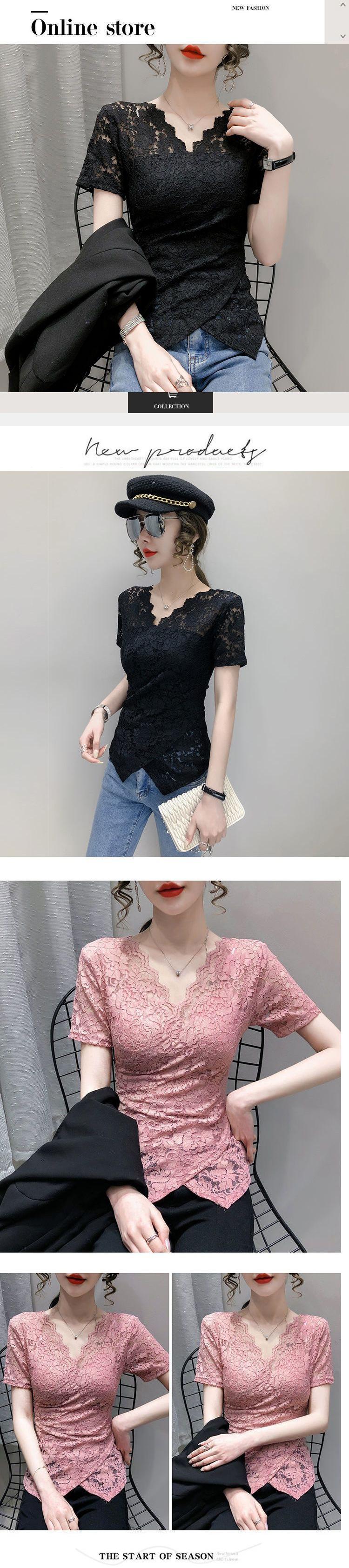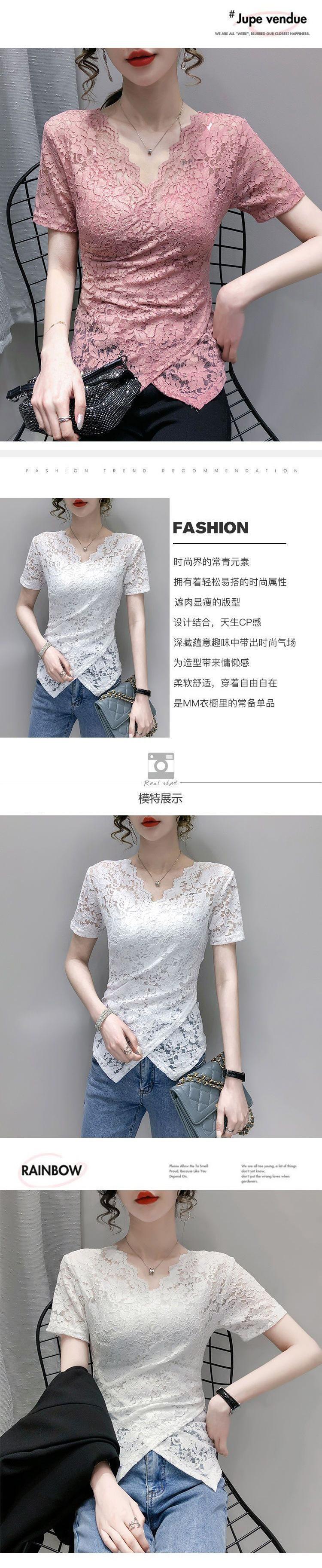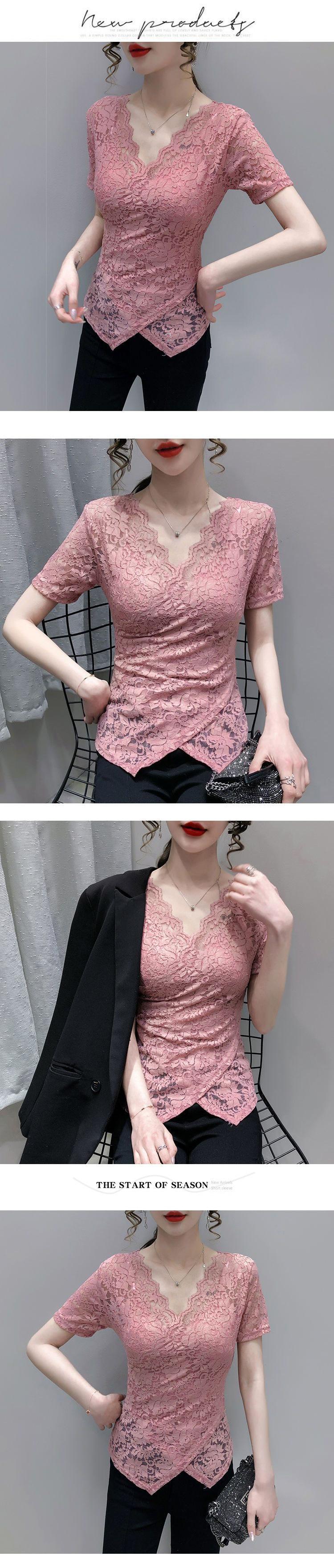 Compra Nuevo estilo de verano 2024, top femenino de encaje asimétrico con abertura y escote en V, versátil, de manga corta y moderno al por mayor en Joom.pro