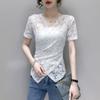 Nuevo estilo de verano 2024, top femenino de encaje asimétrico con abertura y escote en V, versátil, de manga corta y moderno