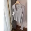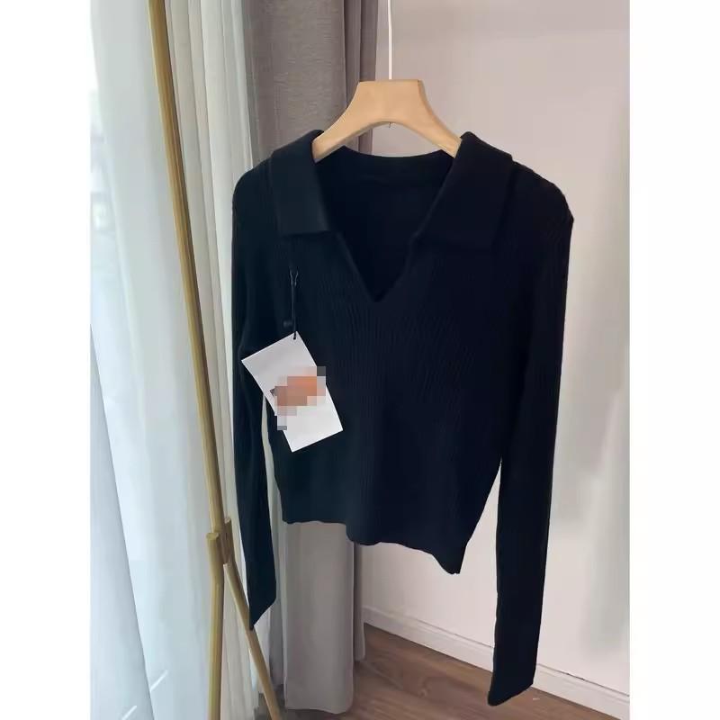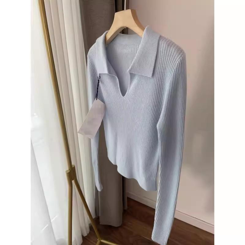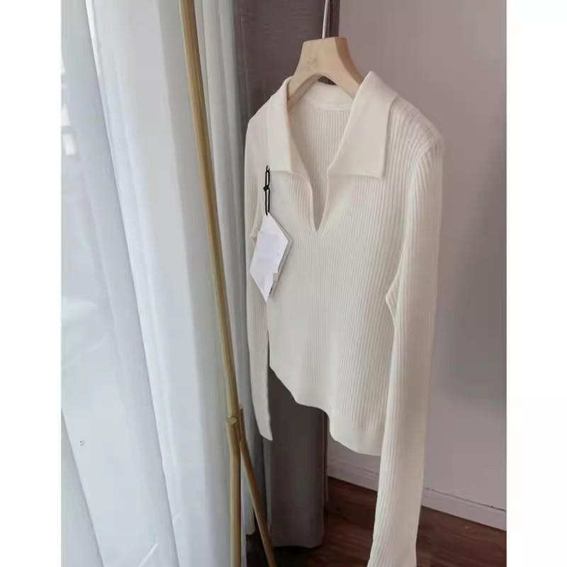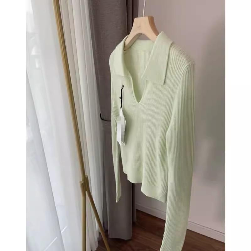 Estilo Francés Elegante Punto Cuello en V Ropa de Punto para Mujer Primavera y Otoño Fino Diseño Tipo Polo Nicho Base Interior Top Corto