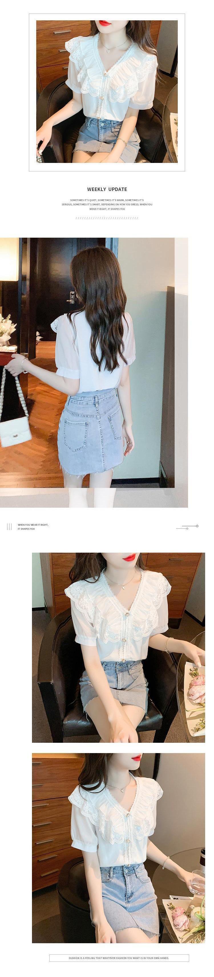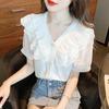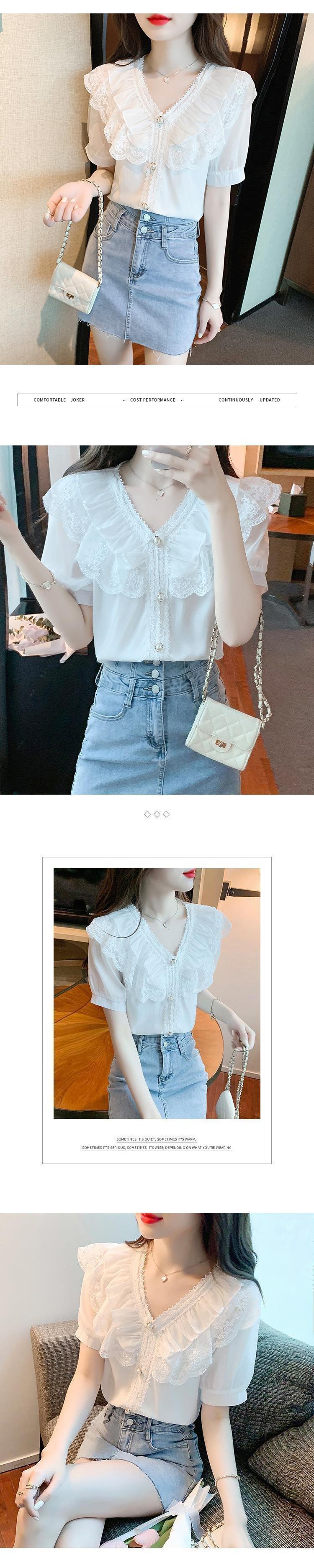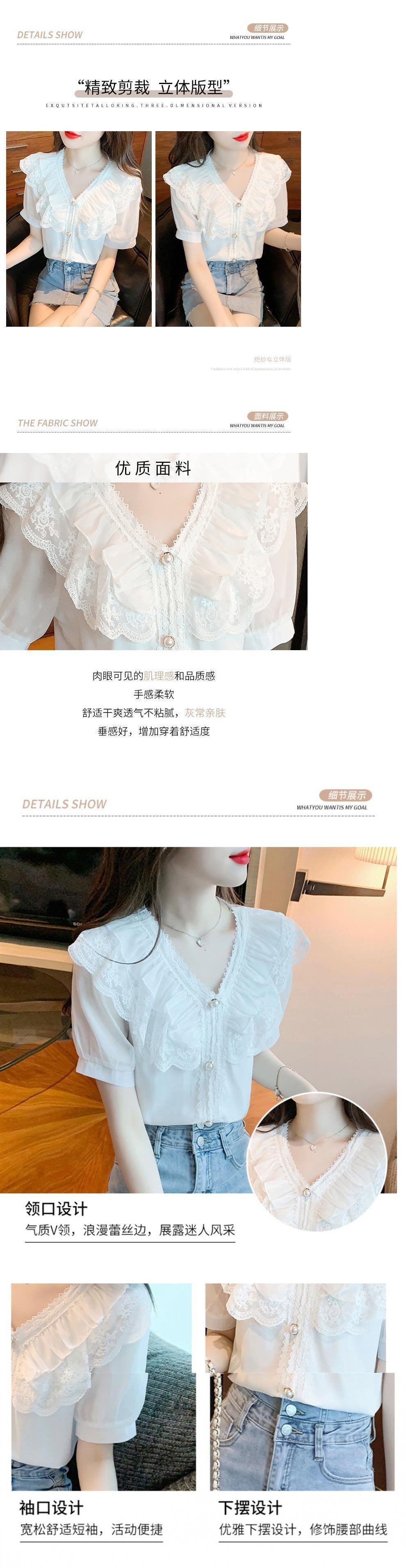Blusa de gasa blanca de manga corta con cuello en V, elegante y de alta calidad, con volantes y encaje, para verano
