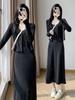 Traje de Falda Otoño Rayado Nuevo Cárdigan de Punto Abrigo Slim Vestido con Tirantes Adelgazante de Cintura