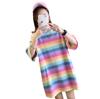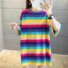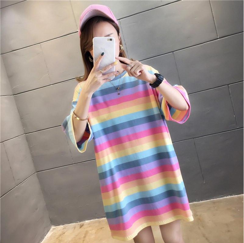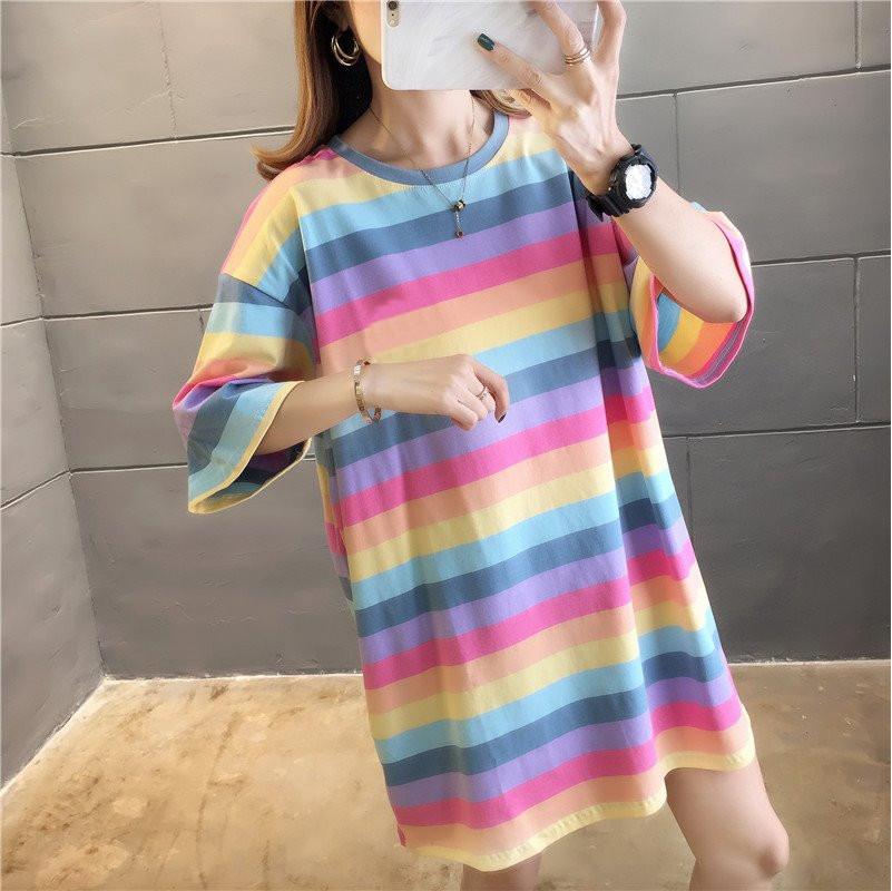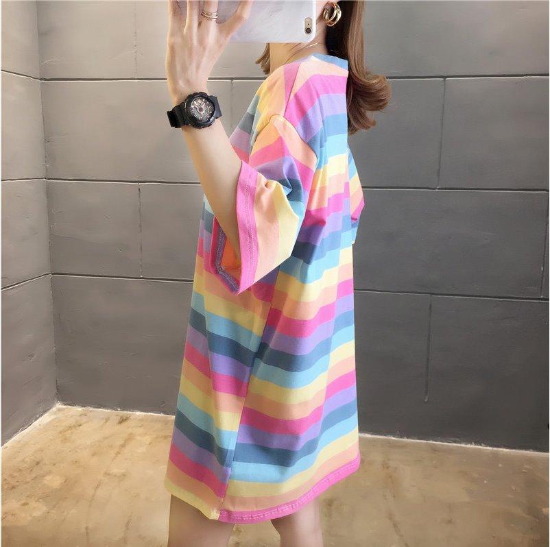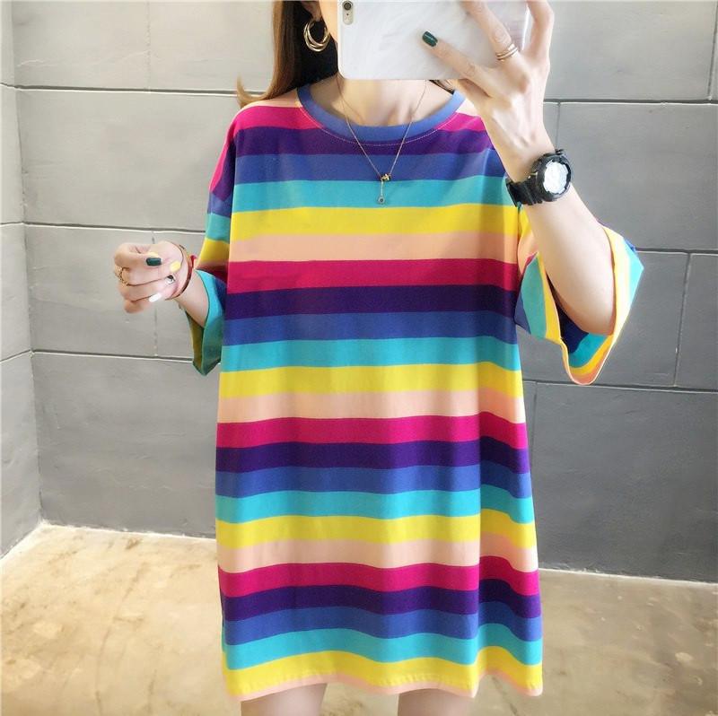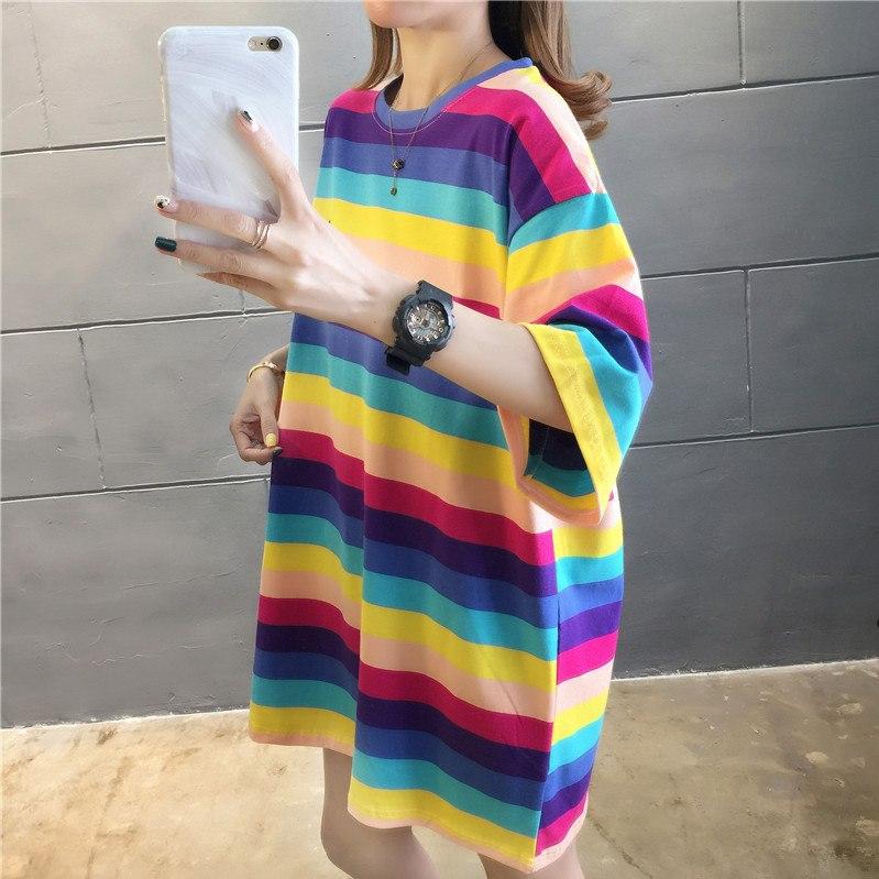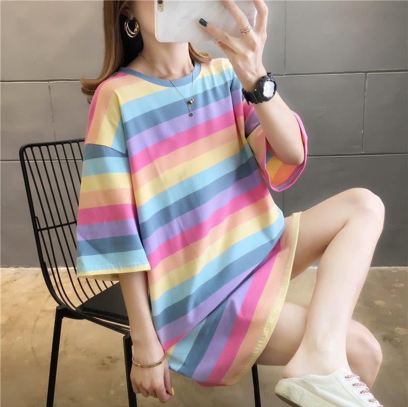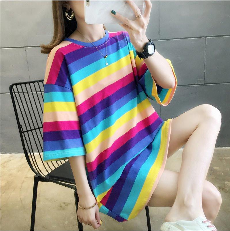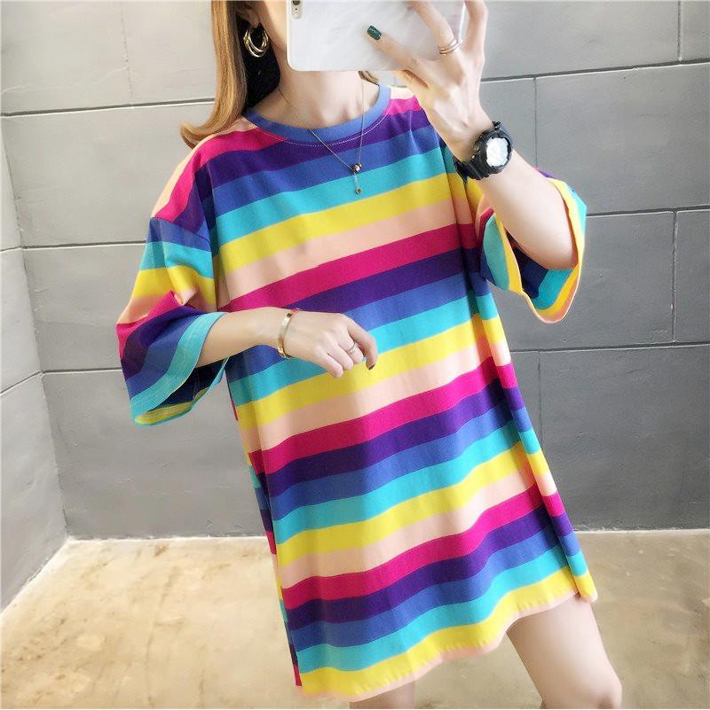 Compra Playera de Manga Corta a Rayas de Arcoíris para Mujer Verano Estilo Coreano Suelta Talla Grande para Mujer Largo Medio Ropa Estilo Hyuna al por mayor en Joom.pro