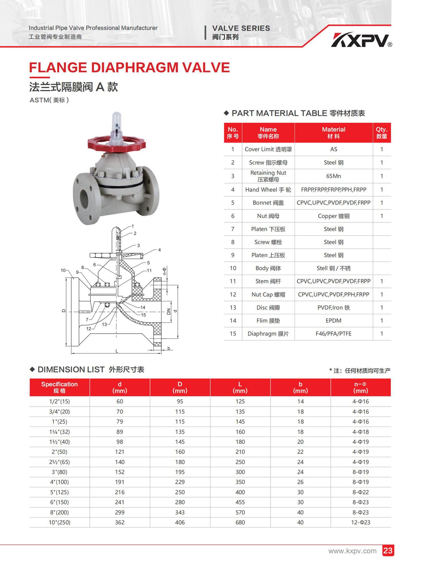 Válvula de diafragma de brida de PVDF Kaixin KXPV en stock, válvula de plástico industrial especial para productos químicos estándar americanos.