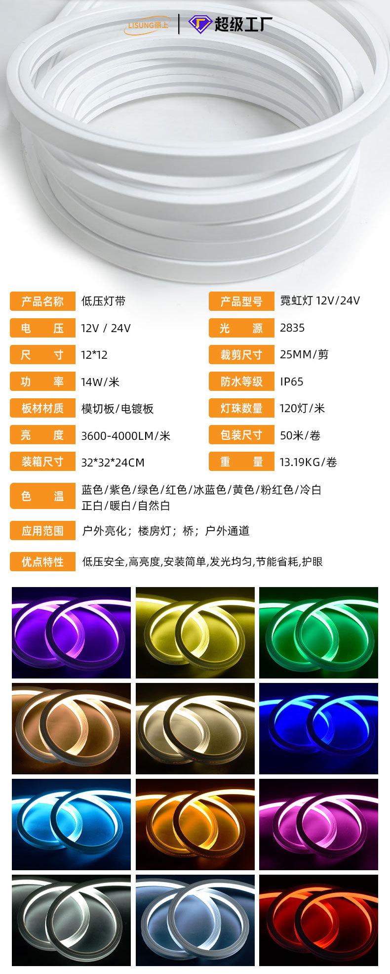Tira de luces LED de neón cuadradas personalizadas de fábrica con 1212 LED de ingeniería en blanco cálido, resistente al agua, de bajo voltaje y 24 V para exteriores.