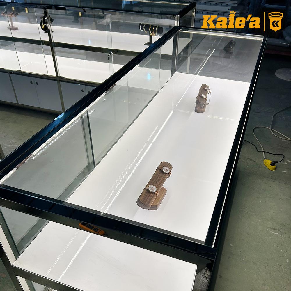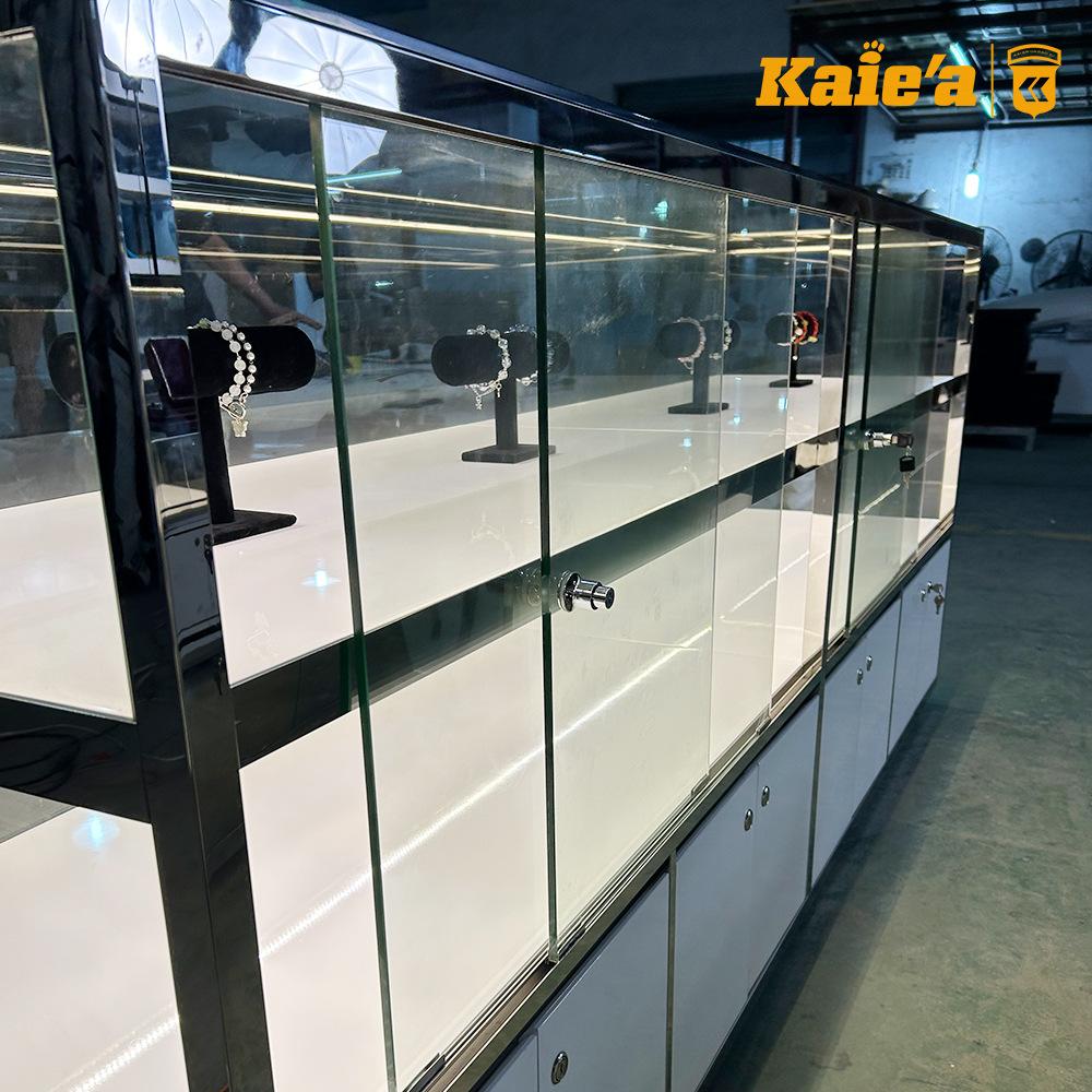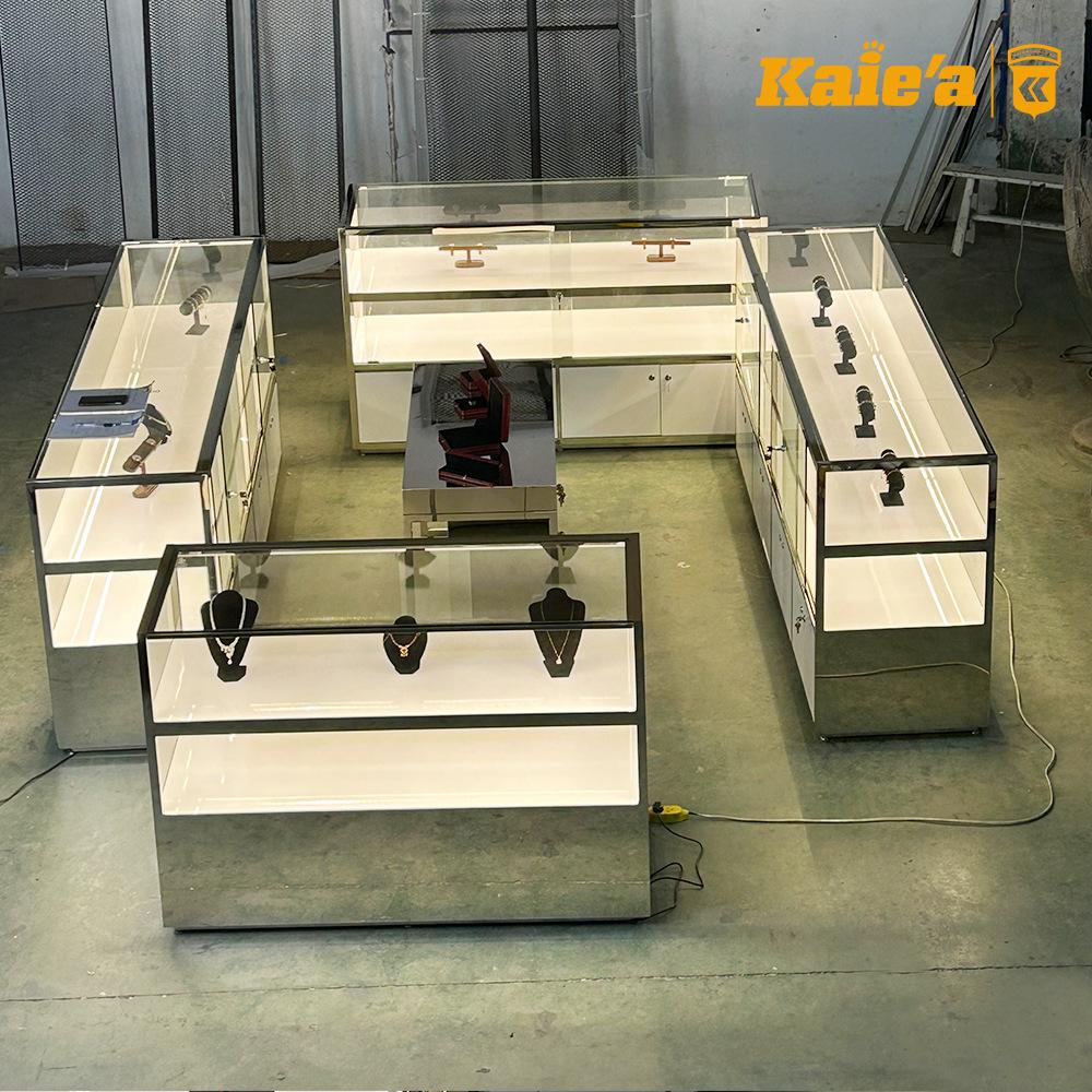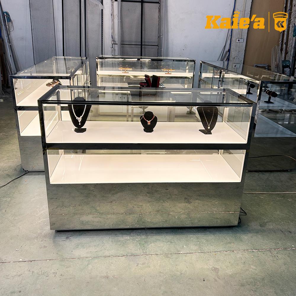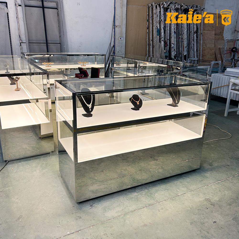 Gabinete de Exhibición de Joyería de Acero Inoxidable Espejo de Doble Capa Personalizado Isla de Centro Comercial Vitrina de Joyería Mostrador de Joyería