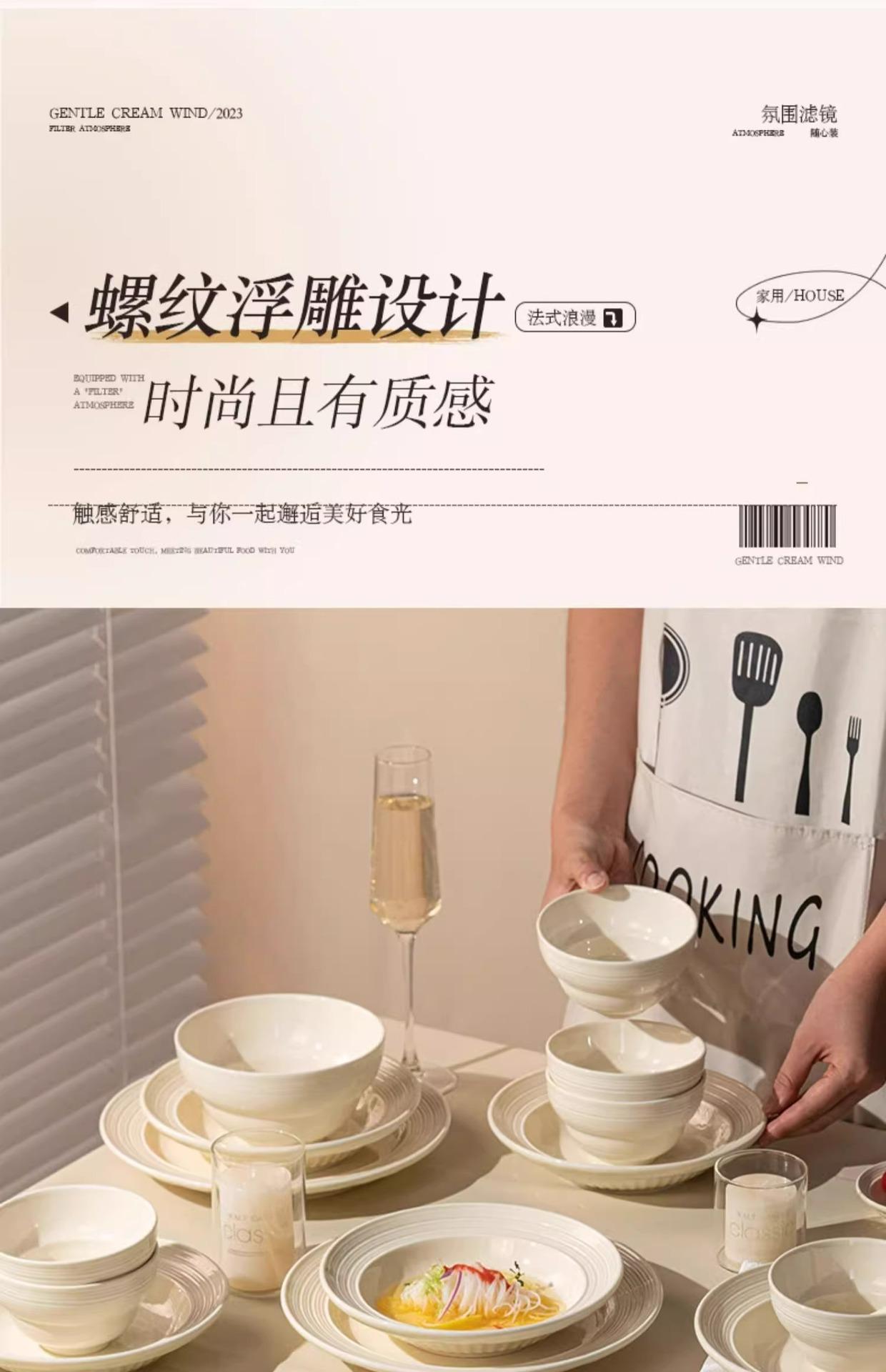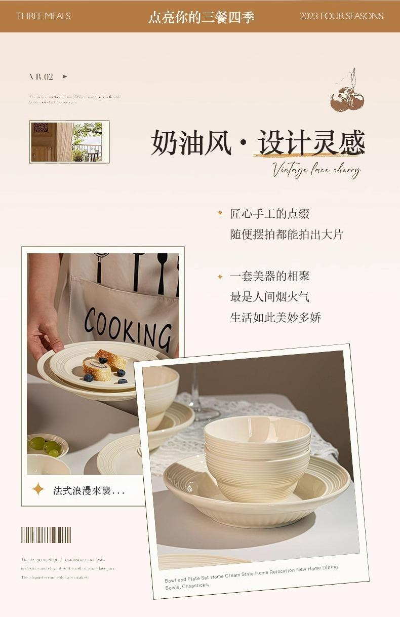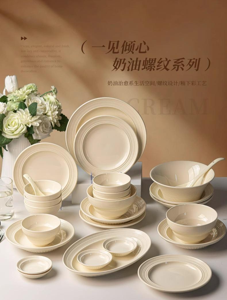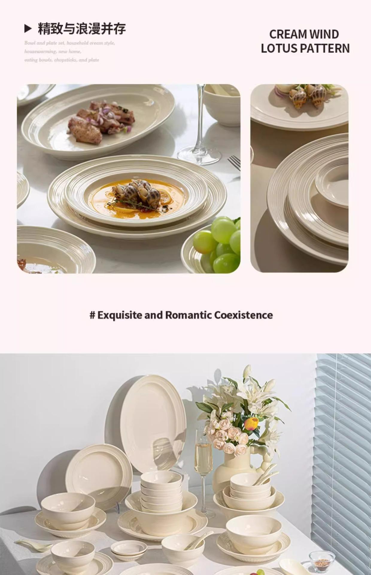 Juego de Tazón y Plato de Alta Calidad de Color Crema Estilo Francés para Uso Doméstico, Tazones de Color Bajo Cubierta, Platos, Cucharas, Tazones para Fideos, Tazones para Sopa, Vajilla de Cerámica
