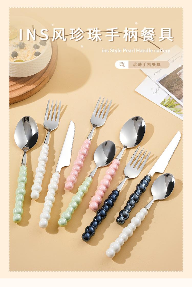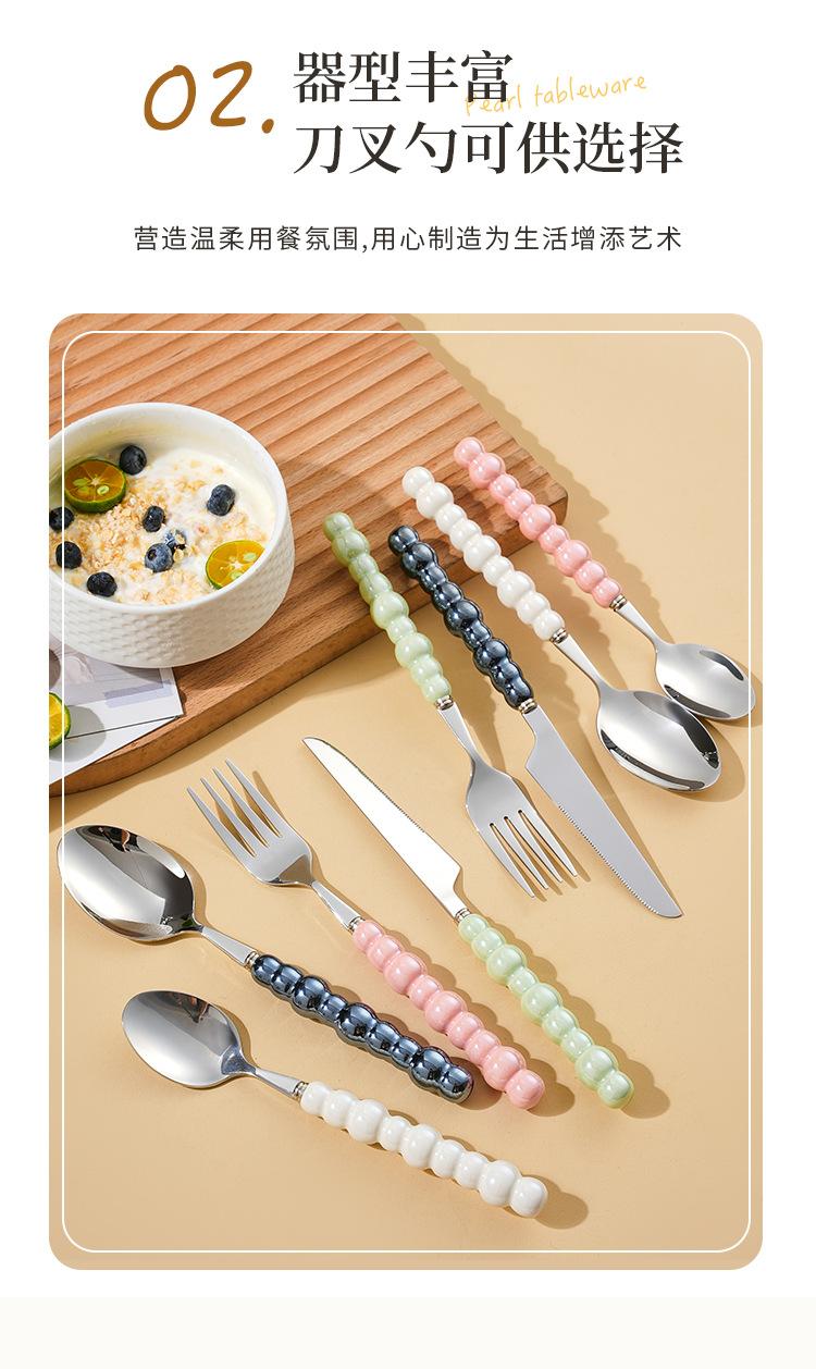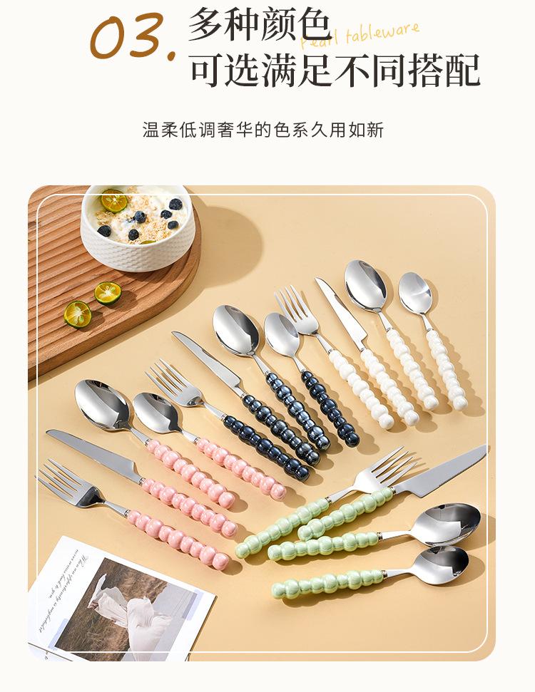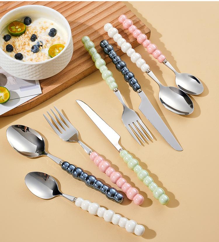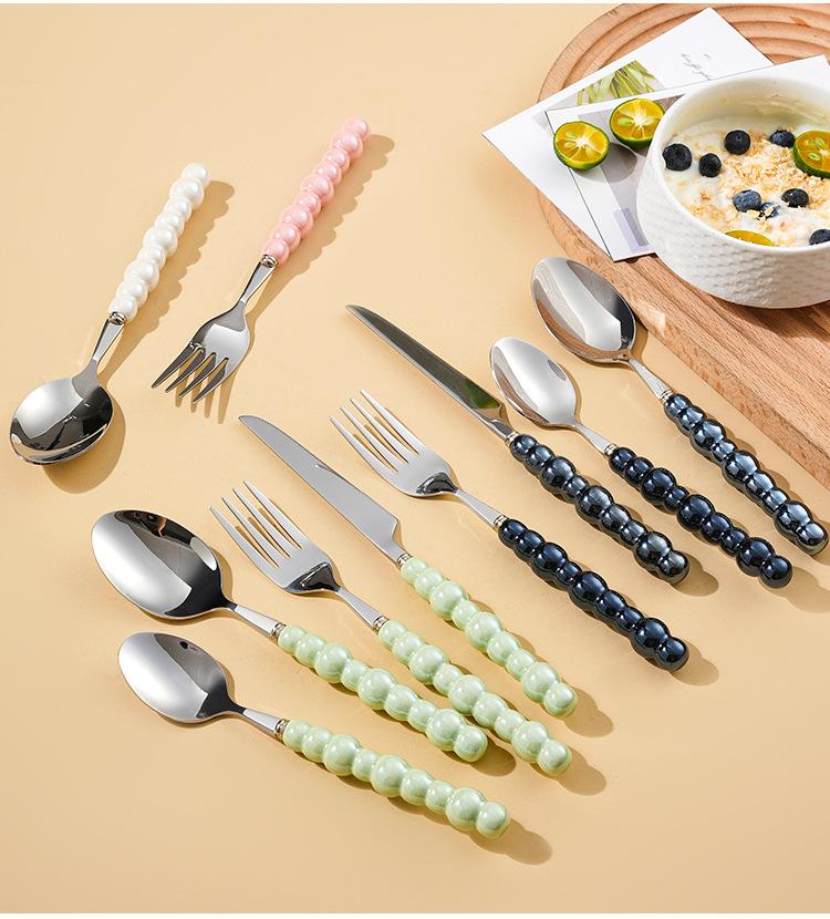 Lujo Ligero 304 Acero Inoxidable Cuchillo y Tenedor Cuchara Creativo Mango de Cerámica Perlada Vajilla Occidental Cuchillo y Tenedor para Bistec Cuchara de Postre