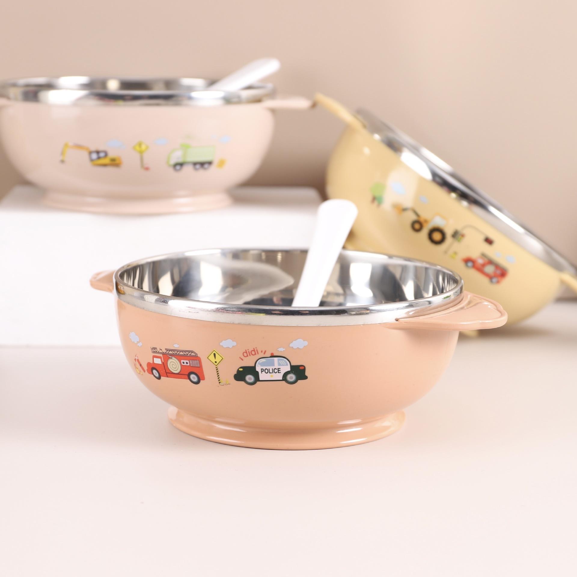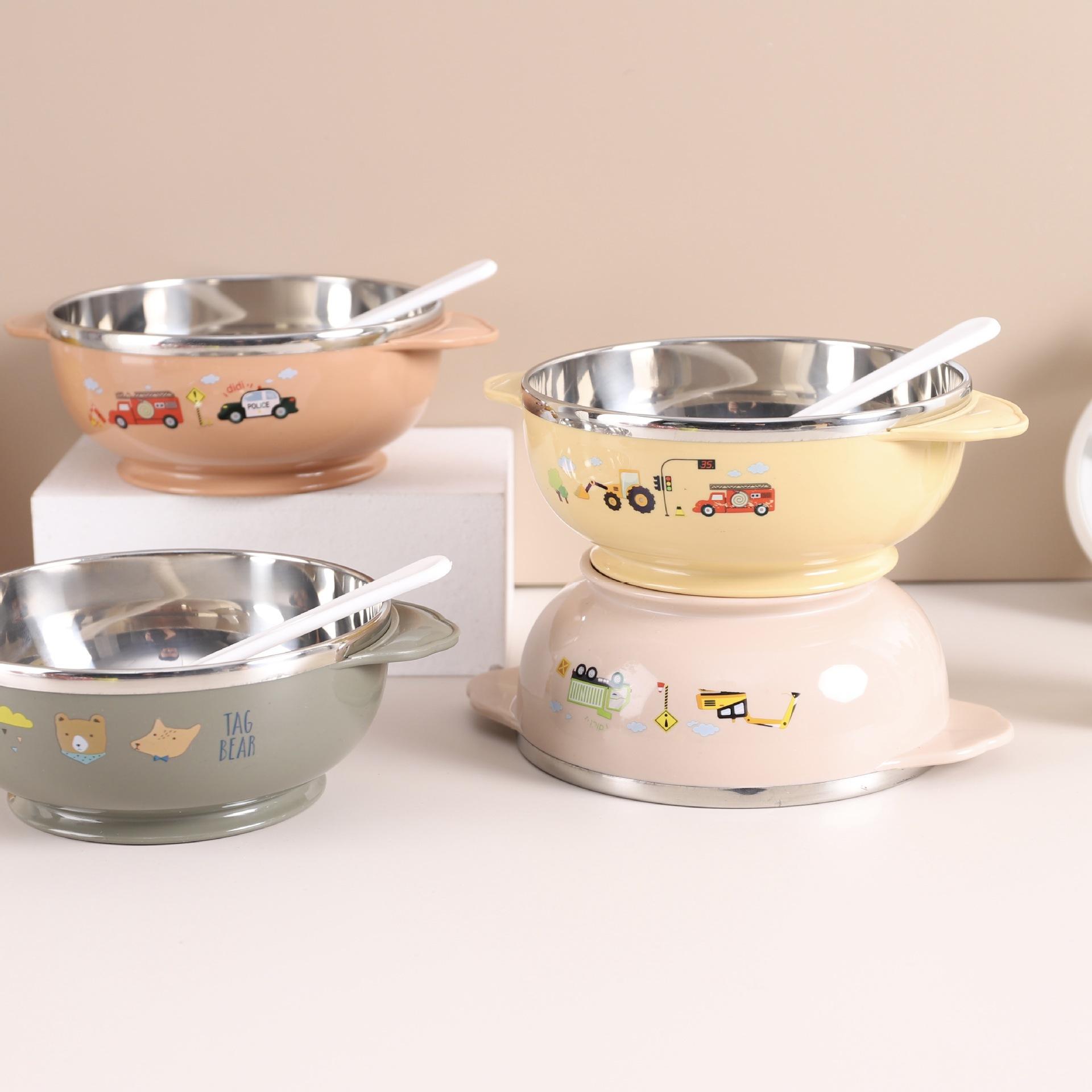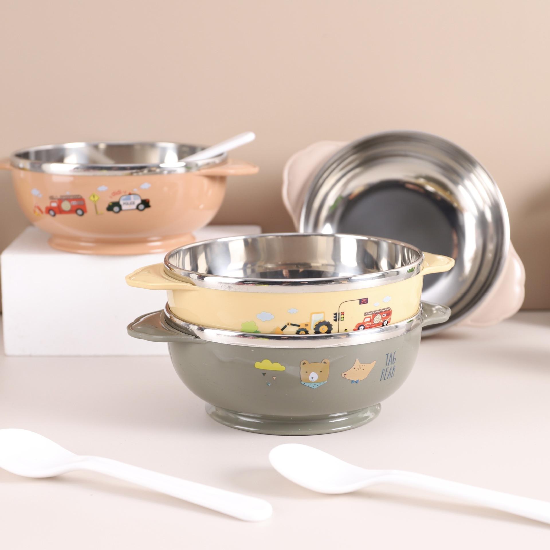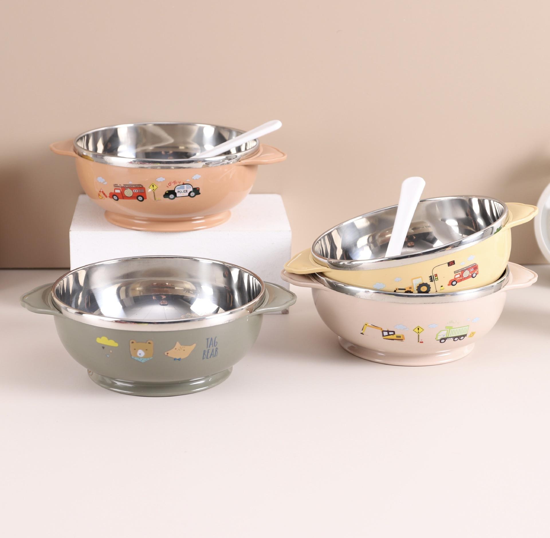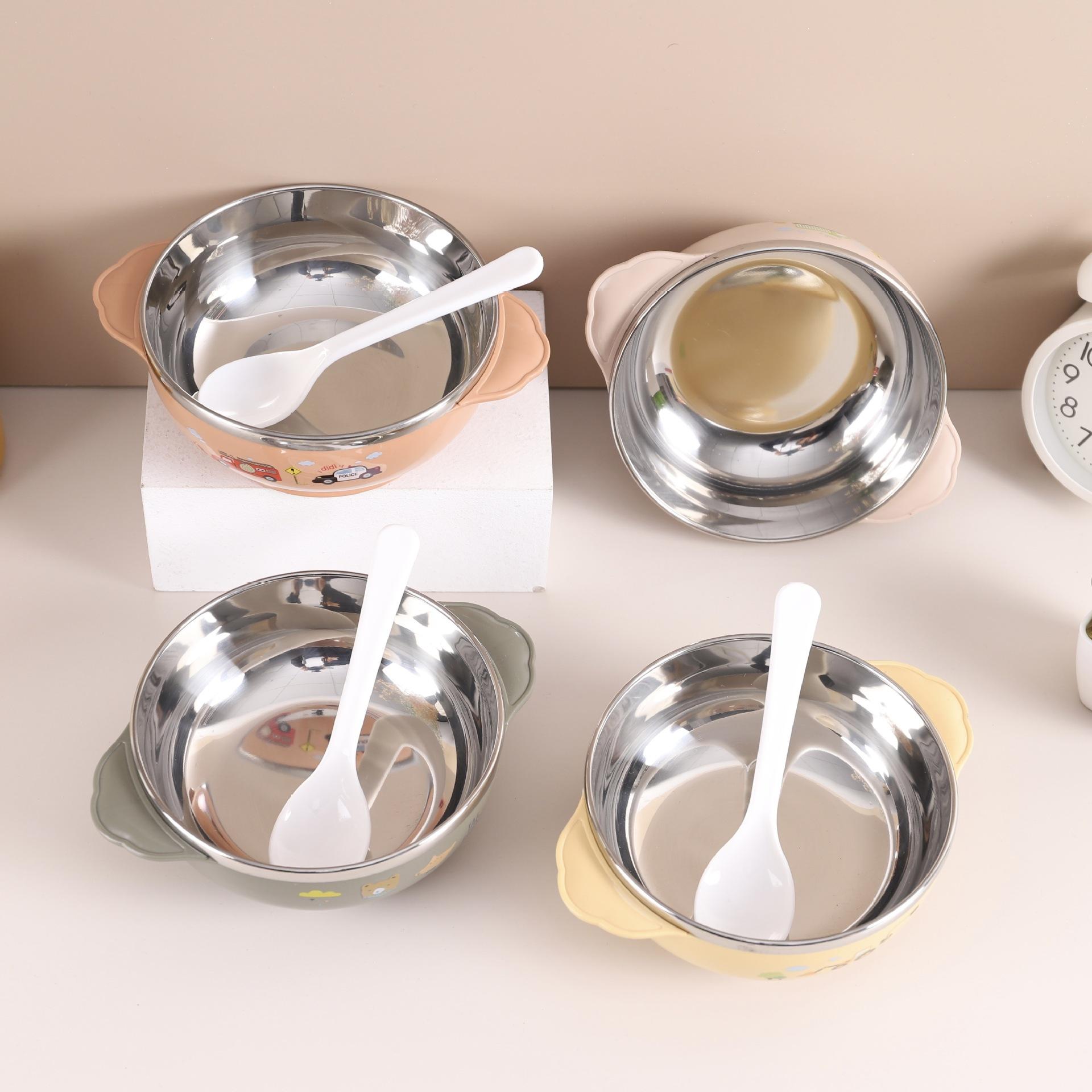 Nuevo tazón de acero inoxidable para niños, con dibujos animados, doble asa y tapa, cuchara, tazón de arroz, suplemento de comida para bebés, vajilla al por mayor