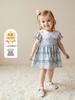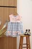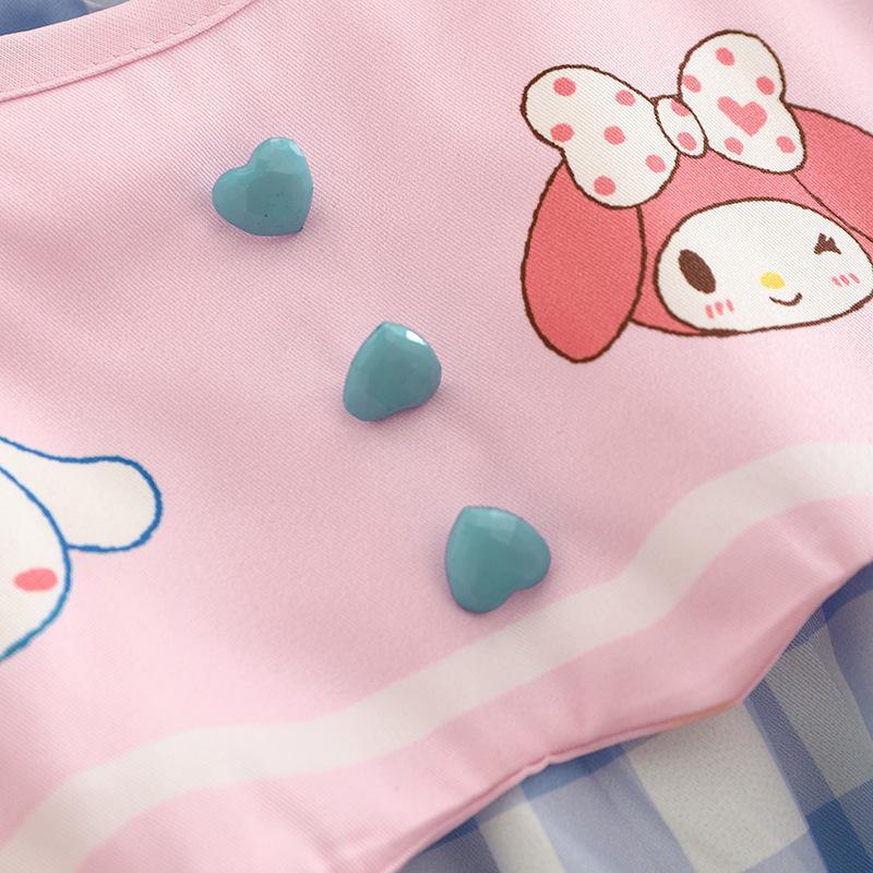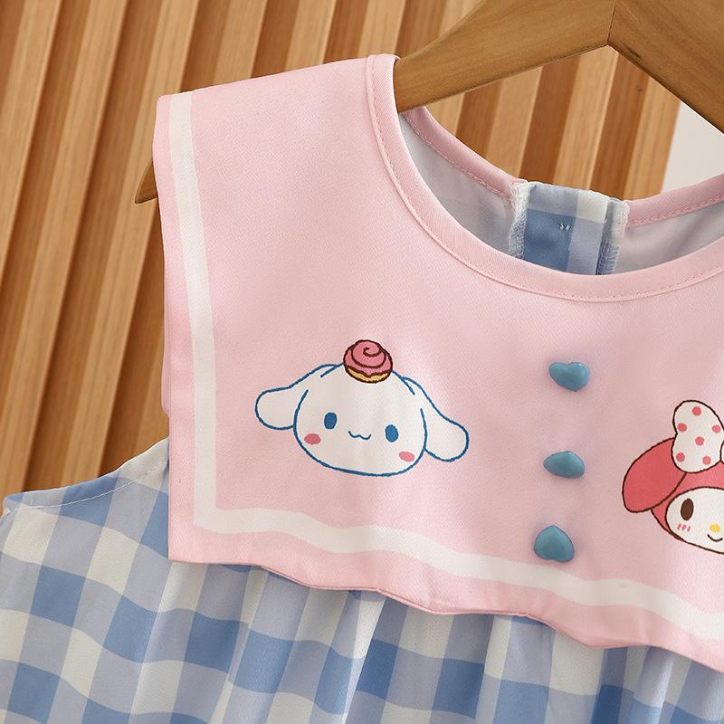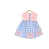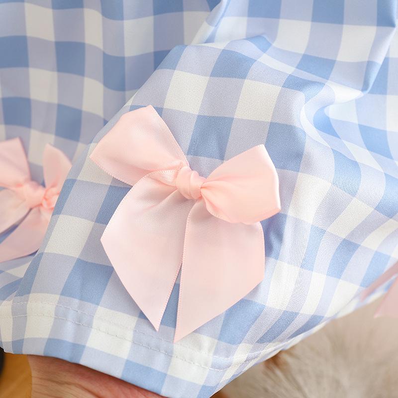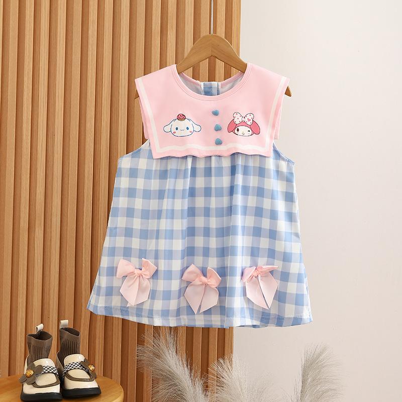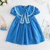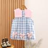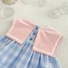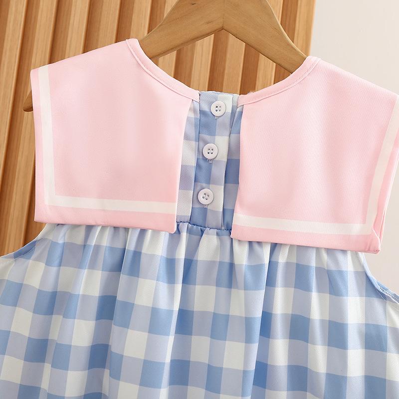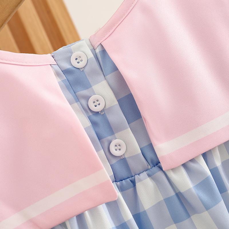 Ropa de verano para niños, vestido de princesa para niña, bonito y dulce vestido de muñeca de dibujos animados con cuello azul marino y cuadros rosas.