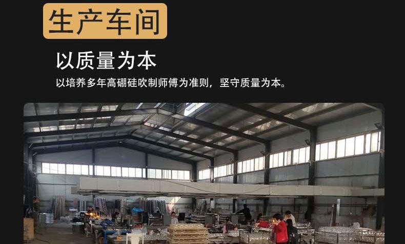 La Fábrica de Productos de Vidrio Hejian Chaobin es un fabricante de cristalería resistente al calor, ubicada al lado de Cangbao Road en la Zona de Desarrollo Chengdong de la ciudad de Hejian, provincia de Hebei, con un entorno geográfico superior. Nos especializamos en el diseño y la personalización de pedidos de regalos. Nuestros productos están hechos de tubos y varillas de vidrio de borosilicato 3.3 alto, que es un material de vidrio especial con bajo coeficiente de expansión (coeficiente de expansión térmica: (0~300℃) 3.3±0.1x10-6K-1), resistencia a altas temperaturas (punto de ablandamiento 820℃, alta estabilidad térmica, diferencia de temperatura de resistencia al calor superior a 270℃), alta resistencia, alta dureza, alta transmitancia de luz y alta estabilidad química, y son soplados puramente a mano. Nuestras artesanías de vidrio son cristalinas, con estilos novedosos y formas únicas. Son económicas y respetuosas con el medio ambiente. Producimos principalmente series de cristalería para té, instrumentos químicos y artesanías. En los últimos años, productos de vidrio resistente al calor de nuevo desarrollo como: tazas de vidrio de doble pared, teteras de vidrio resistente al calor, tazas de doble pared de vidrio de borosilicato alto, cristalería para té de vidrio resistente al calor, portavelas de vidrio, lámparas de huracán de vidrio, lámparas de aceite de vidrio, accesorios para fumar de vidrio, vasos de agua de vidrio, jarrones de flores de vidrio, botellas de condimento de vidrio, etc., han abierto rápidamente el mercado en el país y en el extranjero con su excelente calidad, y la tasa de repetición de pedidos de los clientes es alta. Si está buscando productos relacionados, o está operando tales productos, y espera encontrar nuevos aspectos destacados, por favor contáctenos. Estaremos muy contentos de recomendar nuestros productos. Bienvenido a consultar o proporcionar nuevos diseños, le daremos una respuesta oportuna. Nuestro principio de servicio es "hacer todo lo posible para satisfacer las necesidades del cliente y proporcionar a los clientes los mejores productos y precios". La satisfacción del cliente es nuestro reconocimiento, y las sonrisas de los clientes son nuestra motivación. Estamos dispuestos a crear brillantez y lograr la victoria del mañana juntos.