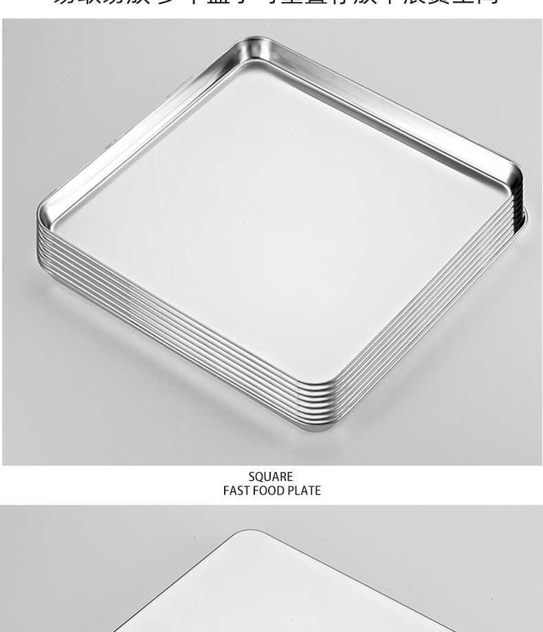 Venta al por mayor, plato cuadrado de acero inoxidable 304, plato de arroz al vapor, plato de barbacoa, plato de hierro comercial para el hogar, plato de cena, bandeja, bandeja