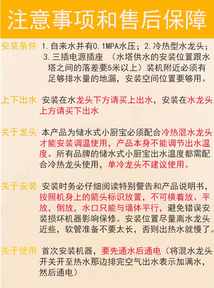 respuesta:El calentador de agua de cocina pequeño con acumulador es diferente del calentador de agua instantáneo. Debe conectarse a un grifo mezclador (es decir, uno de agua caliente y fría) al instalarse. No se puede conectar a un grifo unidireccional. De lo contrario, la temperatura del agua será demasiado alta y caliente, y el agua caliente se descargará rápidamente (un grifo unidireccional solo sirve para agua caliente). La cantidad de agua caliente que sale equivale a la cantidad de agua fría que entra, y la temperatura del agua en el tanque interior baja rápidamente. Por lo tanto, el uso de un grifo unidireccional no es bueno. Al conectarlo a un grifo mezclador, la temperatura del calentador de agua de cocina se puede ajustar a un nivel alto y se descargará agua fría mezclada. El agua caliente es unidireccional.Cuatro veces más, así que asegúrese de elegir un grifo mezclador. Por supuesto, también hay interruptores integrados y separados para agua caliente y fría. El interruptor integrado es común, pero si es un interruptor separado para agua caliente y fría, debe tener cuidado al usarlo. Al usarlo, abra primero el agua fría y luego el agua caliente. El interruptor integrado es muy fácil de usar.!