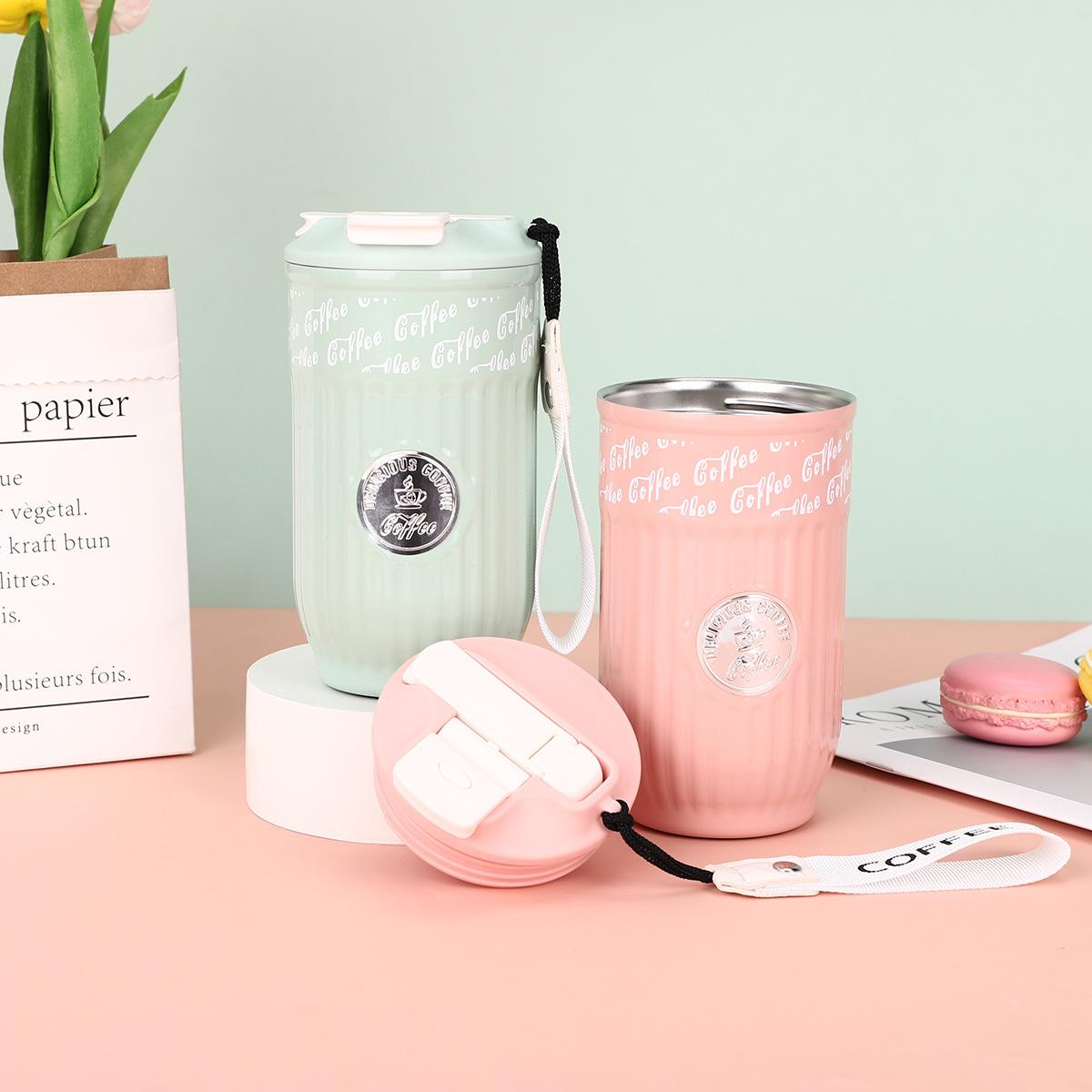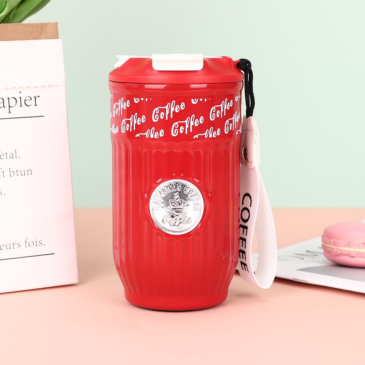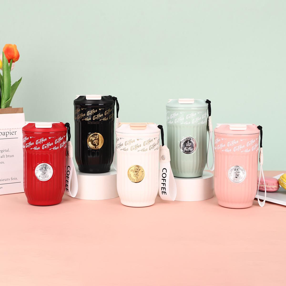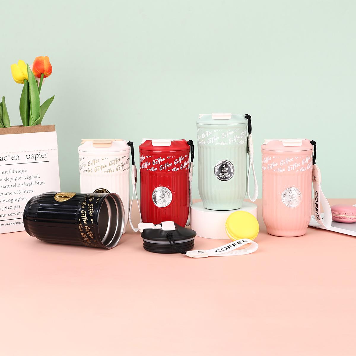 Nueva taza térmica de acero inoxidable 304 de alto valor para hombres y mujeres, taza de café portátil con cuerda a rayas, taza de regalo de acompañamiento