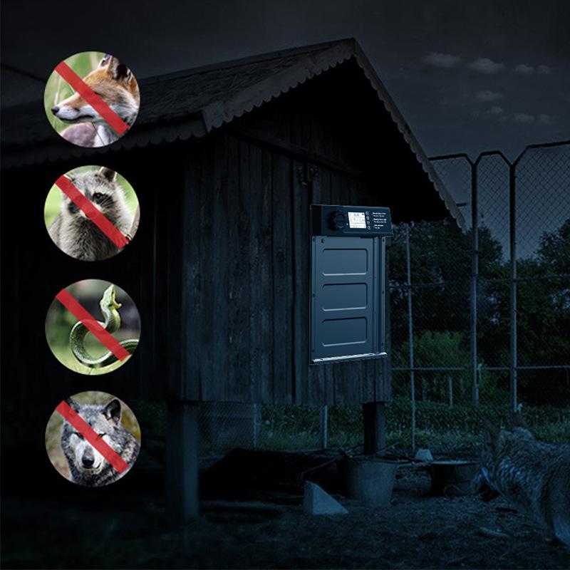 2. Fuerte y duradero: La puerta automática del gallinero está hecha de aleación de aluminio de alta calidad con pintura profesional. La puerta del gallinero para uso a largo plazo es fuerte y duradera. Puede prevenir eficazmente la invasión de enemigos naturales como propiedades, coyotes y zorros, y proteger a sus pollos de los enemigos naturales.