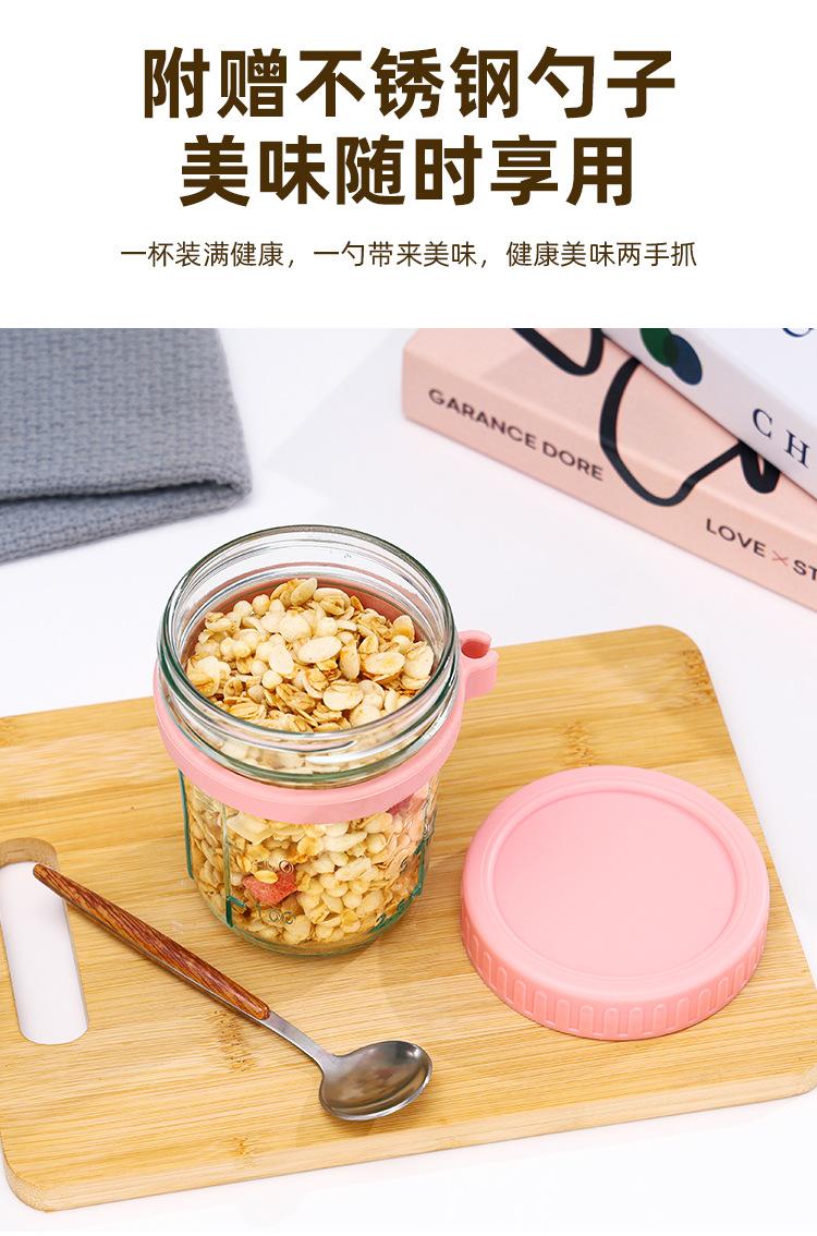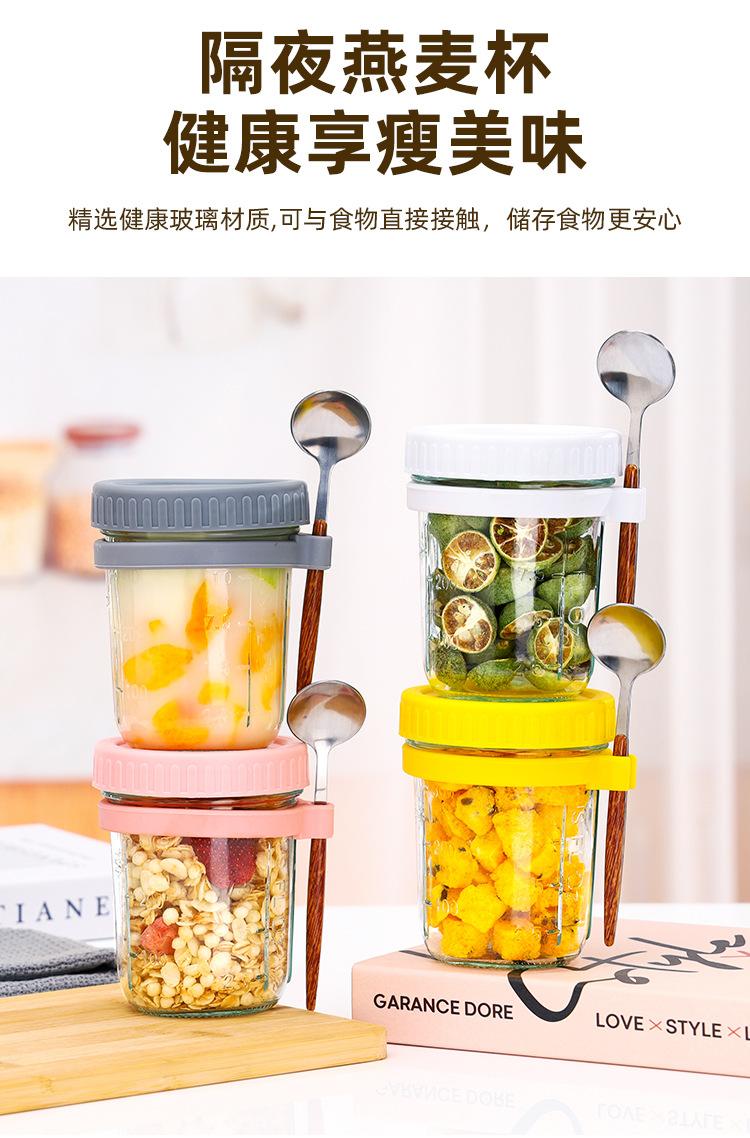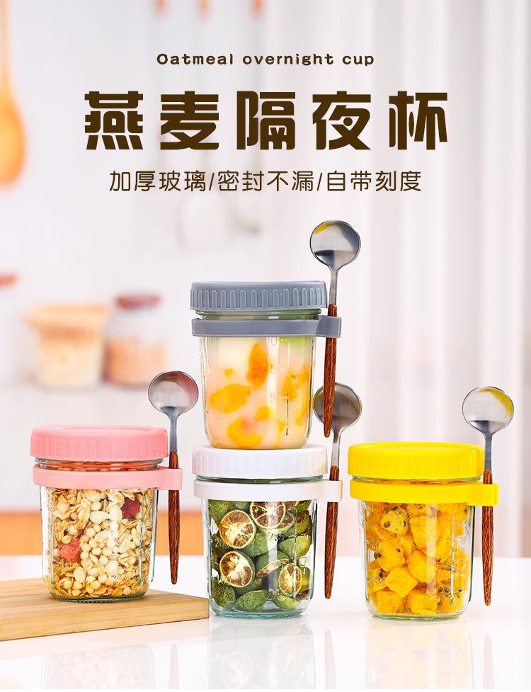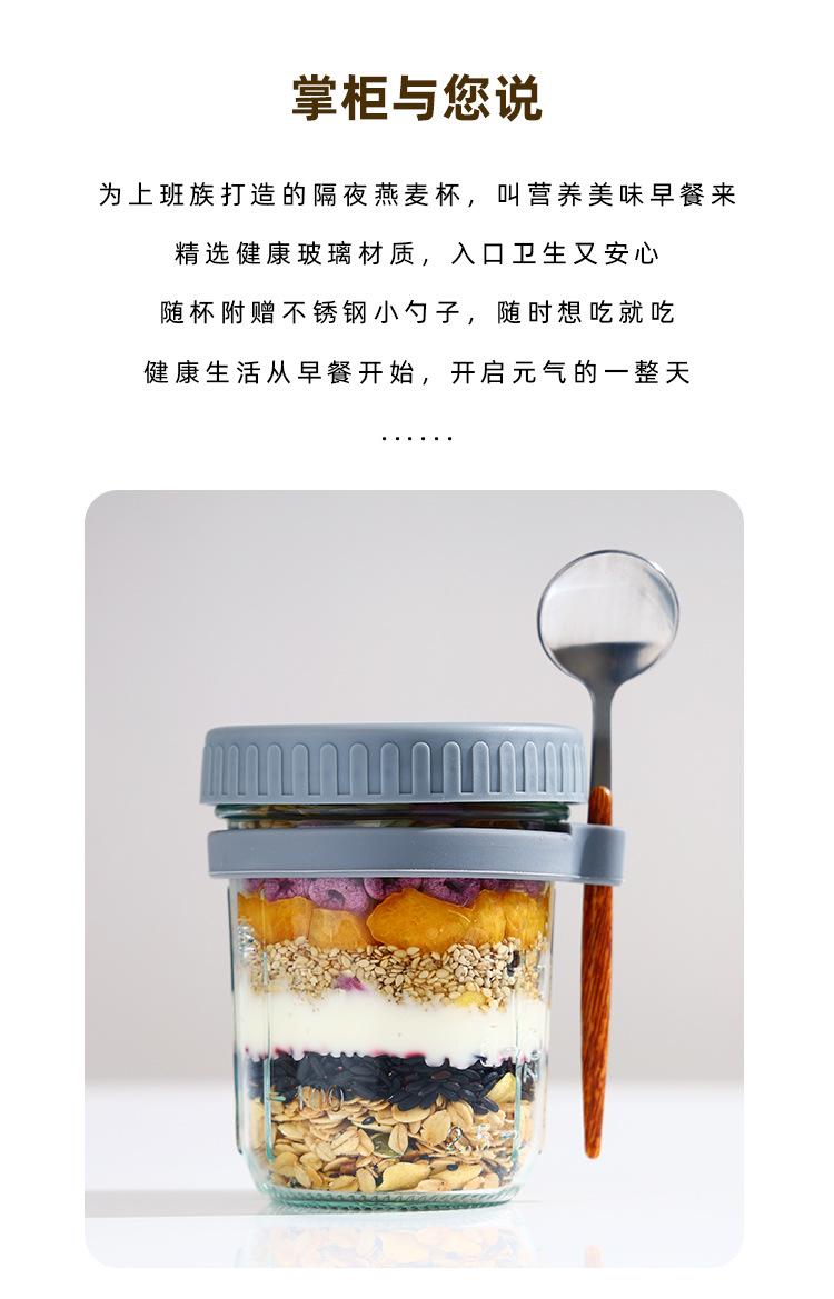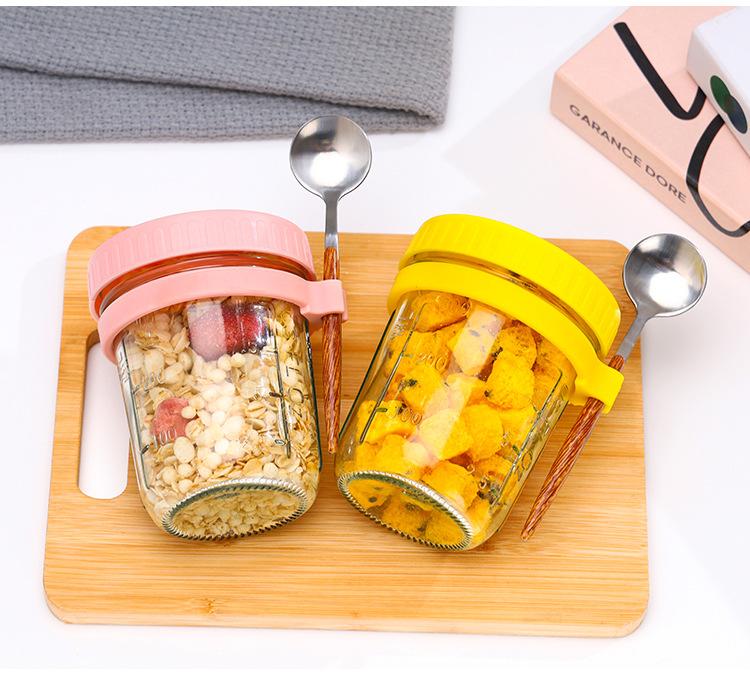 Taza de Avena Nocturna Taza para Desayuno de Oficina Taza de Leche Yogur para Niñas con Tapa Vaso de Vidrio Sellado Portátil con Cuchara