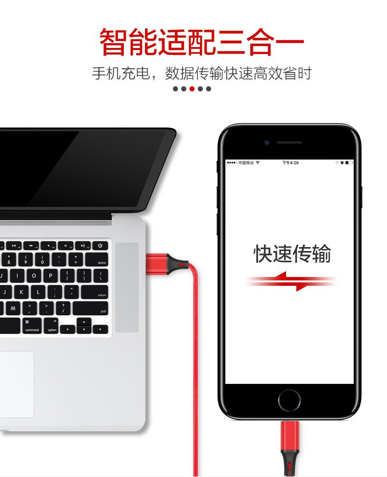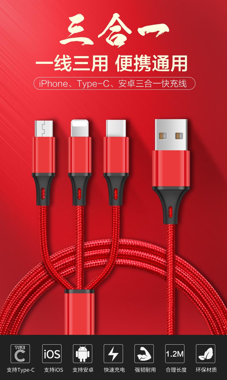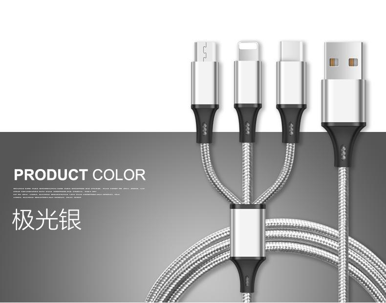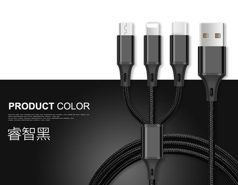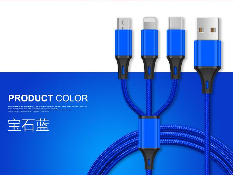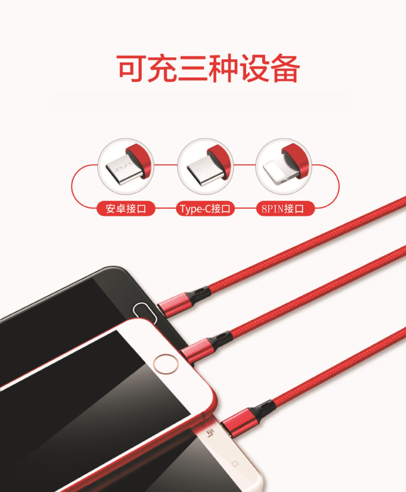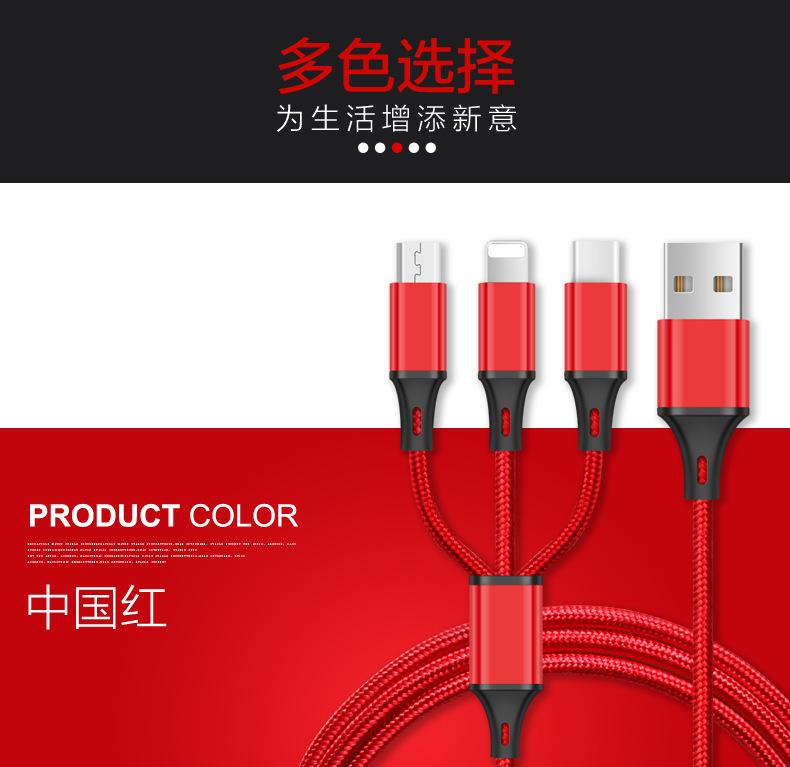 Ventajas del producto: carga rápida, adecuado para todos los puertos de carga de teléfonos móviles en China, puede cargar 3 teléfonos móviles con diferentes puertos de carga al mismo tiempo, no se enreda fácilmente.