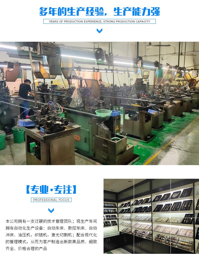 La empresa produce principalmente accesorios de joyería de acero inoxidable 304, 316, 316L: bobinas, llaveros, cierres de langosta, cierres de joyería, anillos de red, tubos redondos, tubos cuadrados, cierres de alambre moldeado, accesorios para los oídos (tapones para los oídos, agujas para los oídos, ganchos para los oídos, tapones de goma para los oídos), varillas OT, accesorios de estampado como cubiertas, copas de garra, mandriles planos, clips de cuerda, etc., varias piezas de torno de formas especiales como cuentas de ábaco, cubos, cabezas de bulbo, cabezas de serpiente redondas con agujeros horizontales, copas de piedra, varios estilos de cadenas, accesorios láser, etc.; Los productos de joyería de acero inoxidable (316L, 316, 304) incluyen: aretes, collares, cadenas de ropa, pulseras, brazaletes, anillos, colgantes, etc. Los productos se venden en el país y en el extranjero (Europa, América, África y países del sudeste asiático).