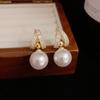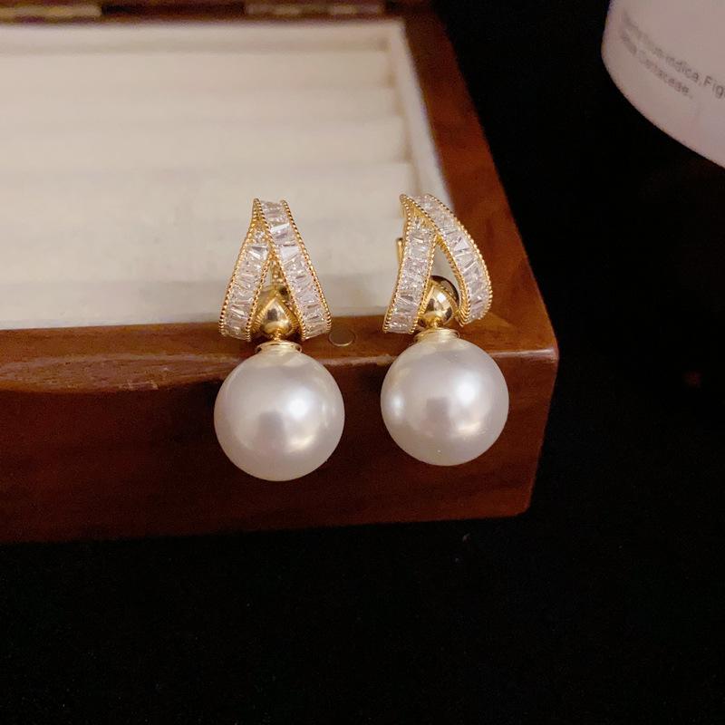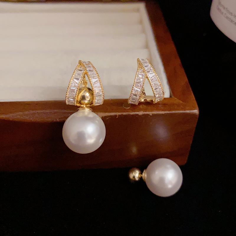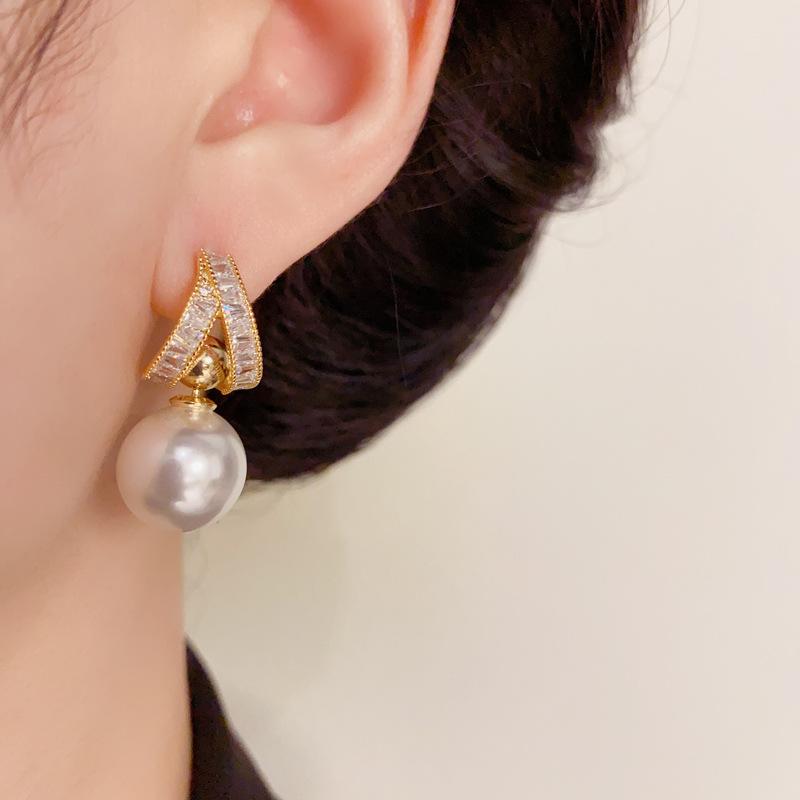 Multi-wear zircon triangle white pearl earrings (thick gold plating)