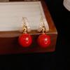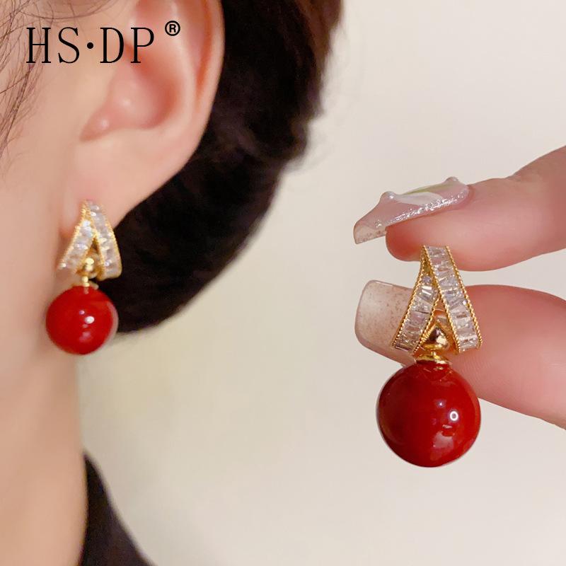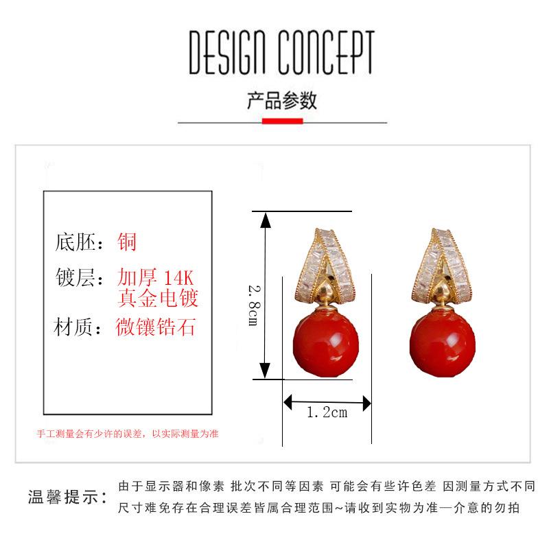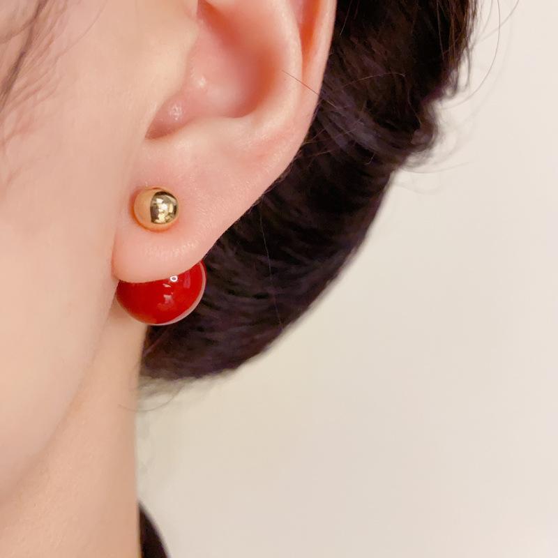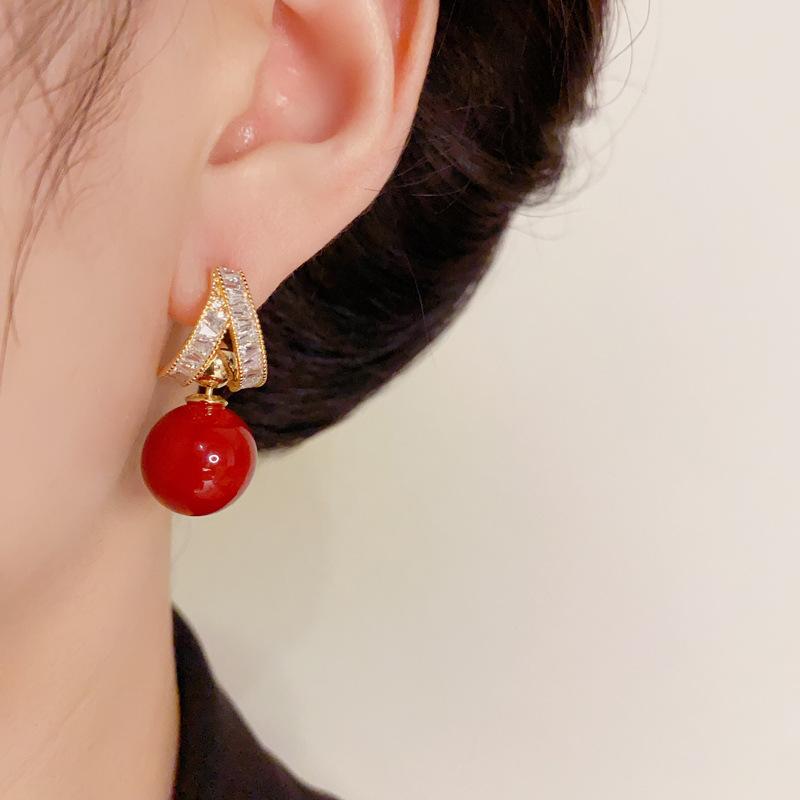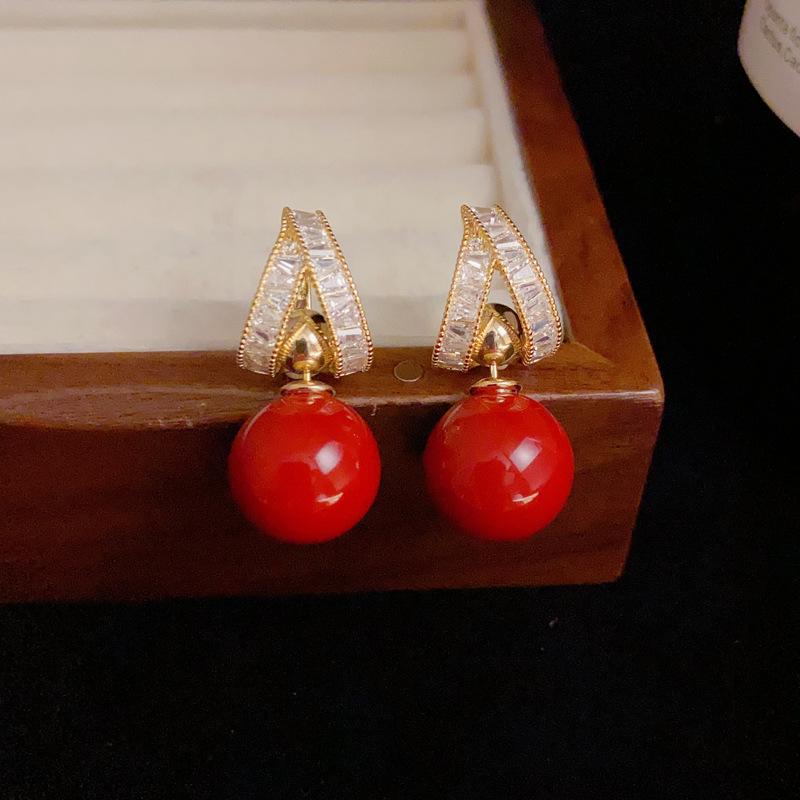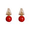 Multi-wear zircon triangle red pearl earrings (thick gold plating)
