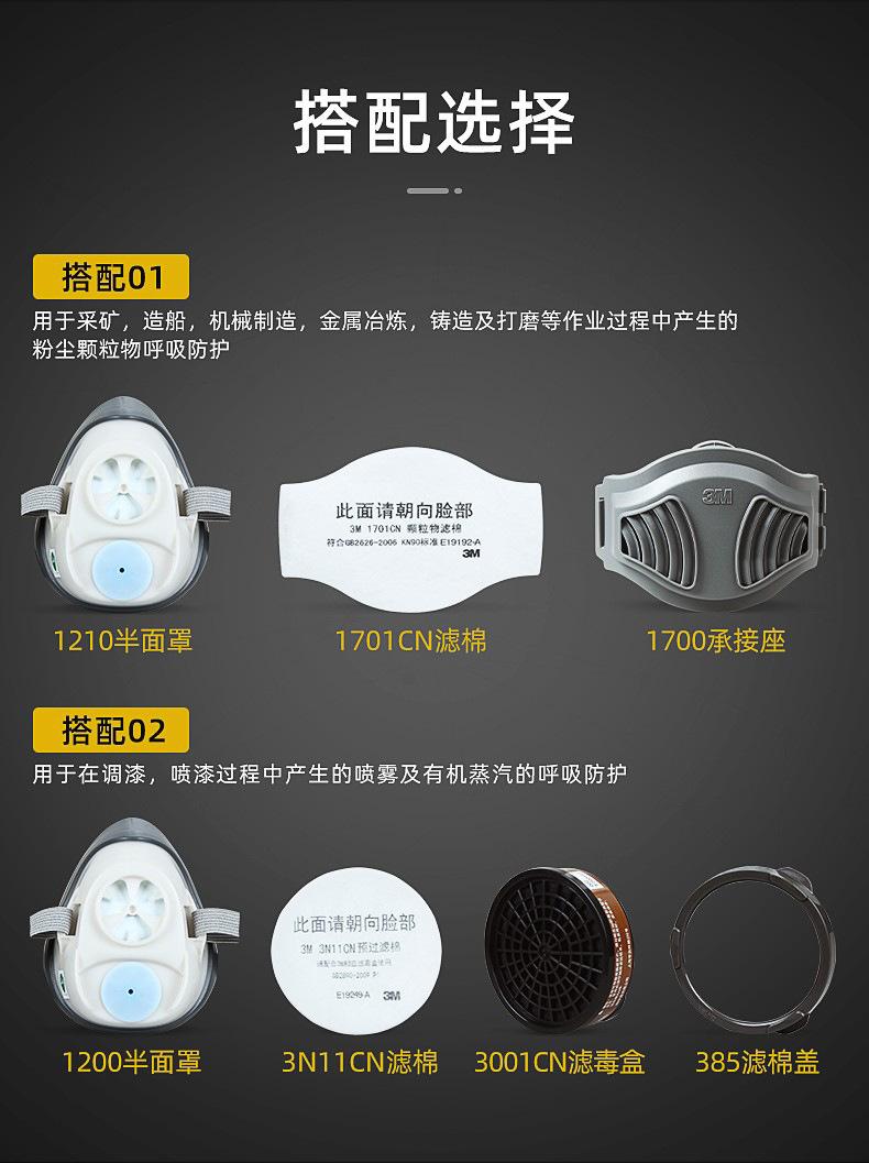 1200 head frame half mask, 1210 head-mounted half mask, 385 cotton filter cover, 3N11 filter Cotton, 3303 pois...