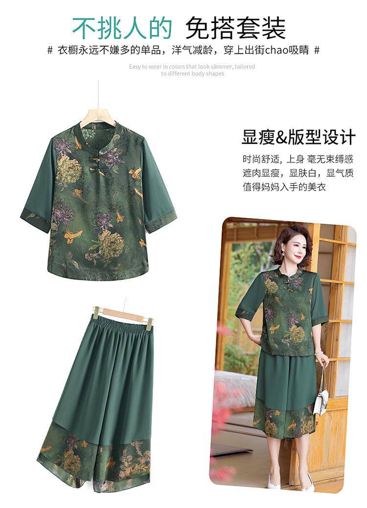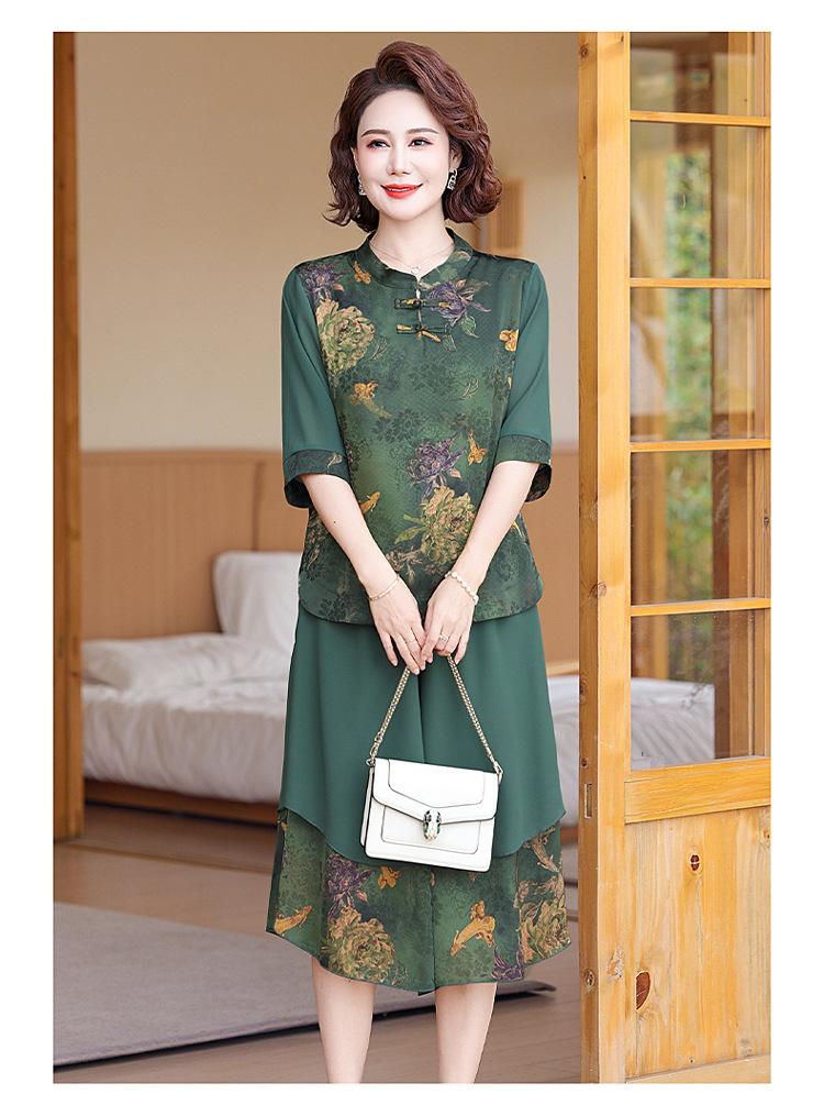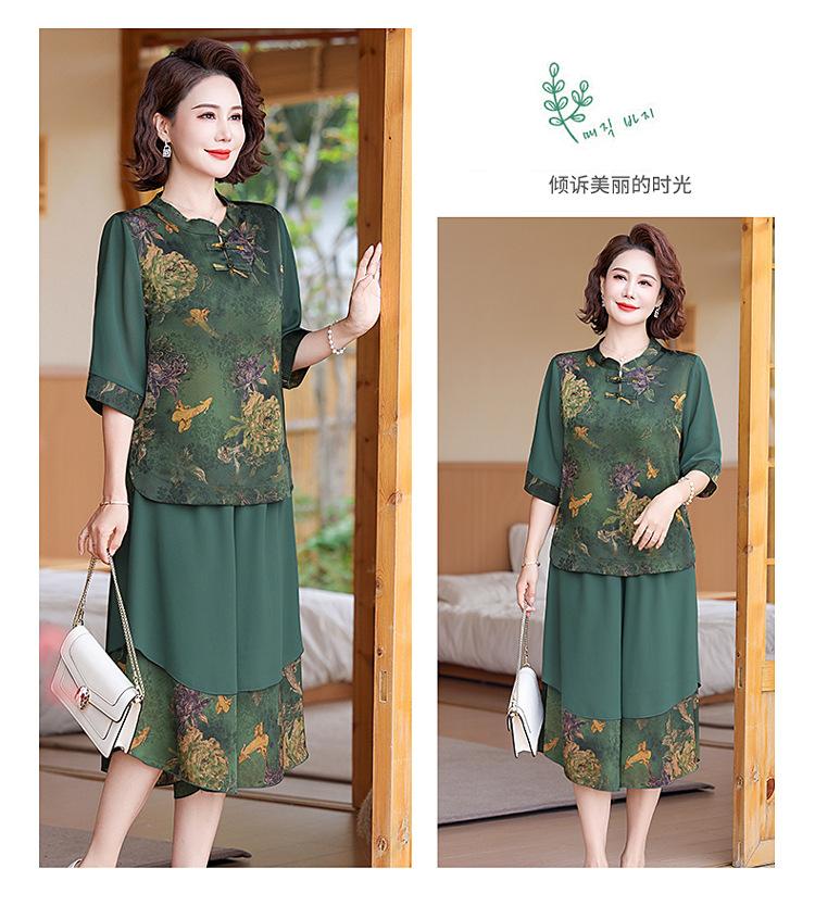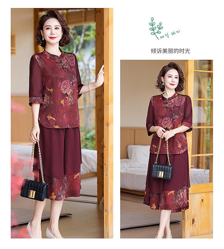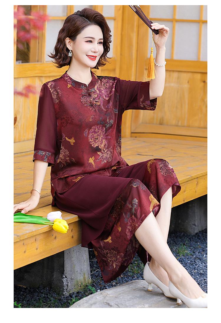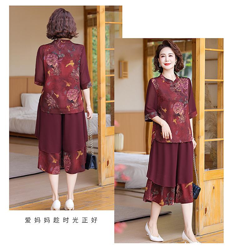 Vestido de Verano para Madre Estilo Nacional Cheongsam Mejorado Top de Manga Corta Pantalones Holgados Traje de 2 Piezas Estilo Occidental Traje para Mujeres de Mediana Edad