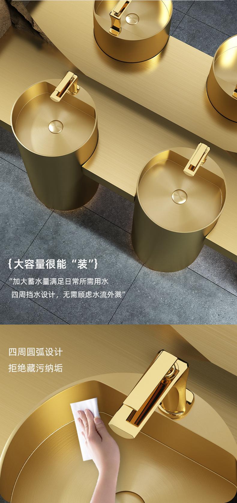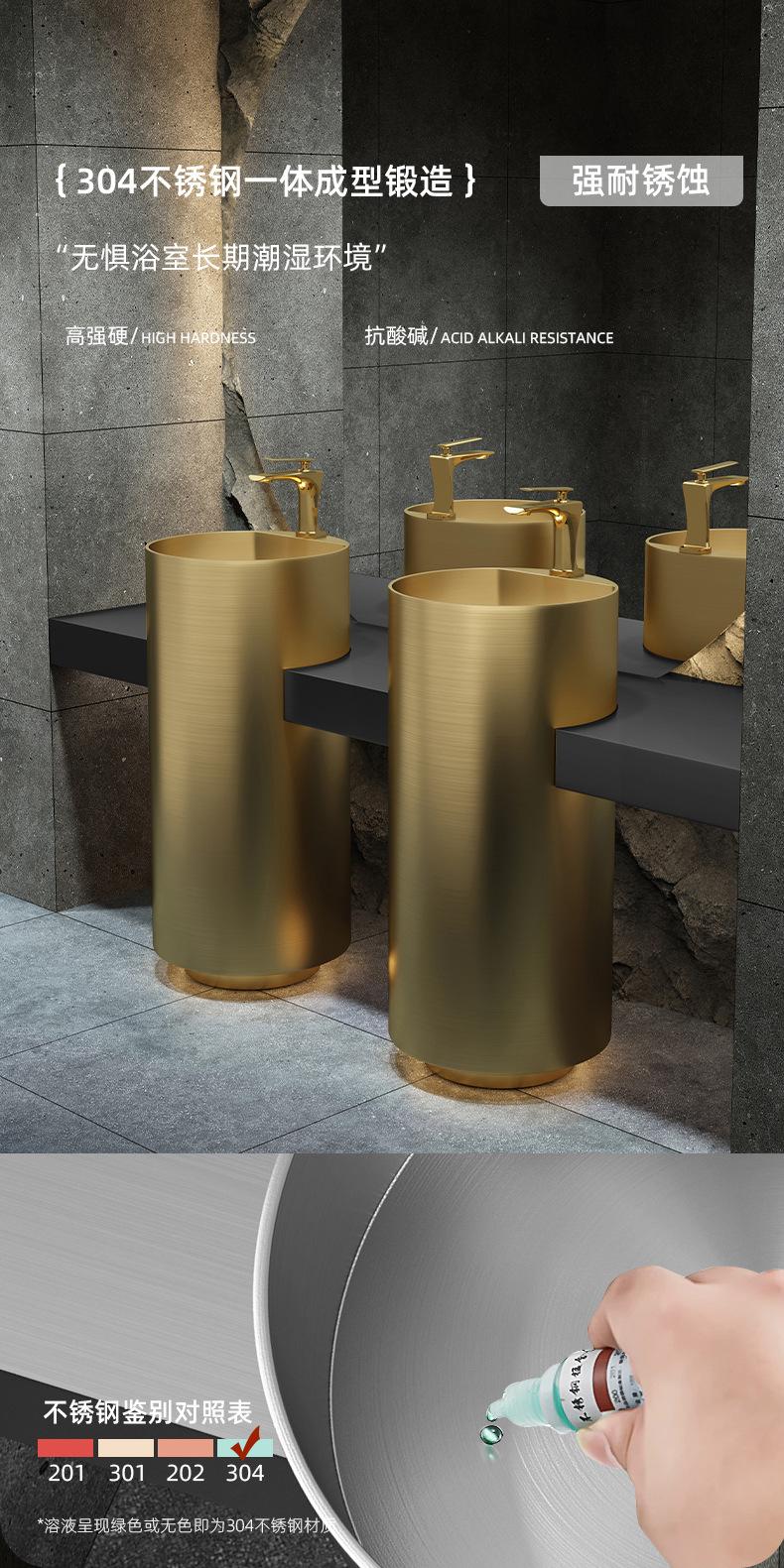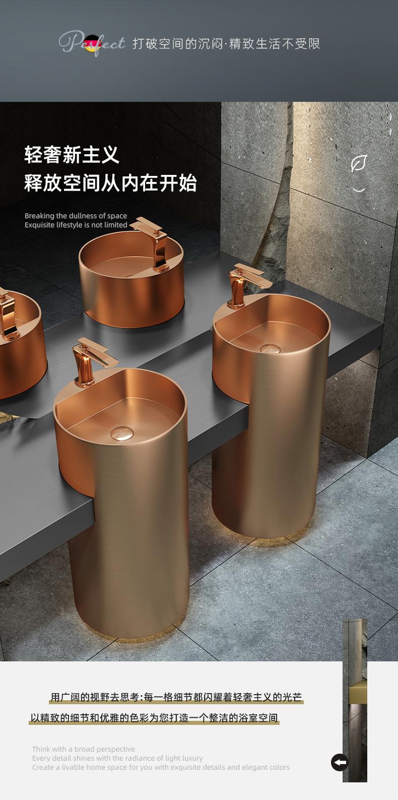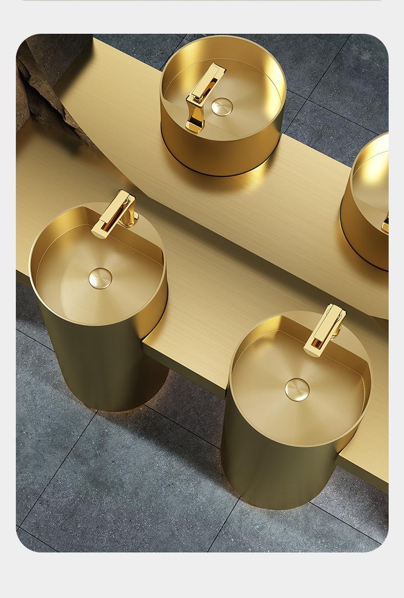 Lavabo de columna de acero inoxidable dorado, lavabo de suelo integrado, lavabo de columna de baño redondo