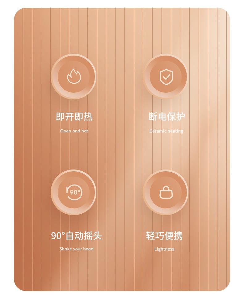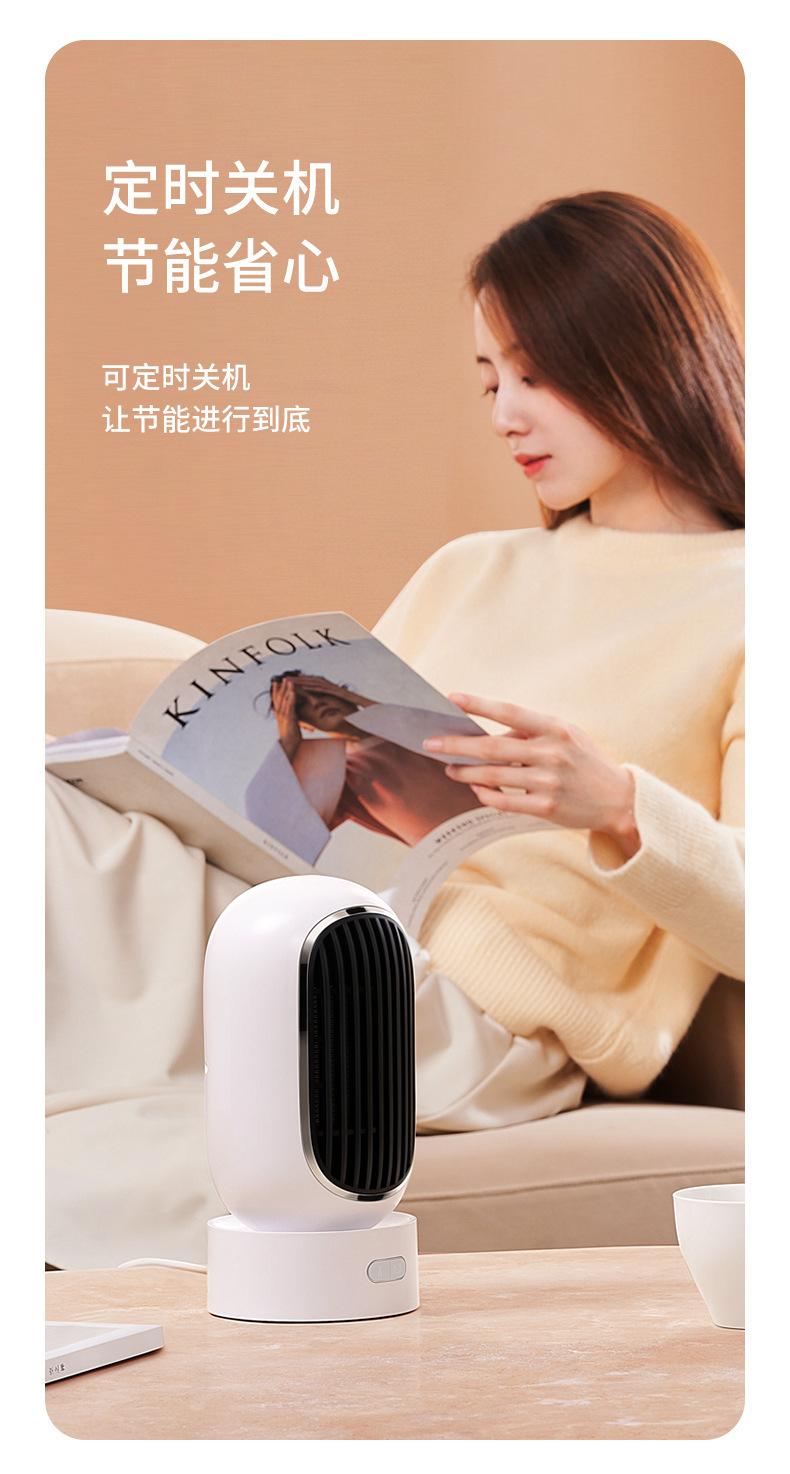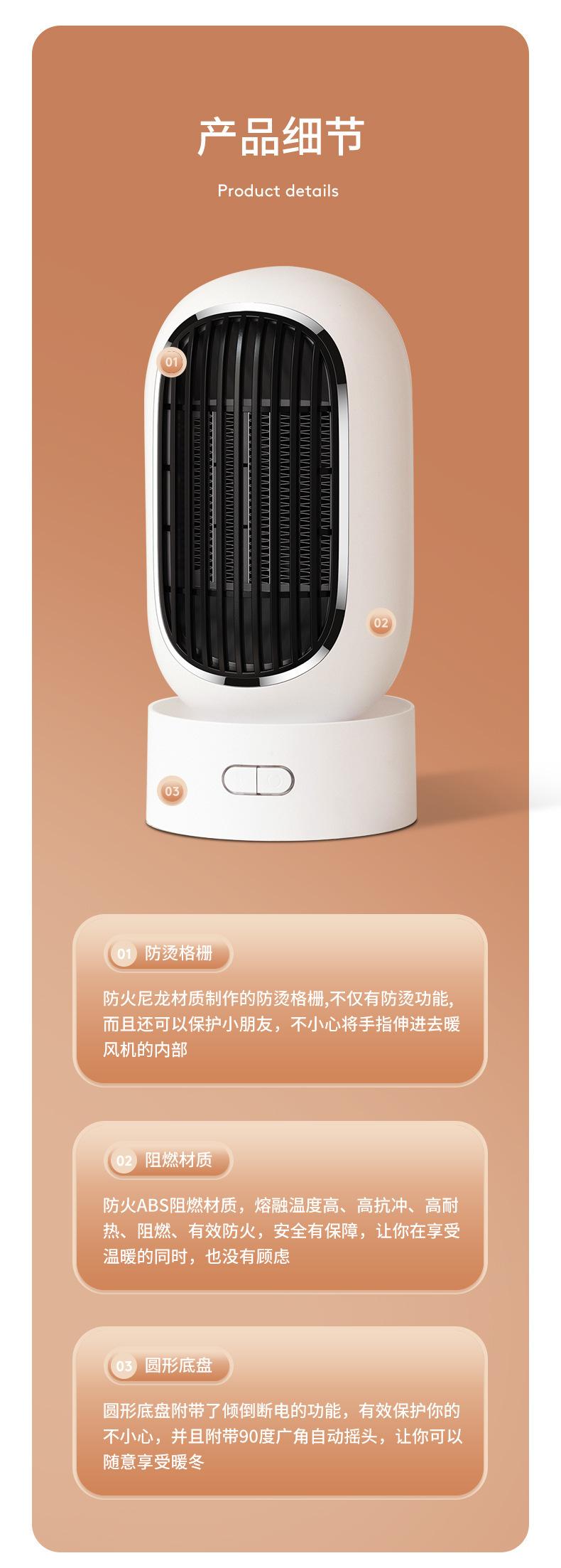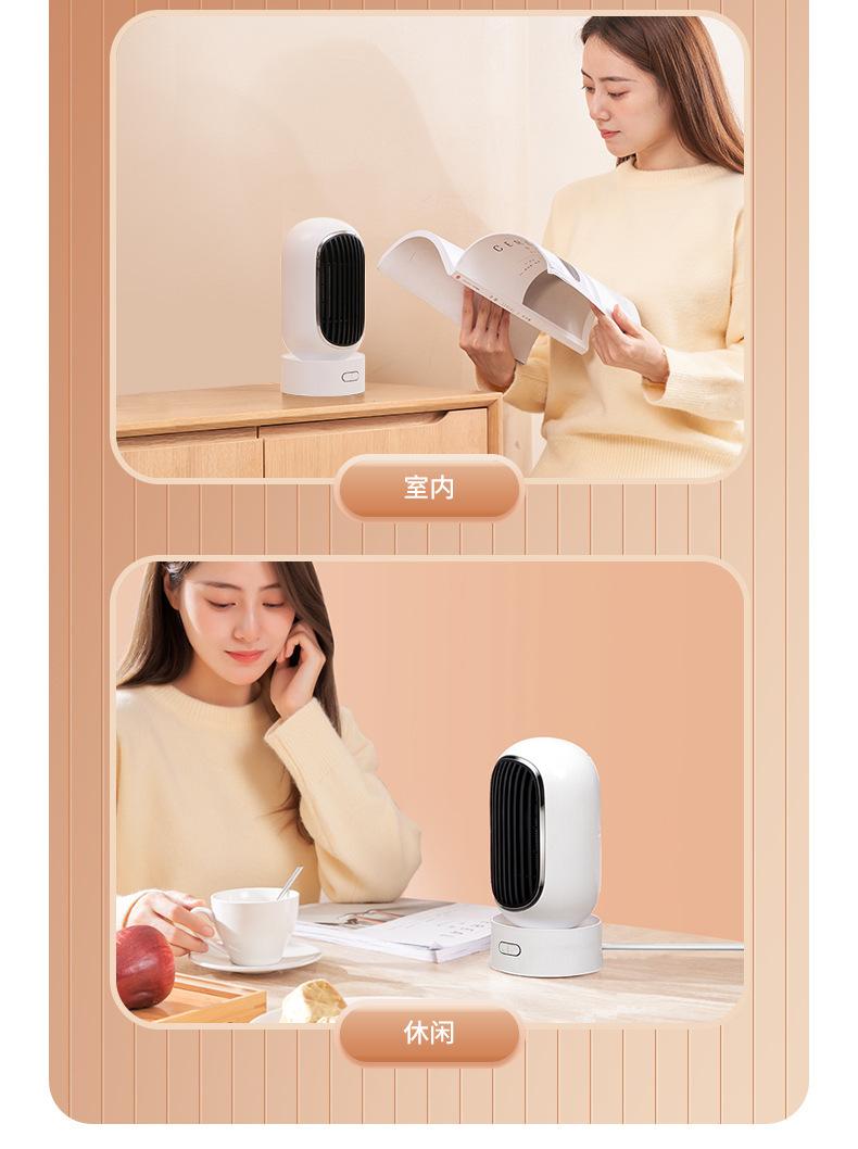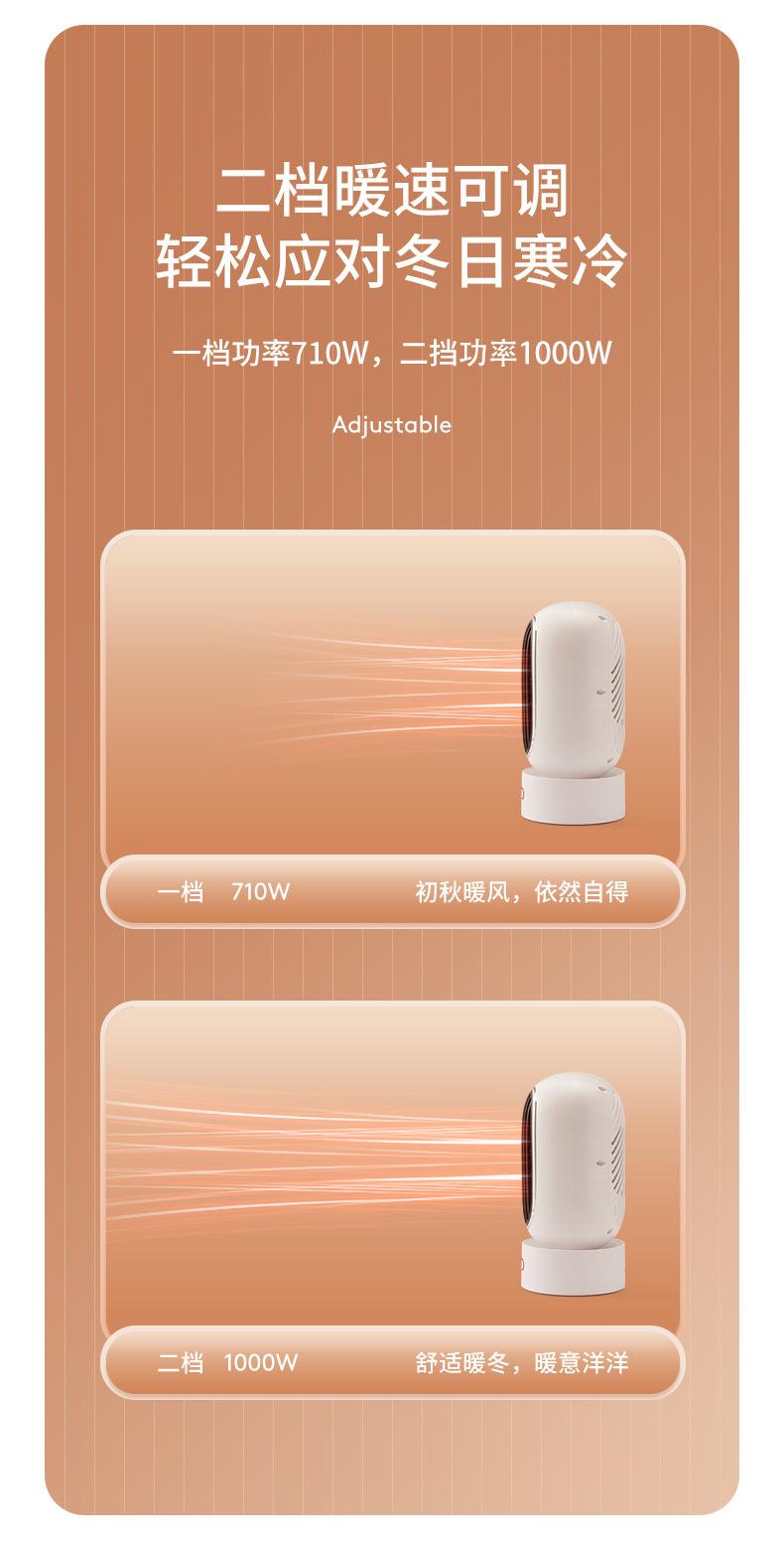 1. Conecte el enchufe a la toma de CA220V, el calentador entra en estado de espera con una luz blanca encendida, gira automáticamente y la salida de aire se restablece al punto central. Haga clic en el botón de temperatura una vez, la primera marcha se ilumina con una luz amarilla y la potencia de calentamiento es de 710W. Haga clic en el botón de temperatura una segunda vez para entrar en la segunda marcha con una luz roja encendida, y la potencia de calentamiento es de 1000W. Haga clic en el botón de temperatura una tercera vez para entrar en la marcha de apagado, volver al estado de espera con una luz blanca encendida, el calentador deja de funcionar y el ventilador continúa funcionando durante un minuto. La temperatura de salida del aire desciende a unos 40 grados y se detiene automáticamente.