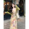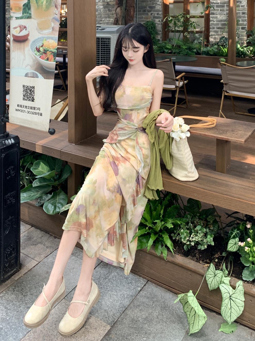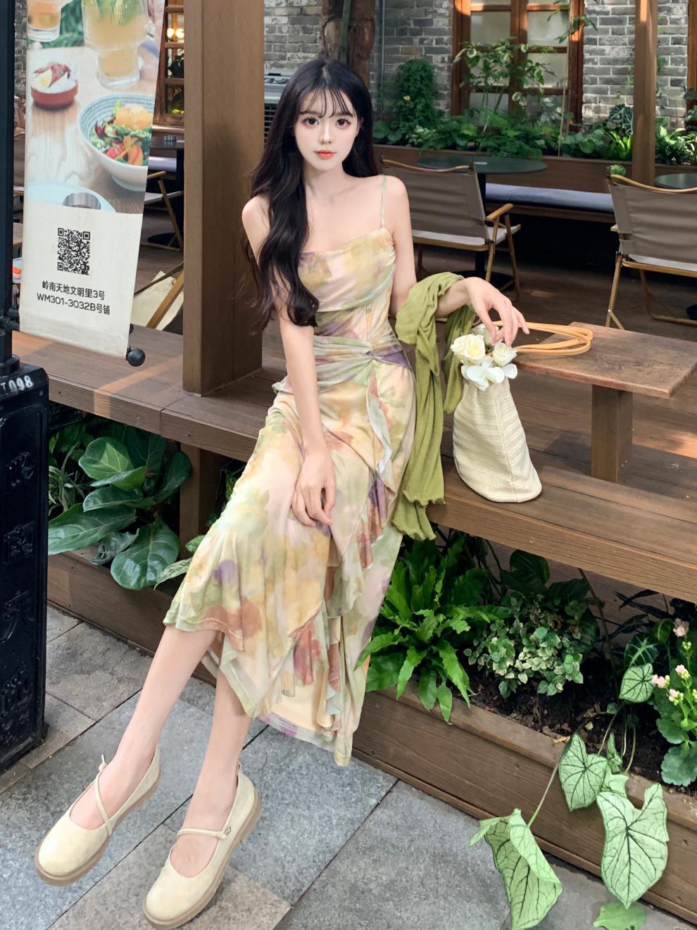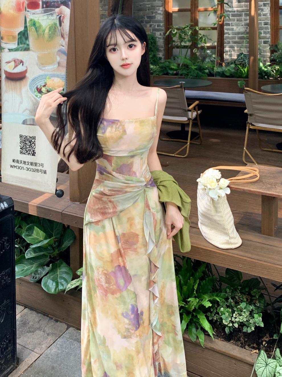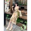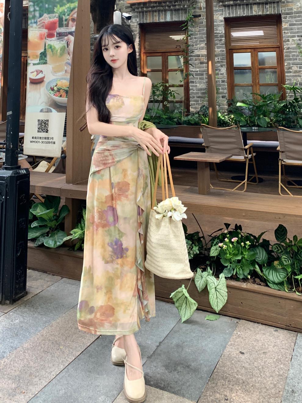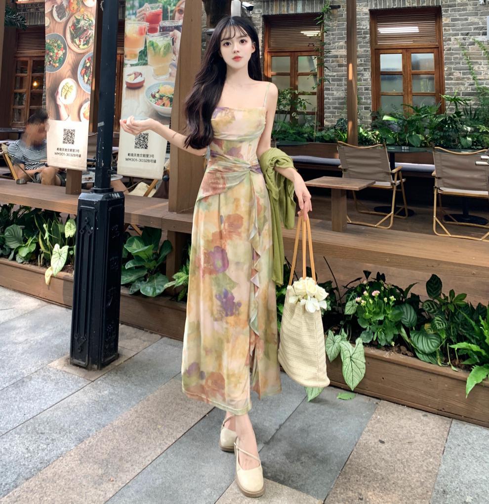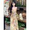 Foto real ~ Primavera 2024, nuevo vestido de tirantes finos retro francés de talla grande, diseño de nicho, falda floral