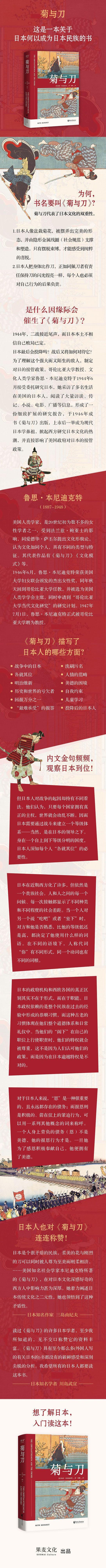 Benedict escribió El Crisantemo y la Espada después del final de la Segunda Guerra Mundial. El Crisantemo y la Espada tiene 13 capítulos: comenzando con la visión de la guerra, hablando sobre la Restauración Meiji, y luego discutiendo las costumbres japonesas y los conceptos morales, hasta cómo "entrenarse a uno mismo" (cultivo) y cómo se educa a los niños. El libro es una mezcla de narración y discusión, dejando de lado las descripciones sensacionalistas de las flores de cerezo, la ceremonia del té, el Bushido, etc., y haciendo principalmente comparaciones sencillas de las relaciones familiares y las creencias espirituales, como las diferentes visiones de los estadounidenses y los japoneses sobre la salud, lo material, la propaganda de guerra, las relaciones familiares, etc.