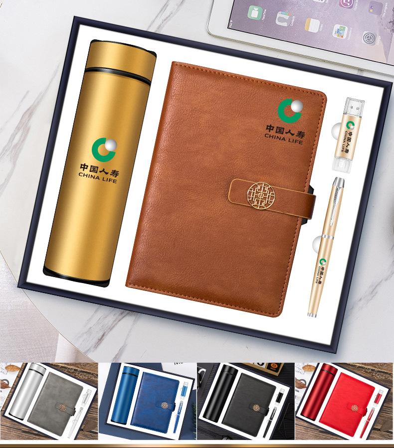 Guochao buckle temperature control cup round pen 16g mobile phone u disk four-piece set red with no. 2 blue box