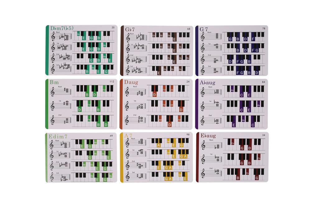 4. Juego Completo de Tarjetas Flash Codificadas por Color: Encuentra en la caja 100 acordes de piano para principiantes, incluyendo los 10 acordes de piano más frecuentes para cada tonalidad, notas de piano e inversiones de acordes. Las 12 tonalidades están codificadas por color para facilitar la identificación.