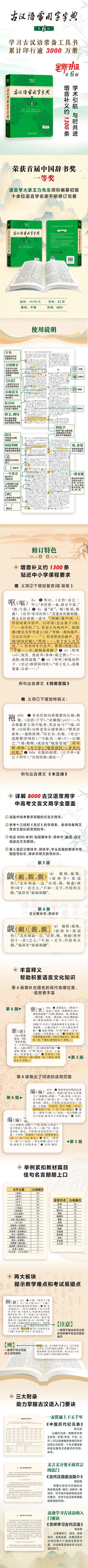 El Diccionario de Caracteres de Uso Común en Chino Antiguo fue compilado por más de diez expertos y académicos, incluidos los lingüistas Wang Li, Cen Linxiang, Lin Tao, Dai Li, Tang Zuofan y Jiang Shaoyu. Es un libro de referencia permanente para aprender chino antiguo. Este libro contiene más de 8,000 caracteres de uso común en chino antiguo, así como caracteres difíciles y palabras bisílabas, sumando más de 10,000 entradas; las explicaciones, pronunciaciones y ejemplos son precisos, y los ejemplos difíciles van acompañados de anotaciones y explicaciones; hay contenidos especiales de "Nota" y "Análisis" para proporcionar indicaciones y análisis para caracteres y palabras difíciles; los apéndices incluyen "Tabla de Épocas Históricas de China", "Introducción a la Gramática del Chino Antiguo" y "Cómo Aprender Chino Antiguo". Este libro es la 6ª edición. Sobre la base de la 5ª edición, se han añadido y eliminado algunos encabezados de caracteres individuales, se han añadido algunos elementos comunes de pronunciación y significado, se han cambiado algunos ejemplos y se han mejorado la pronunciación y las explicaciones de algunos elementos.