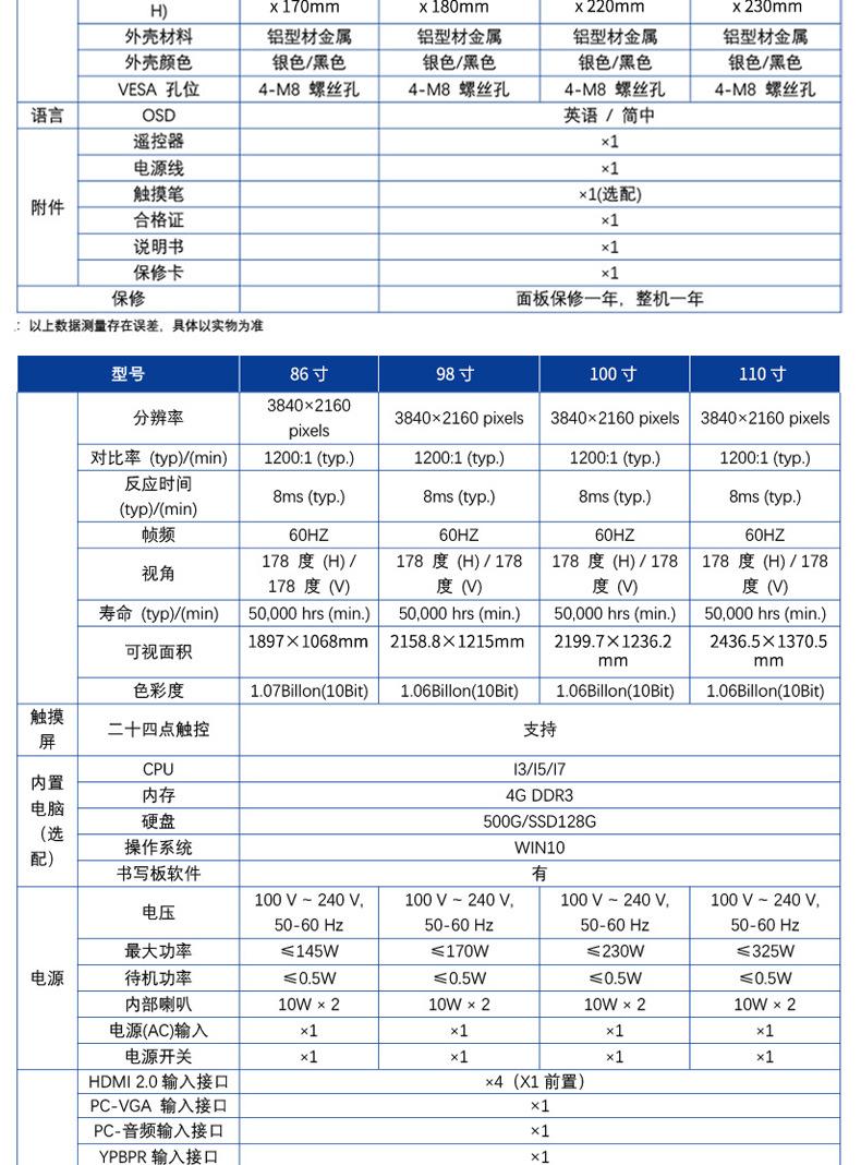 55 inches, 65 inches, 75 inches, 86 inches, 98 inches, 100 inches, 110 inches