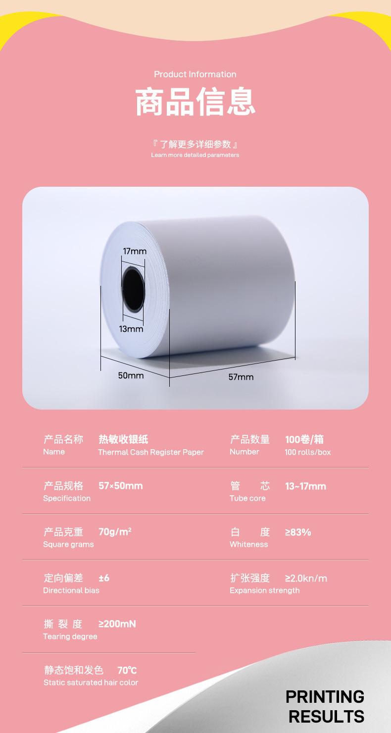 Papel térmico para cajero (57 x 50) Meituan, papel para impresión de comida para llevar, papel para recibos de supermercado (5750), papel para recibos de película con núcleo de tubo pequeño.
