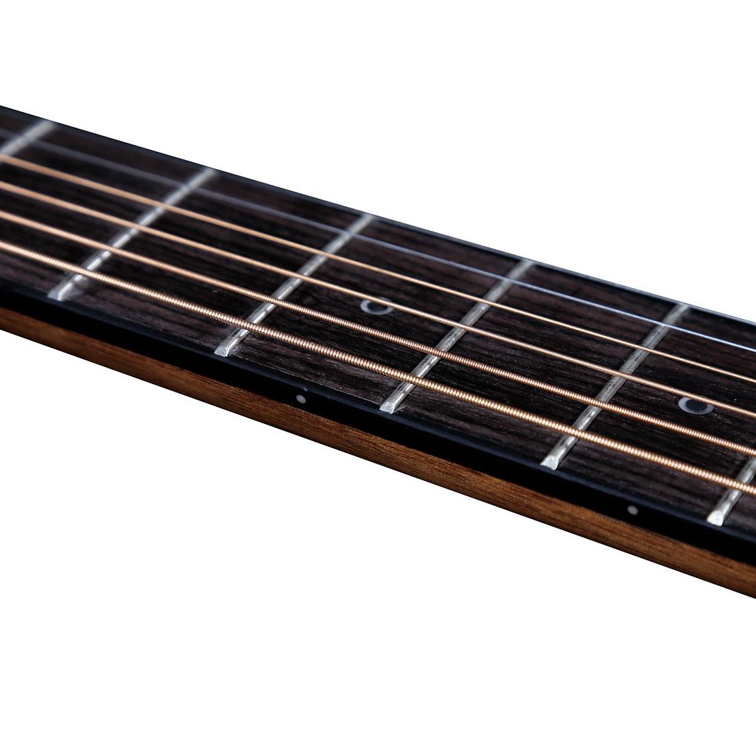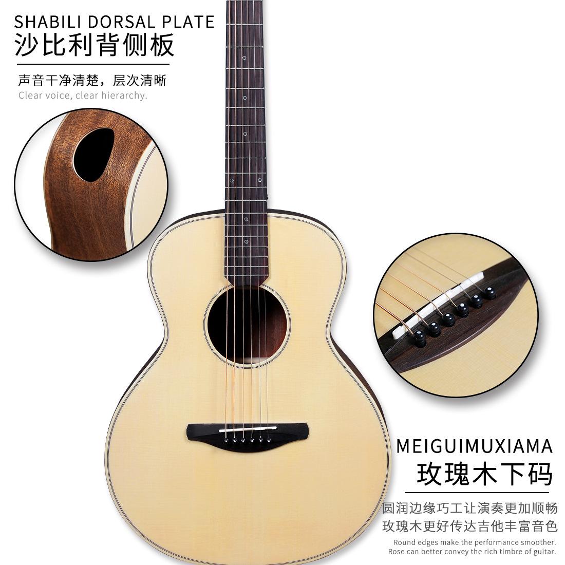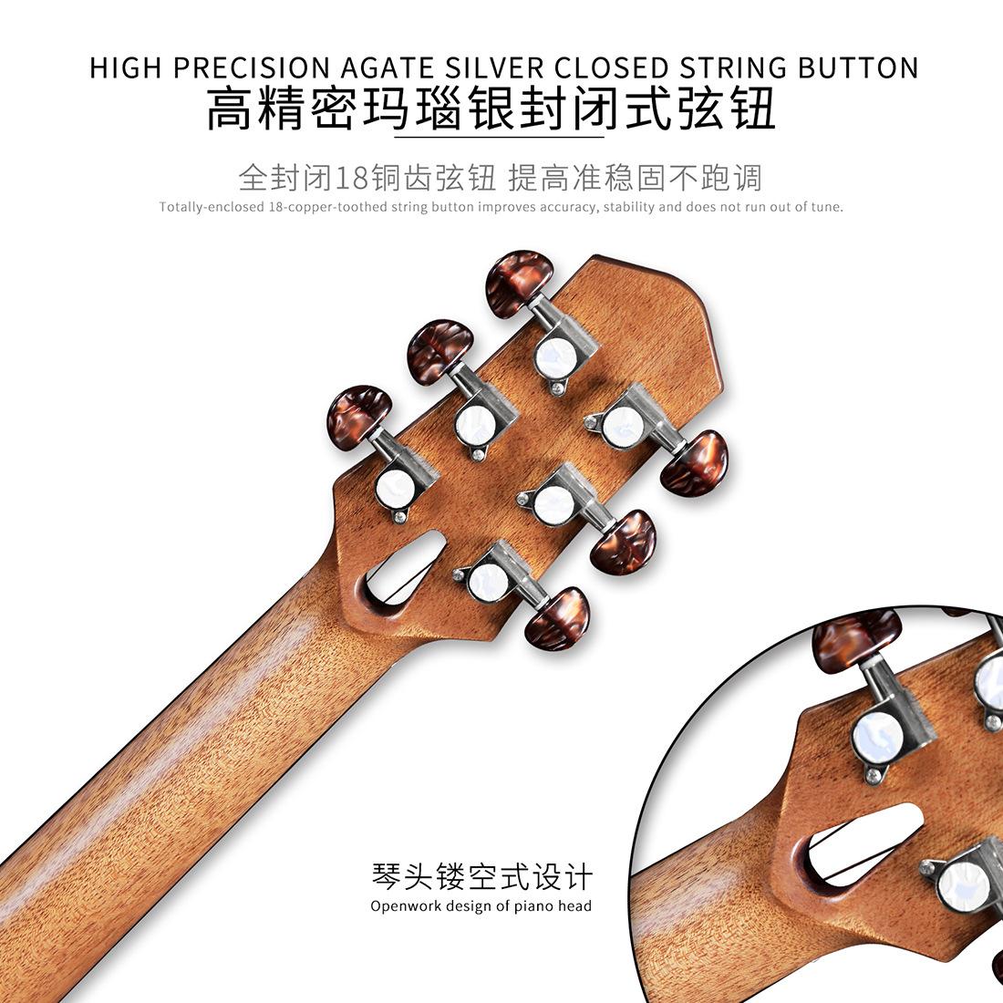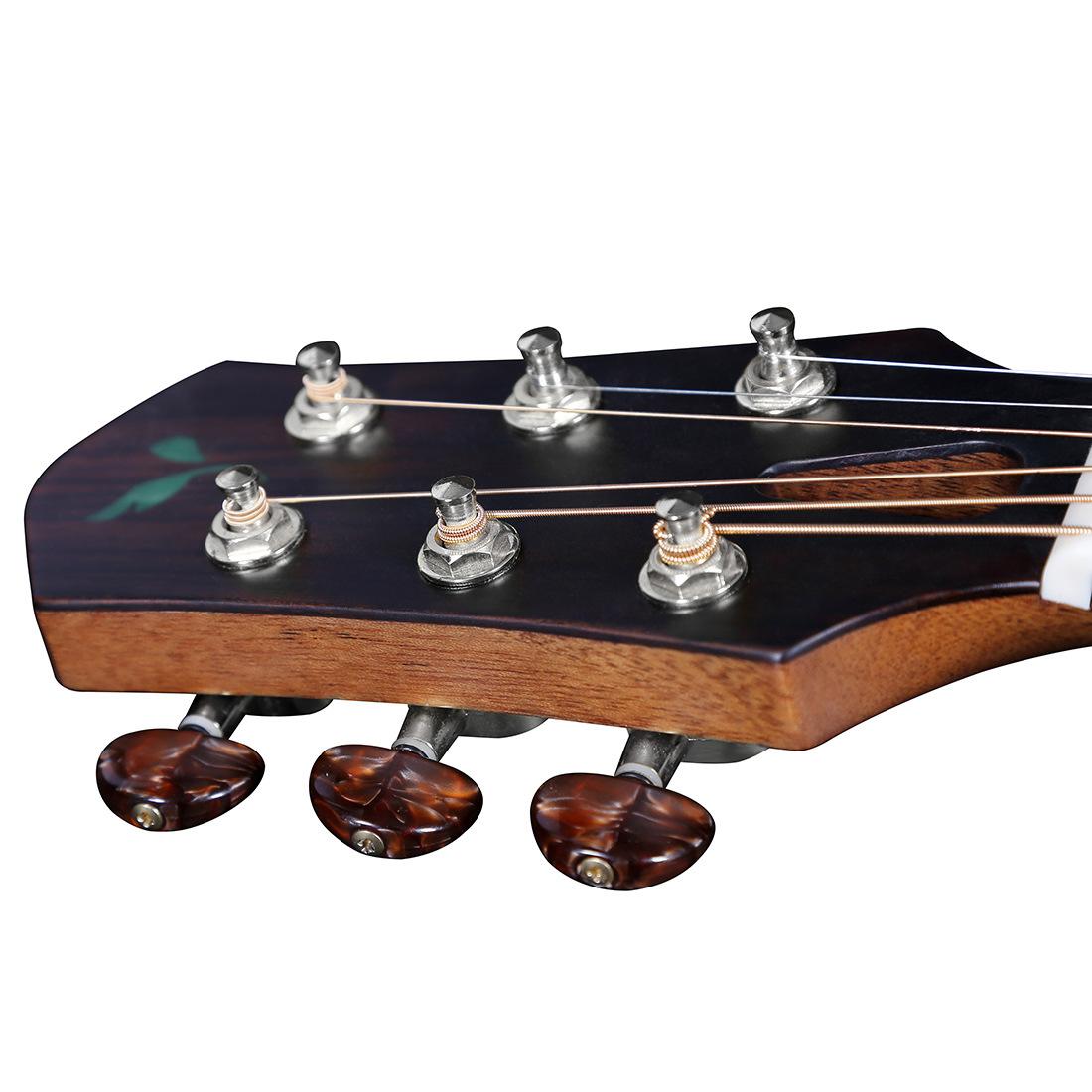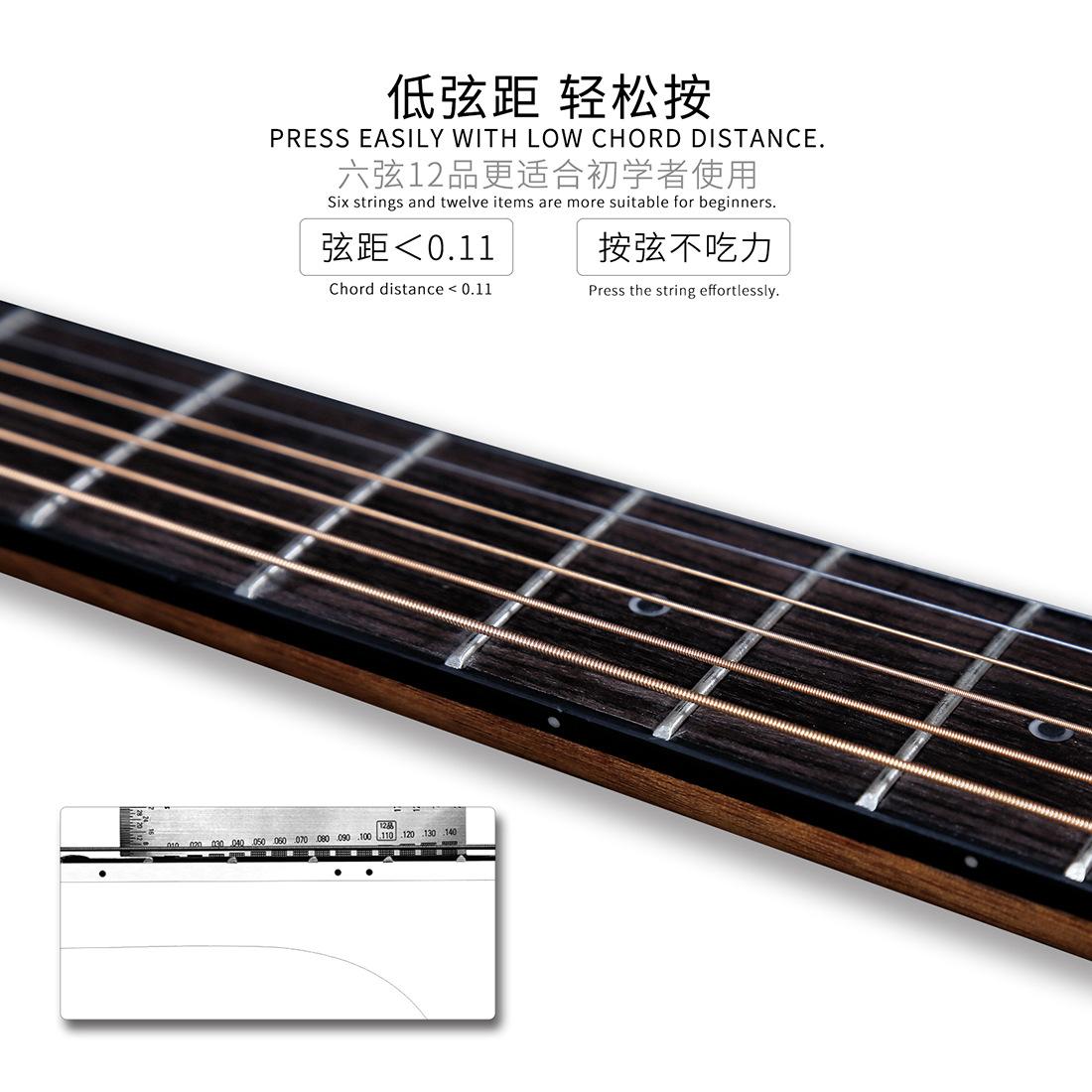 El palo de rosa puede transmitir mejor el tono rico de la guitarra; clavijeros cerrados de ágata plateada de alta precisión, clavijeros totalmente cerrados de 18 dientes de cobre mejoran la precisión y la estabilidad sin desafinarse; el espaciado bajo de las cuerdas es fácil de presionar, seis cuerdas y 12 trastes son más adecuados para principiantes, con una sensación diferente y buena, diseñados por muchos diseñadores para satisfacer