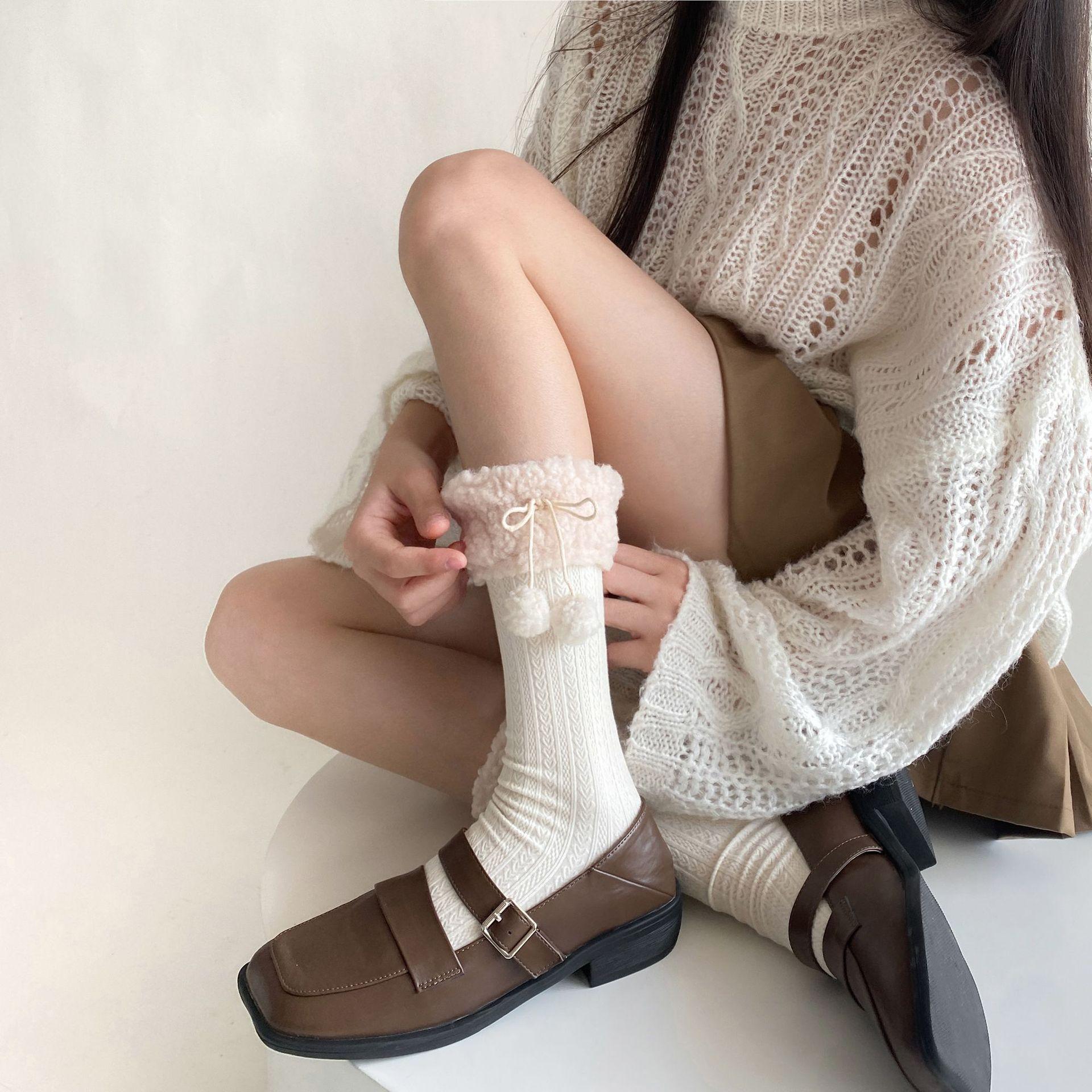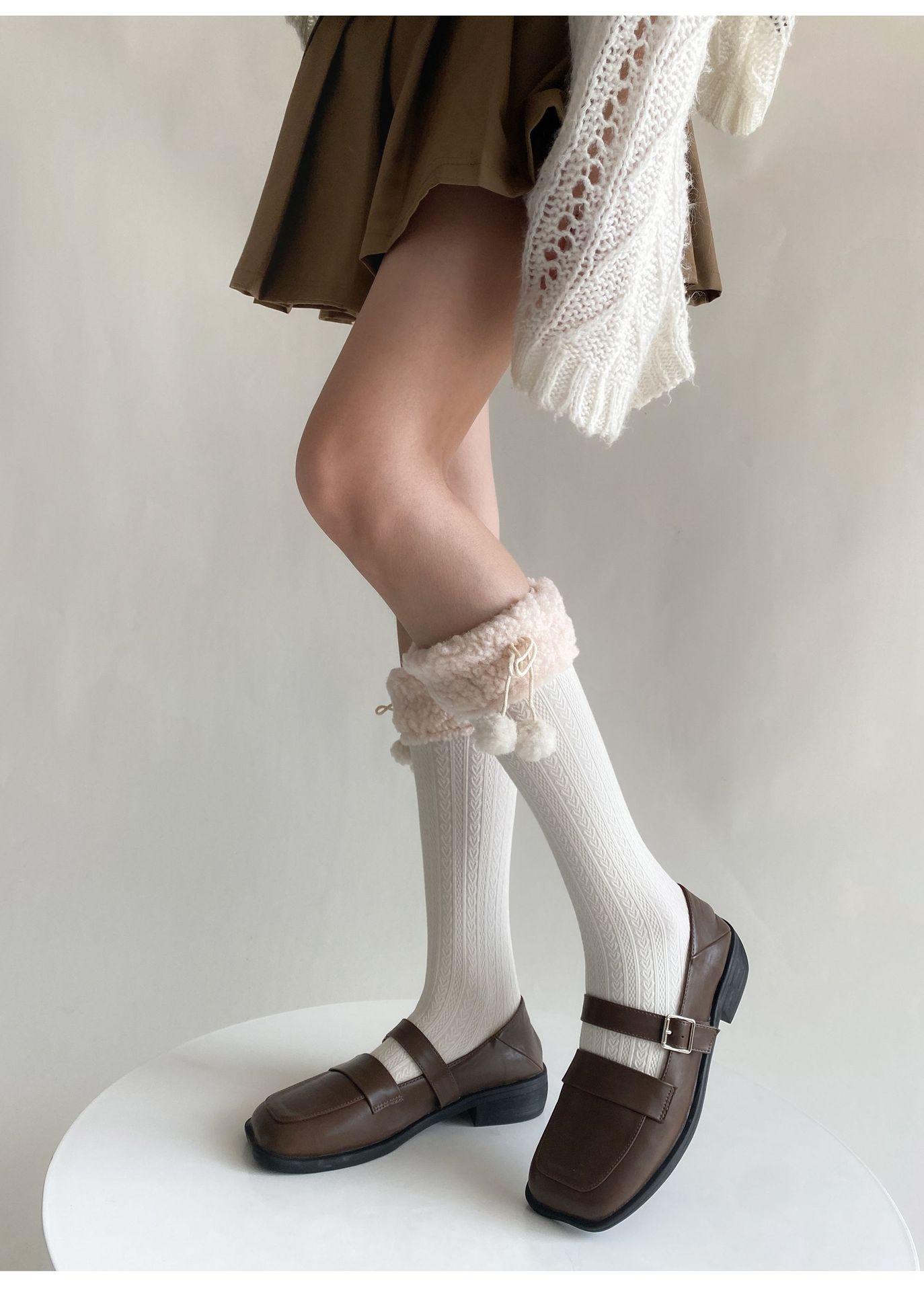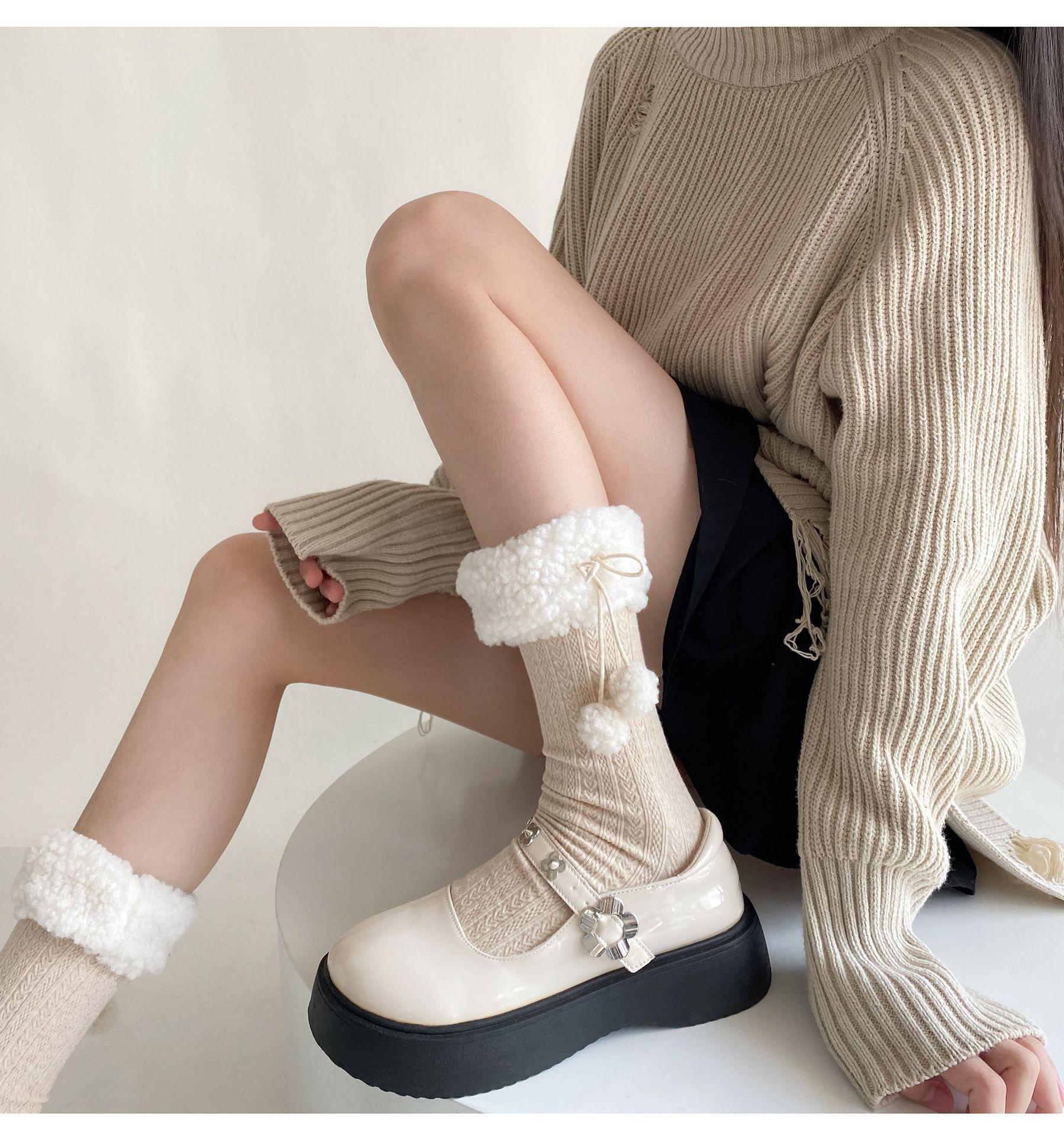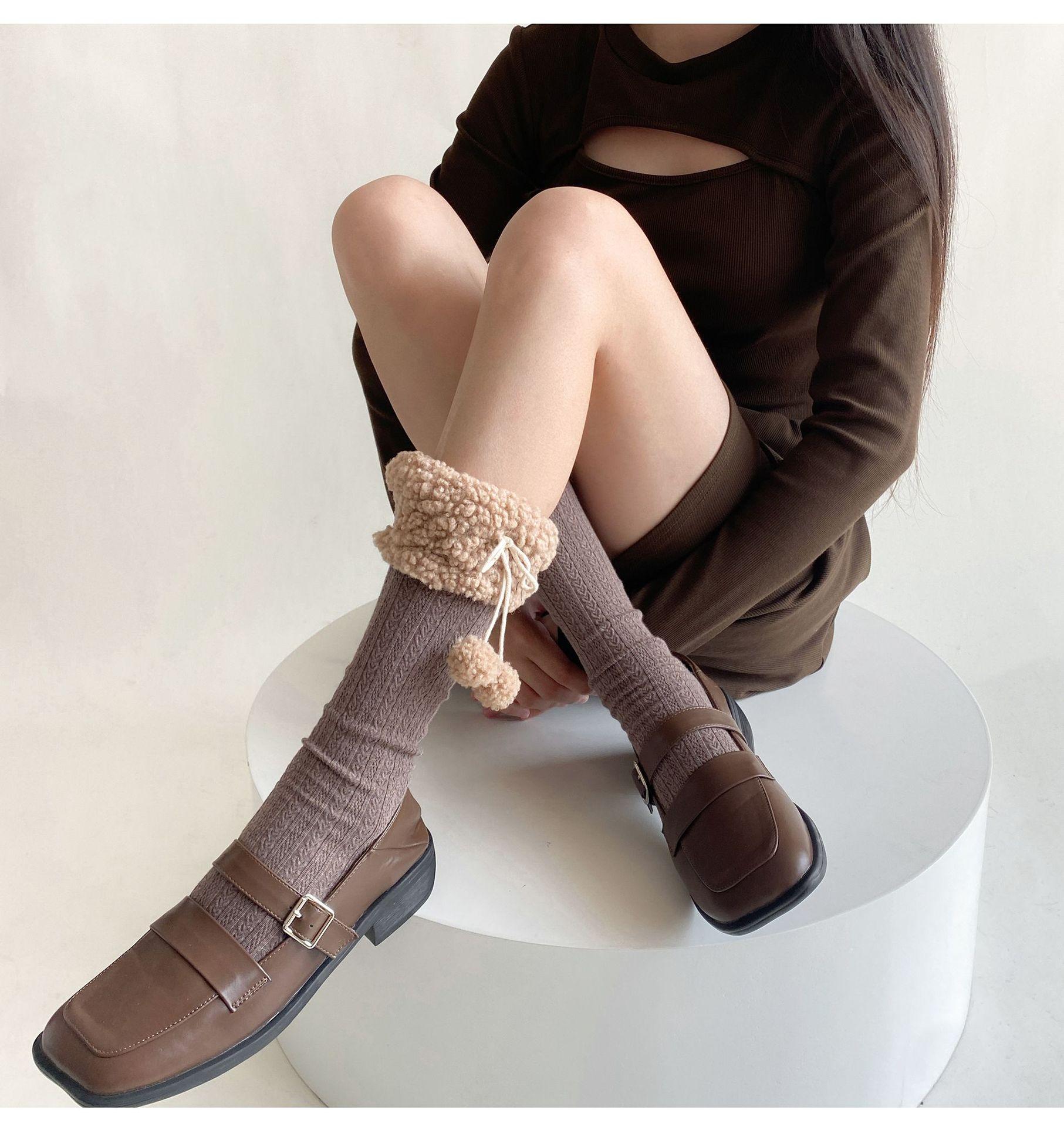Dulce lana de cordero encaje bola de pelo calcetines encantadores hasta la pantorrilla Marrón otoño e invierno calcetines de felpa hasta media pantorrilla calcetines japoneses para pierna de niña