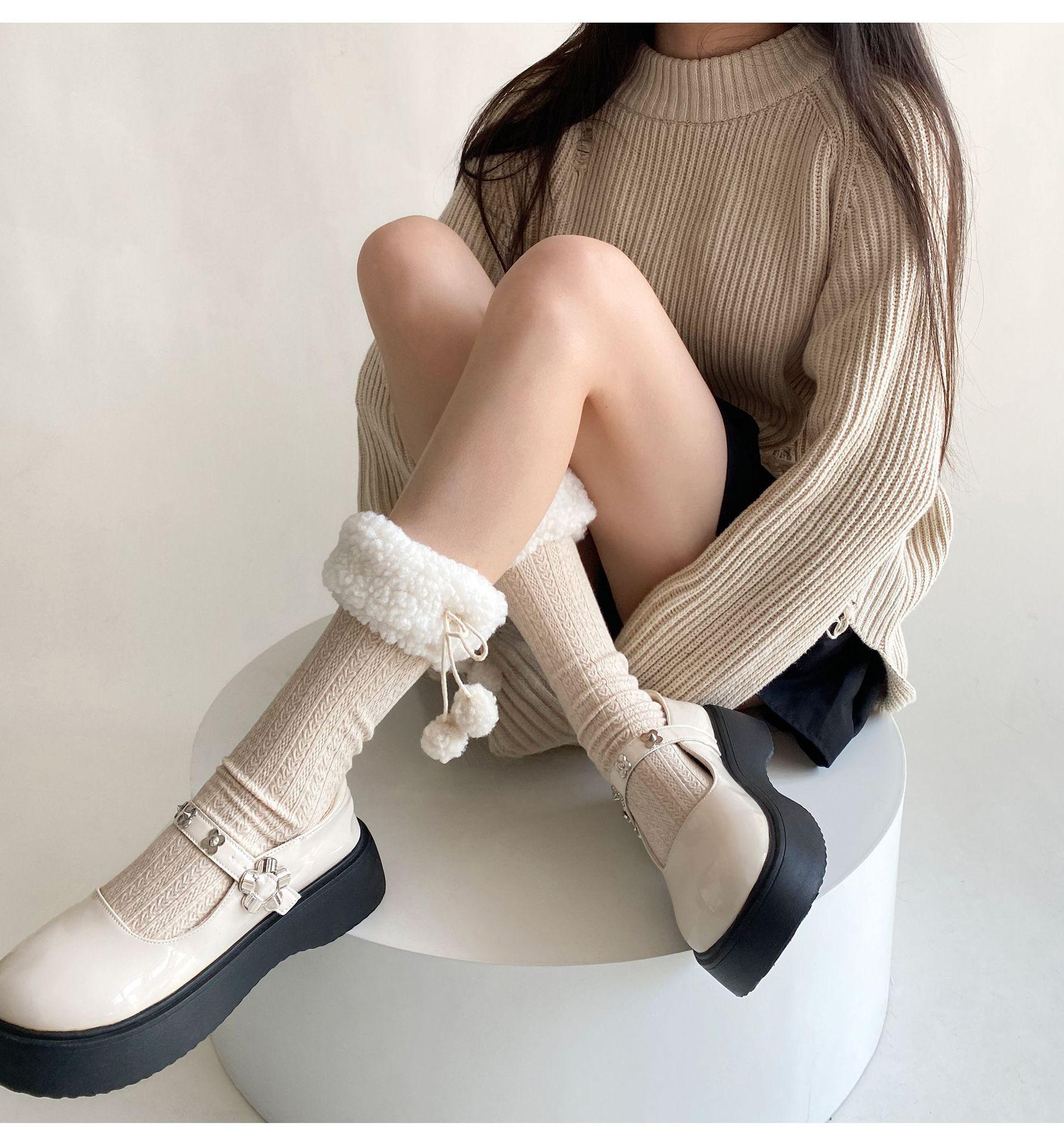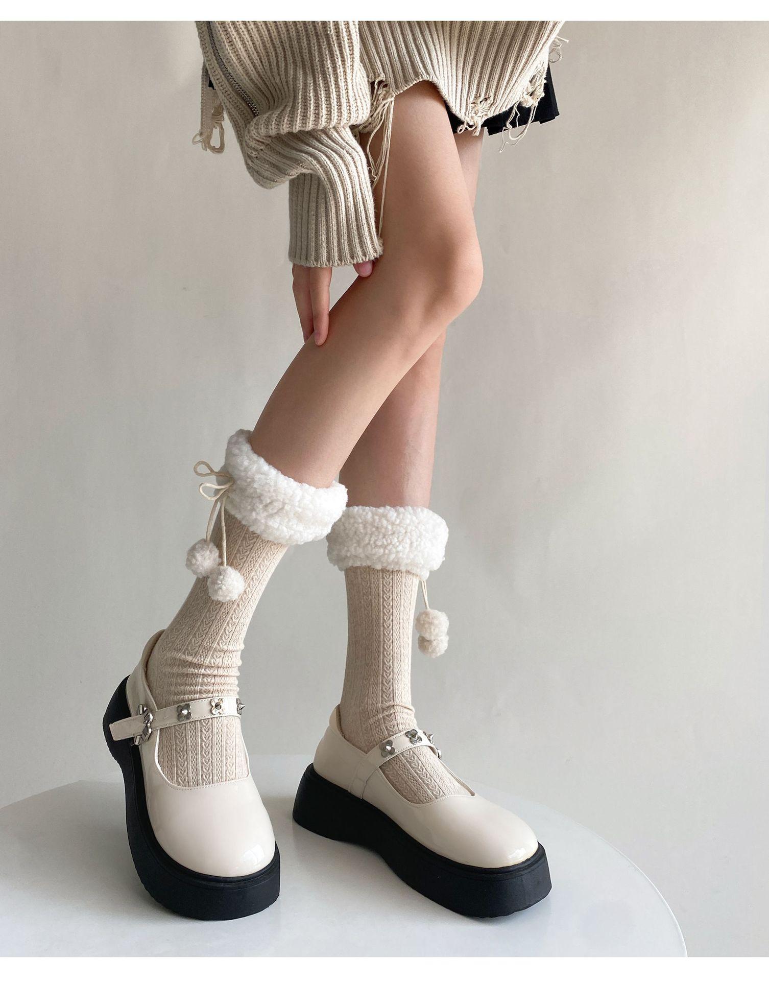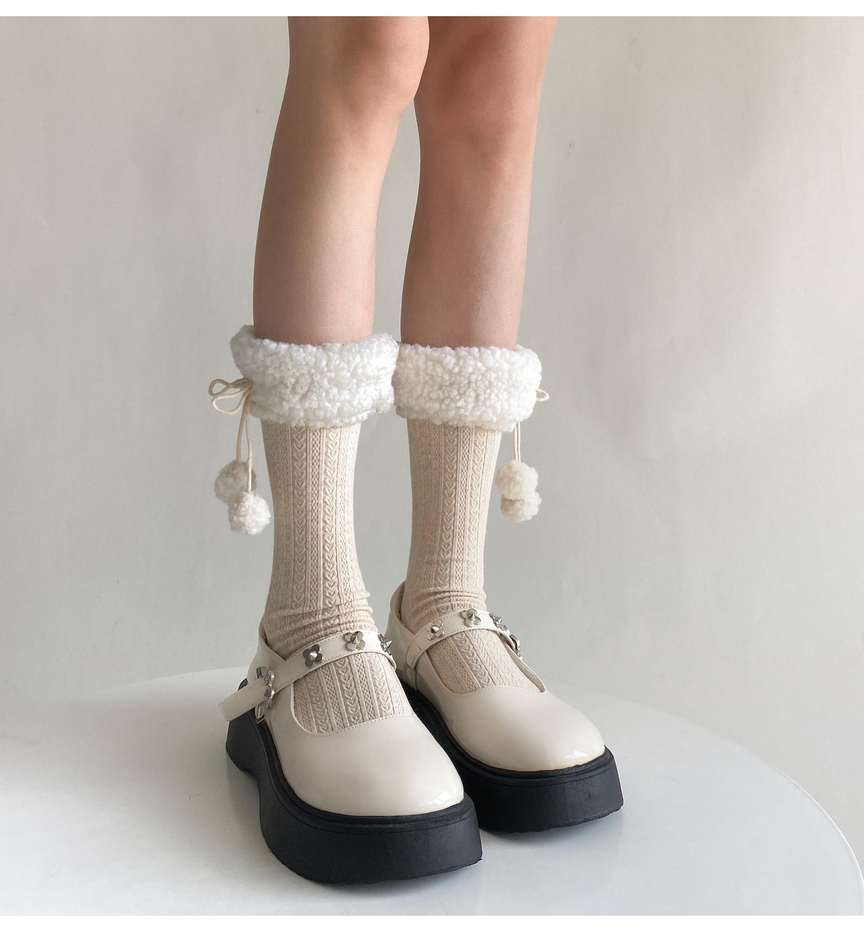 Dulce lana de cordero encaje bola de pelo calcetines encantadores hasta la pantorrilla Marrón otoño e invierno calcetines de felpa hasta media pantorrilla calcetines japoneses para pierna de niña