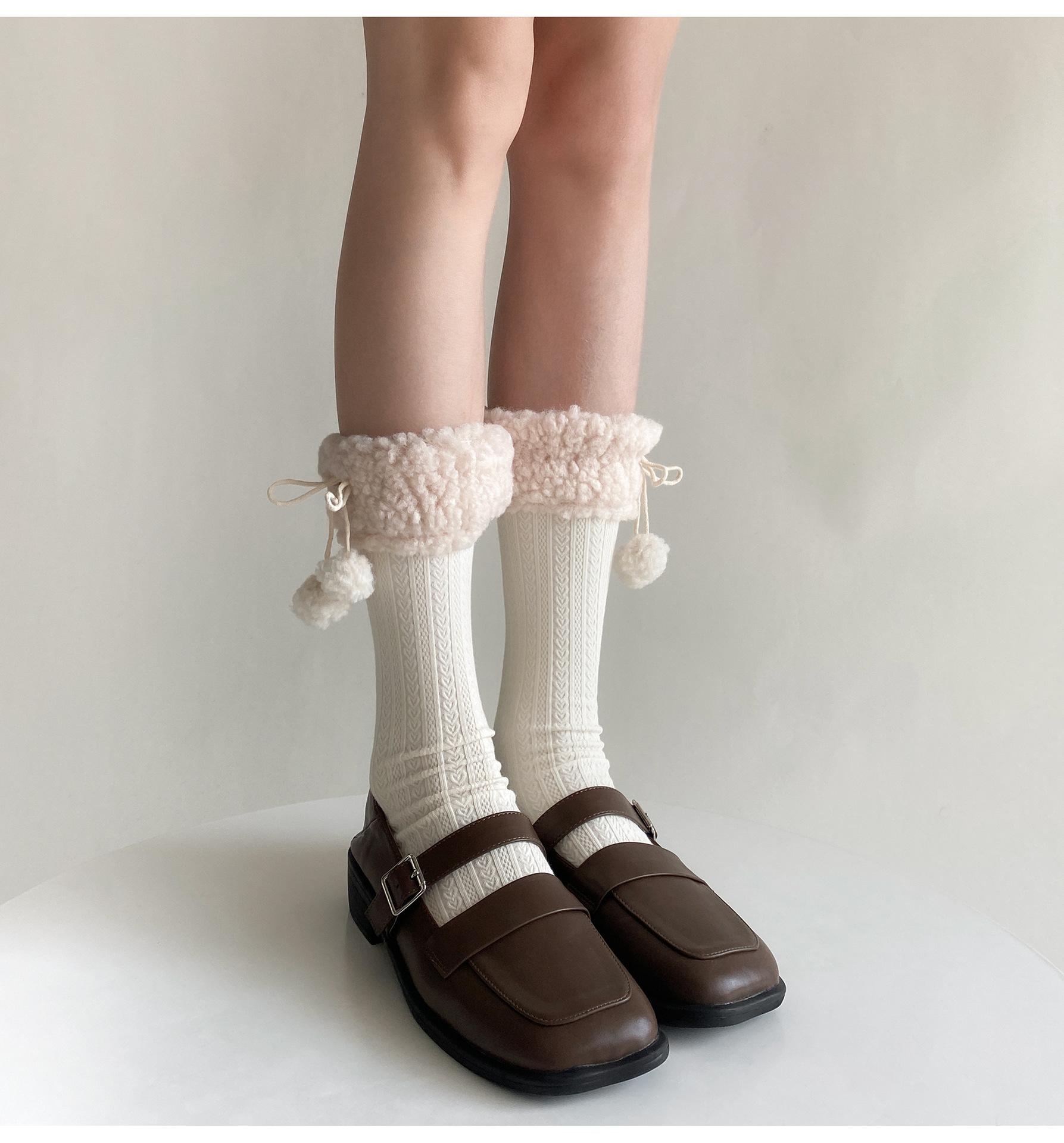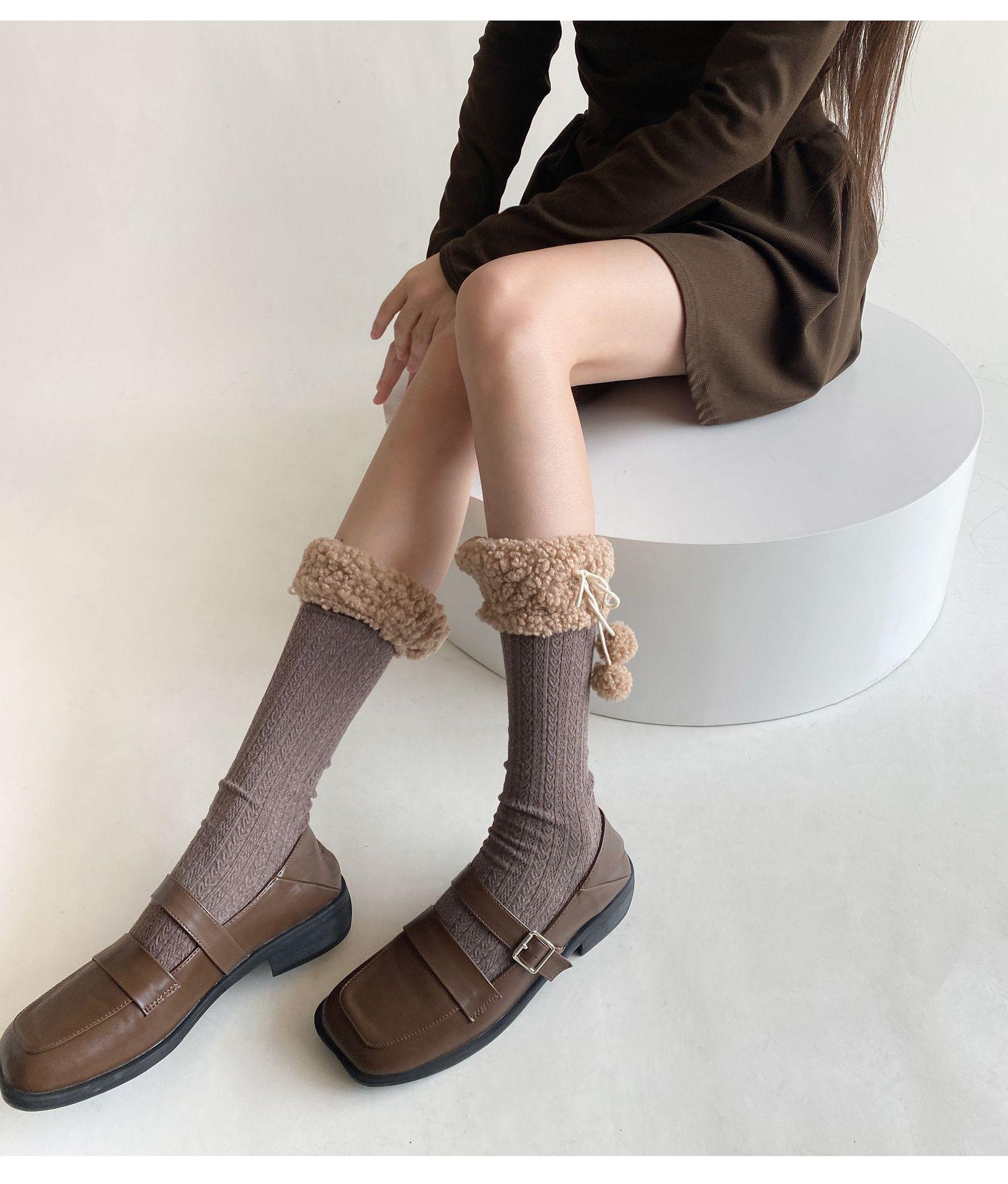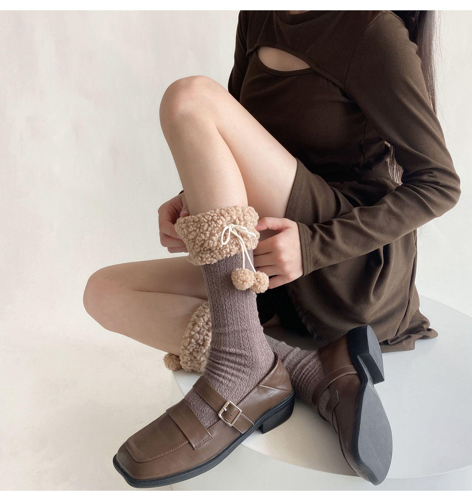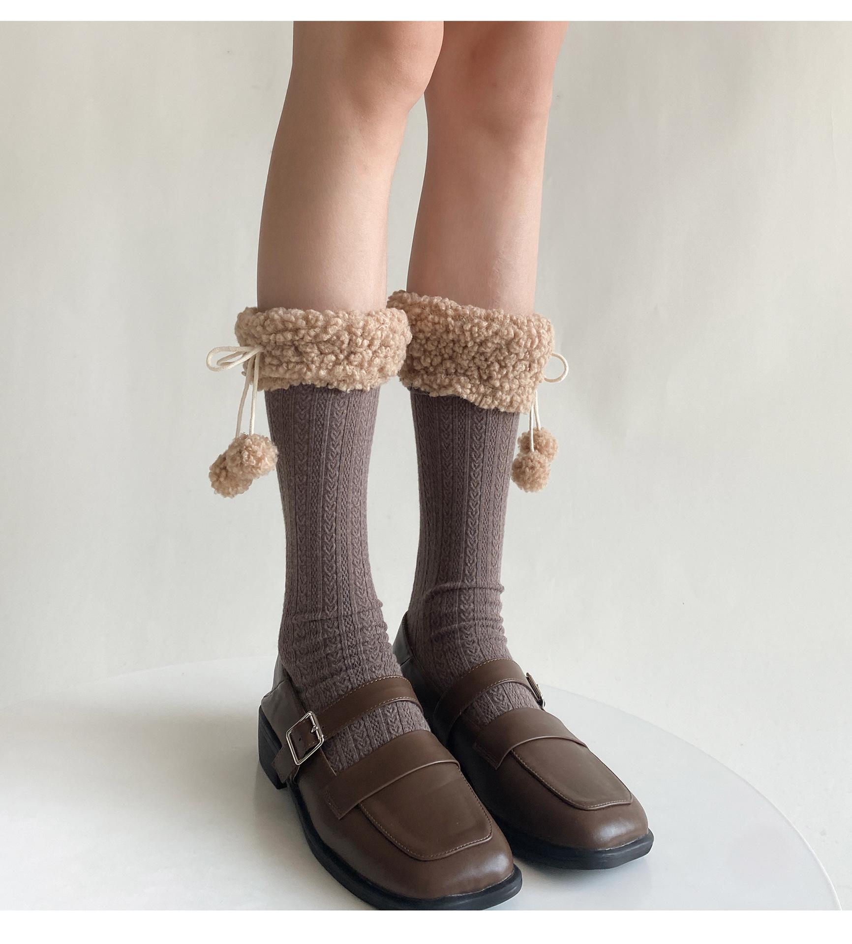 Compra Dulce lana de cordero encaje bola de pelo calcetines encantadores hasta la pantorrilla Marrón otoño e invierno calcetines de felpa hasta media pantorrilla calcetines japoneses para pierna de niña al por mayor en Joom.pro