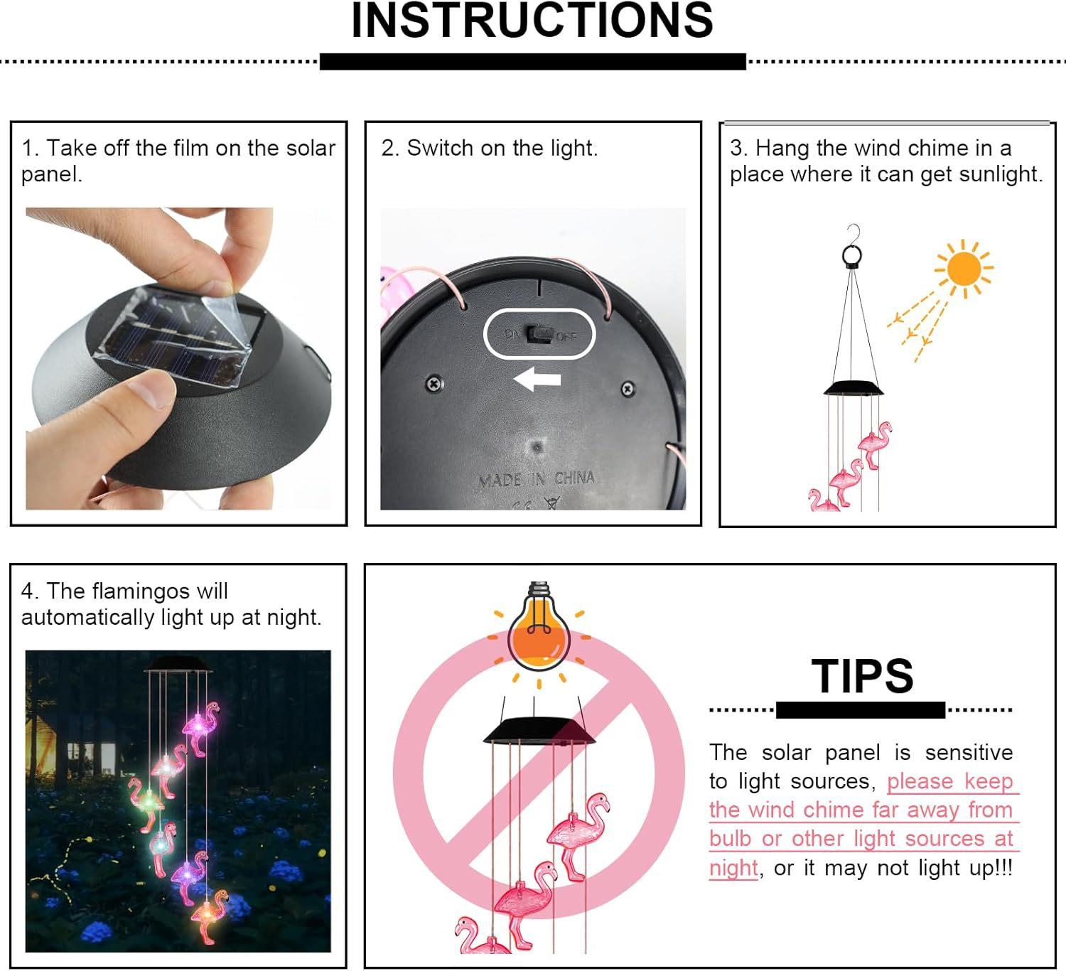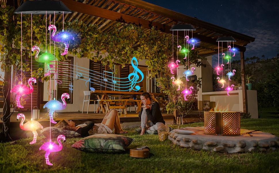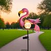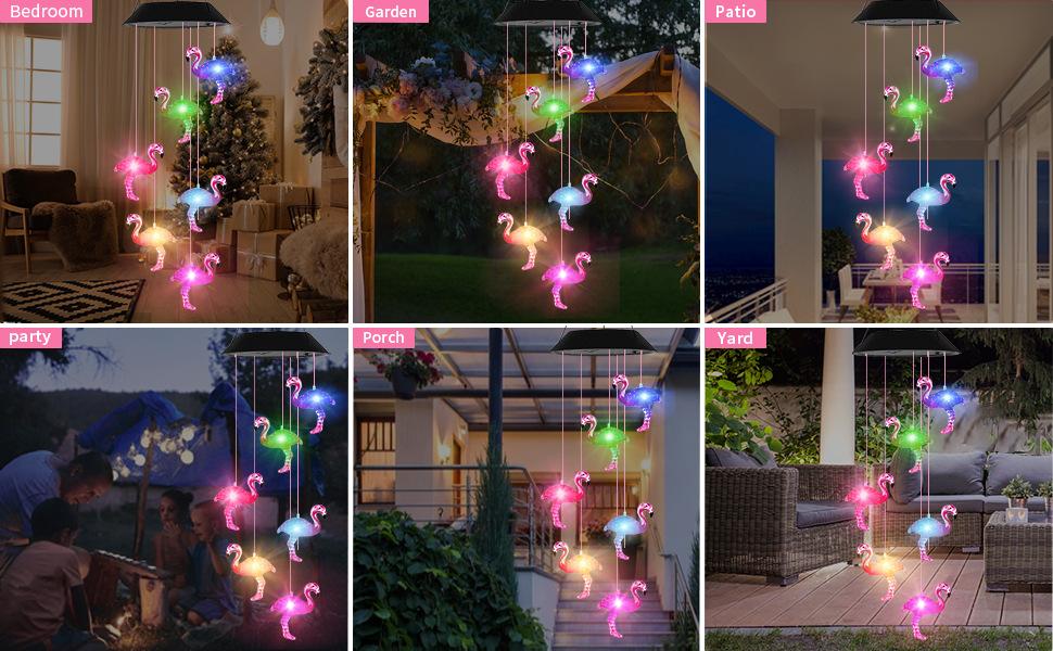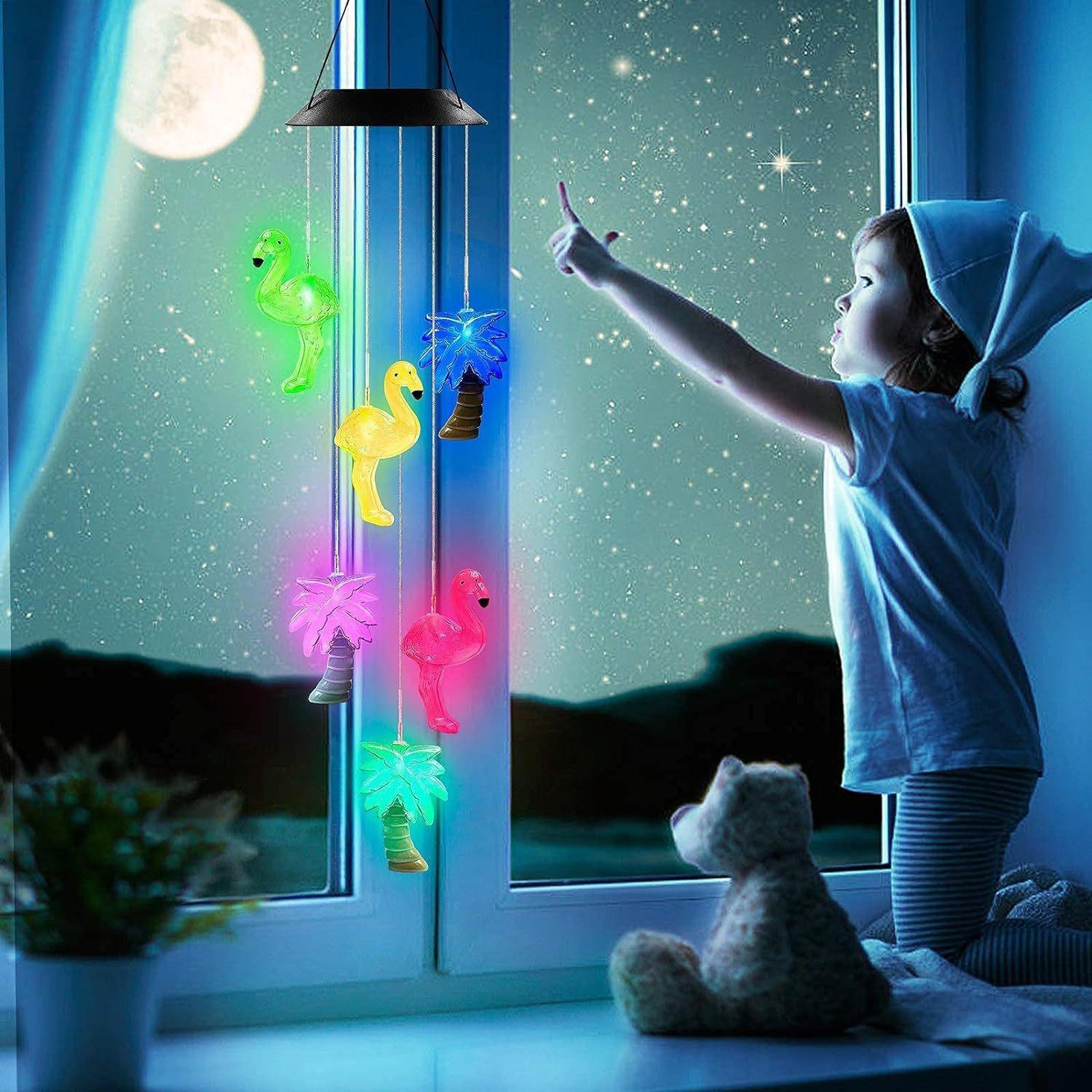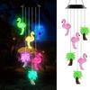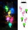Luz LED solar de campana de viento con forma de flamenco y cocotero, colorida y cambiante de color para exteriores.
