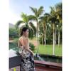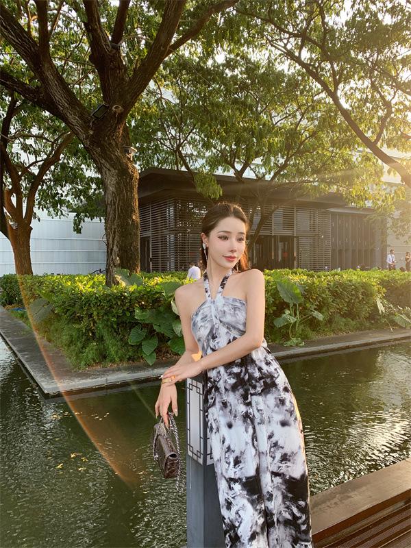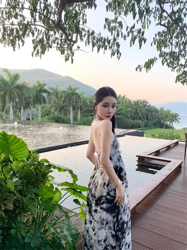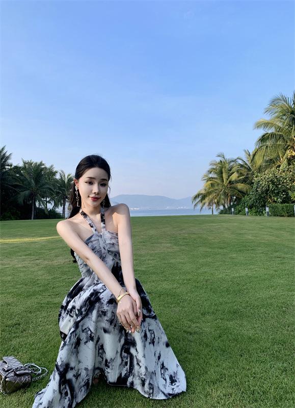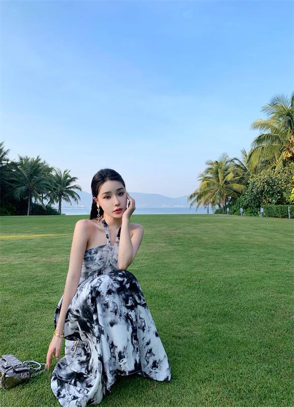 Compra Vestido colgante con cuello sin espalda y estampado de tinta francesa de tiro real 2025, falda de hada súper elegante para viajes junto al mar y vacaciones. al por mayor en Joom.pro