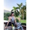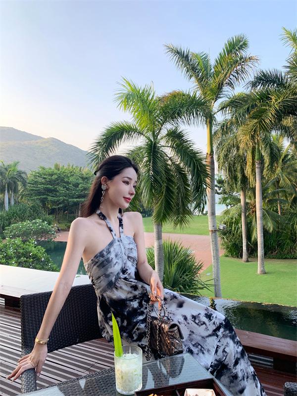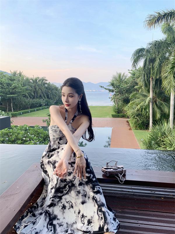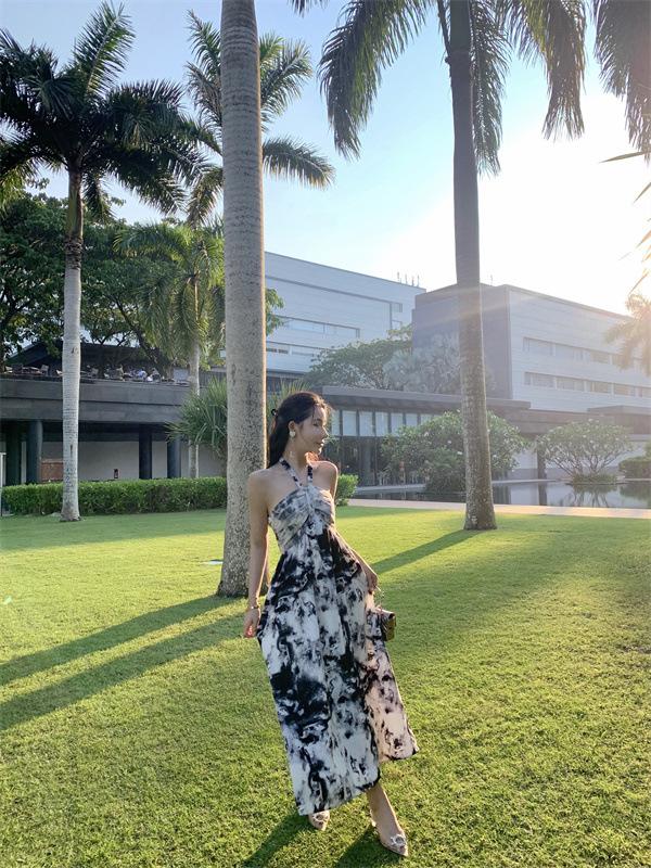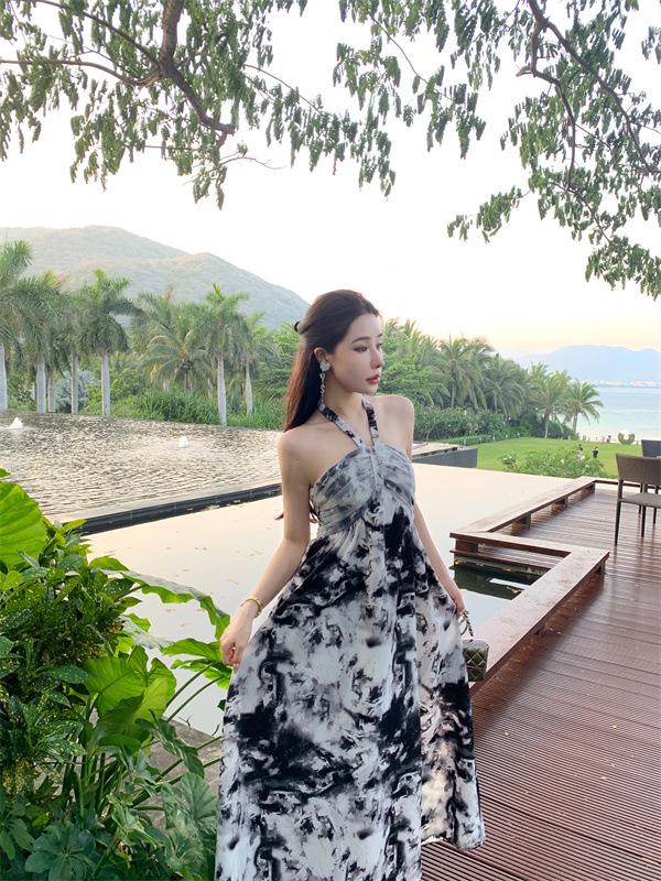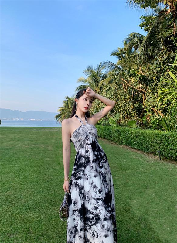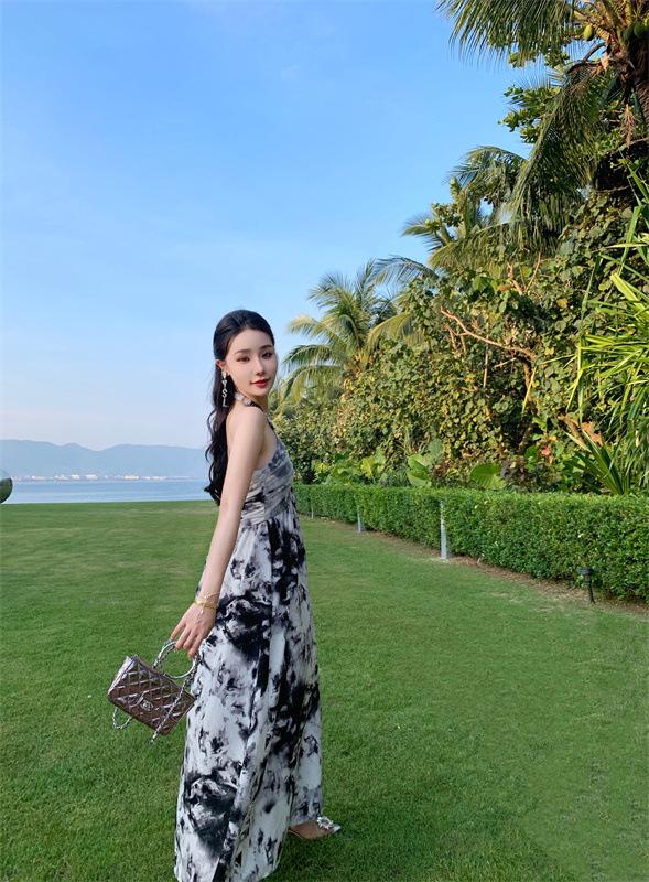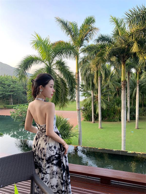 Vestido colgante con cuello sin espalda y estampado de tinta francesa de tiro real 2025, falda de hada súper elegante para viajes junto al mar y vacaciones.